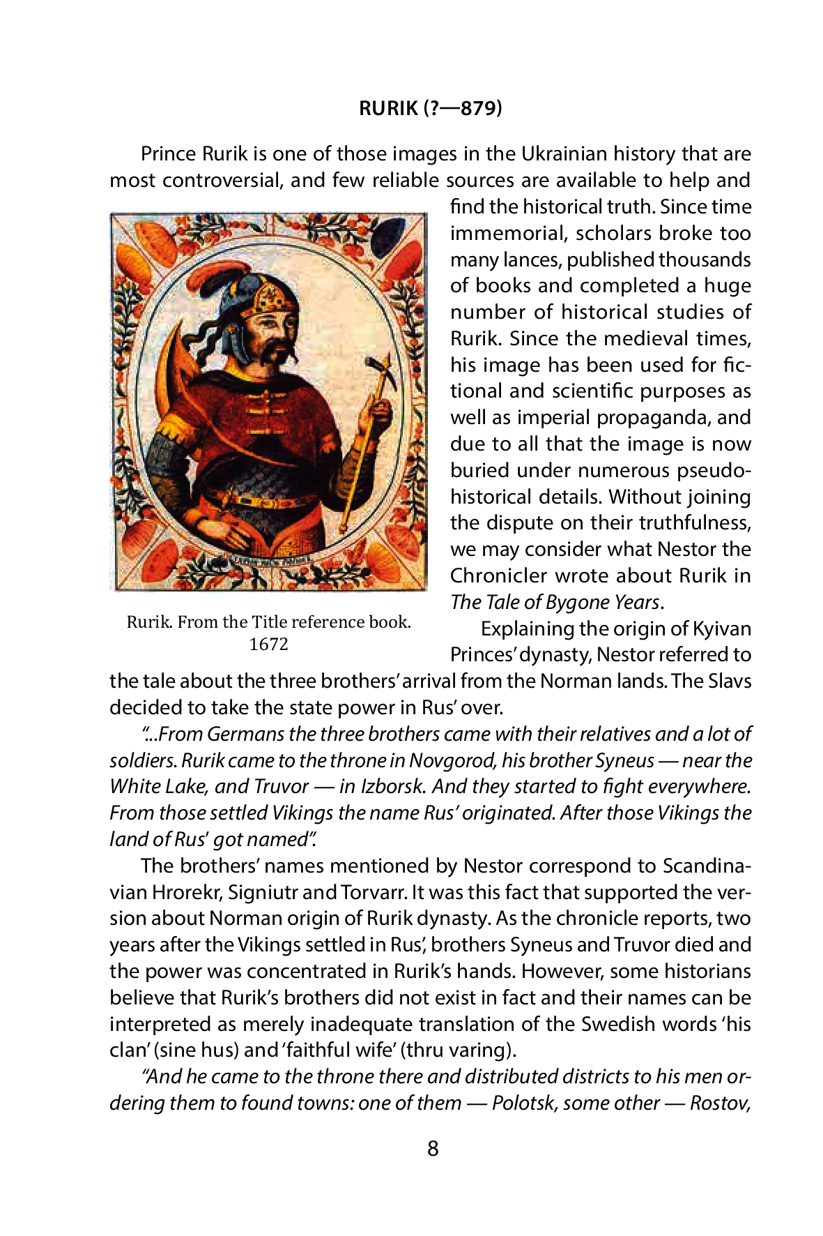 The book “100 Key Ukrainian Personalities” clearly shows that it was not only fight for independence and statehood that has determined the course of the country’s history. Ukraine has presented the world with a lot of talented people — physicists, thinkers, architects, microbiologists, and writers. Many of the readers will discover new names here or learn more about those whom they heard of. This edition does not in any way pretend to tell you about all the prominent Ukrainians — rulers and poets, warriors and actors, politicians and scientists — those who throughout centuries have been glorifying our country, building its statehood foundations, developing its language, culture and science. This is that intangible which makes us all feel as the citizens of our own country. This book presents the stories about a small number of persons who deserve to be remembered by our people, since each of them has left an indelible mark in the history of Ukraine.