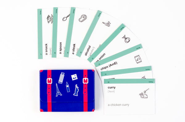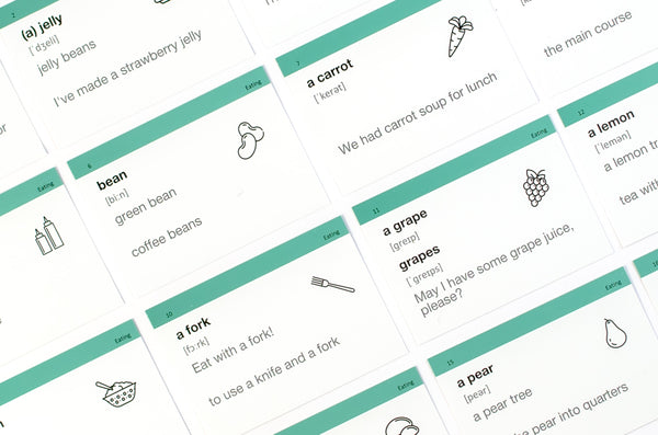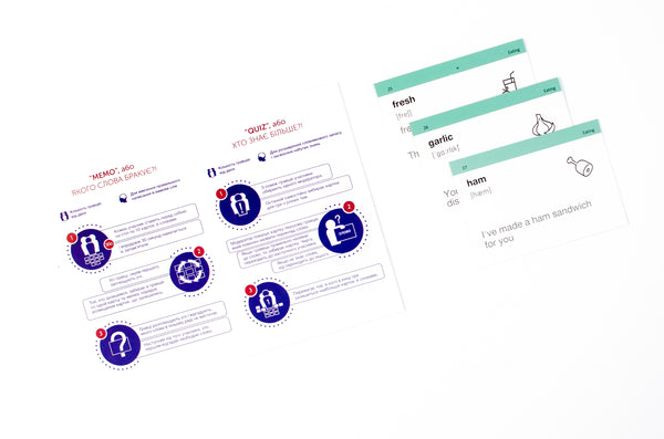 Це спеціальні друковані картки, на одній стороні яких є слова, а на іншій — переклад, транскрипція і ситуативне застосування. Всього карток - 500 шт, слів близько 800, розділені слова за 30-ма темами, які найбільш поширені на рівні вивчення англійської А2.