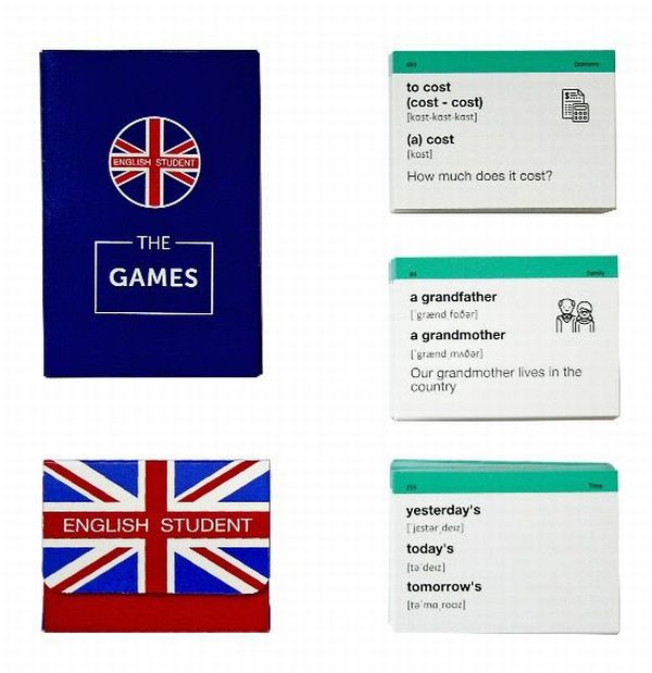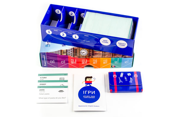 До набору входить: • 500 карток з англійськими словами та прикладами їх вживання (600-700 слів). На кожній картці є слово, транскрипція та приклад його вживання. А також невелике зображення для асоціативного запам’ятовування. На звороті — переклад. • коробка для навчання методом інтервальних повторень. Цей метод допомагає засвоїти понад 95% інформації • дорожній футляр для зручного користування впродовж дня • збірка ігор для інтерактивного навчання для двох, трьох та більше осіб