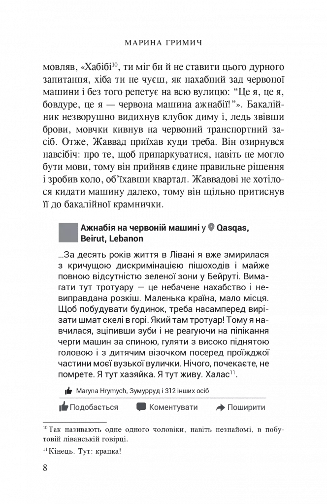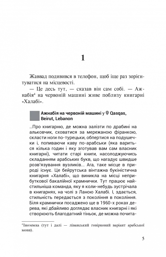 Словом «ажнабія» називають в арабських країнах іноземок. Дія роману Марини Гримич відбувається в сучасному Лівані, відомому своїм міжконфесійним розмаїттям, і перегукується з середньовічними арабськими оповідками з «Тисячі й однієї ночі». В центрі сюжету опиняються дві ажнабії-українки — Павлина, заміжня за сунітом Ахмадом, та Віра (лагідно — Вірунчик), дружина шиїта Жаввада. Павлина береться допомогти Жавваду порозумітися з дружиною, однак та несподівано зникає, і в пошуках Вірунчика Ахмад, Жаввад, Павлина, а також таємничий дуруз Зіяд, що несподівано приєднався до компанії, об’їжджають червоною машиною увесь Ліван. Книга пронизана делікатним гумором, який допомагає уявити специфіку міжетнічних шлюбів на Близькому Сході і розкрити секрети міжконфесійного та міжкультурного порозуміння.