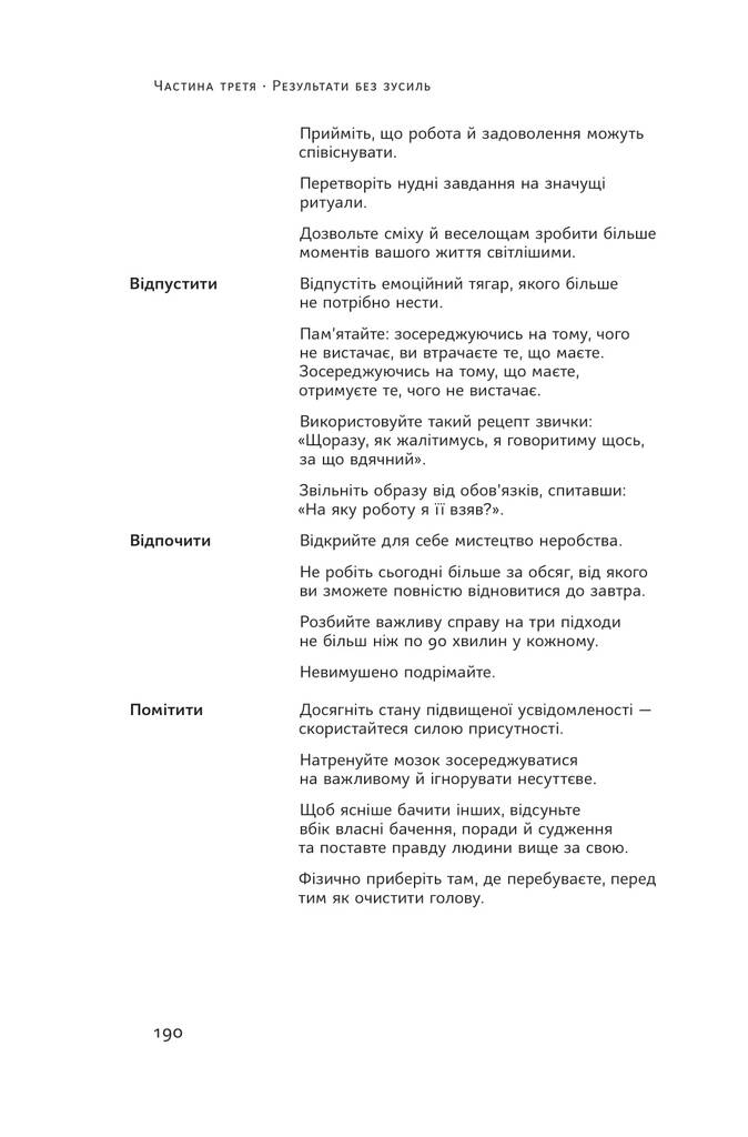 Автор пропонує практичні поради для того щоб зробити найважливіші дії найлегшими, так щоб ви змогли досягти бажаного результату без вигорання.