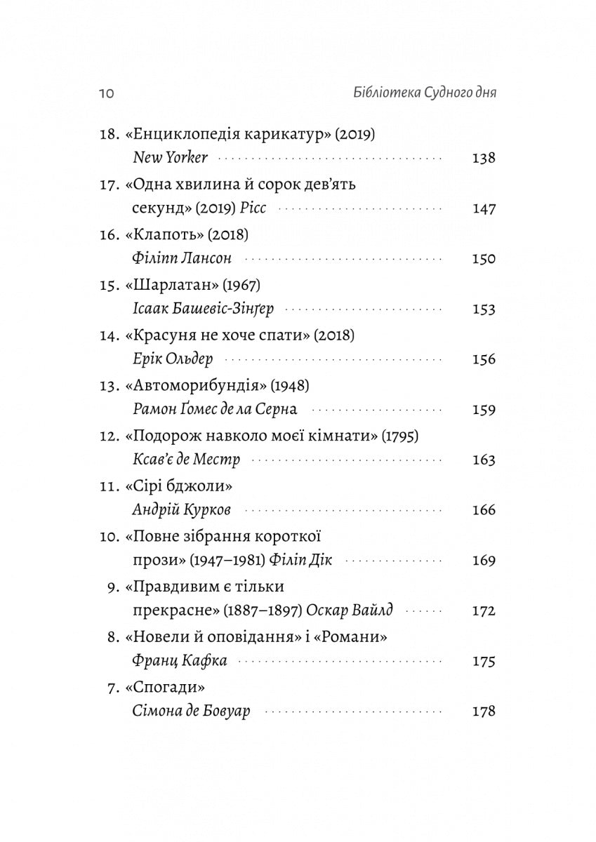 Справжню літературу не можна очистити або цензурувати. Найкращі книжки часто непристойні, відразливі, образливі. Вони викривають те, що суспільство старанно приховує, розкривають темні сторони людської природи, показують прекрасне на межі з відразливим. Хороші книжки досліджують межі, виходять за межі і порушують табу. Але передовсім — втручаються в те, що їх не стосується. У цій книжці Фредерік Беґбедер створює власний літературний пантеон із п’ятдесяти головних книг свого життя. Тут поряд із Філіпом Ротом можна зустріти Сімону де Бовуар, а поруч із Томасом Манном — Андрія Куркова. Це не просто черговий топ найкращих книжок, це справжній маніфест літератури в її найсвітлішій і найтемнішій формі водночас. Чому варто прочитати книжку «Бібліотека Судного дня»? Містить 50 есе про улюблених письменників і їхні книжки від зірки французької літератури Фредеріка Беґбедера — від Колетт до Сімони де Бовуар та Віржині Депант, від Томаса Манна до Андрія Куркова, від Оскара Вайлда до Октава Мірбо. Маніфест літератури в її найчистішій і одночасно найбруднішій формах. Читачі назвали книгу «безвідмовними ліками проти похмілля» в наш час.
