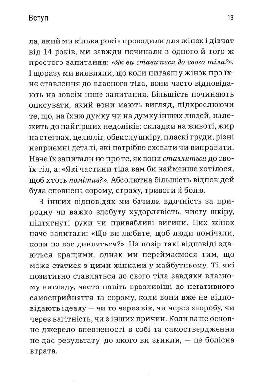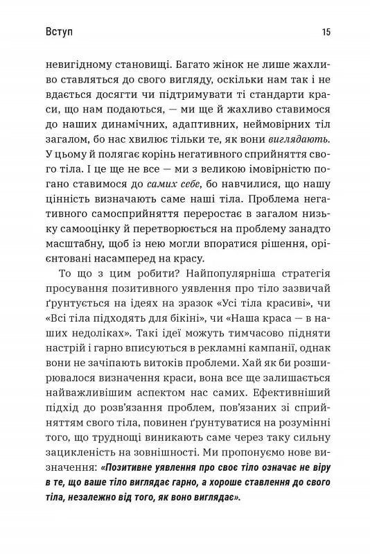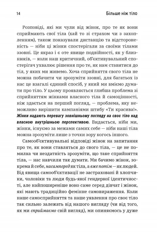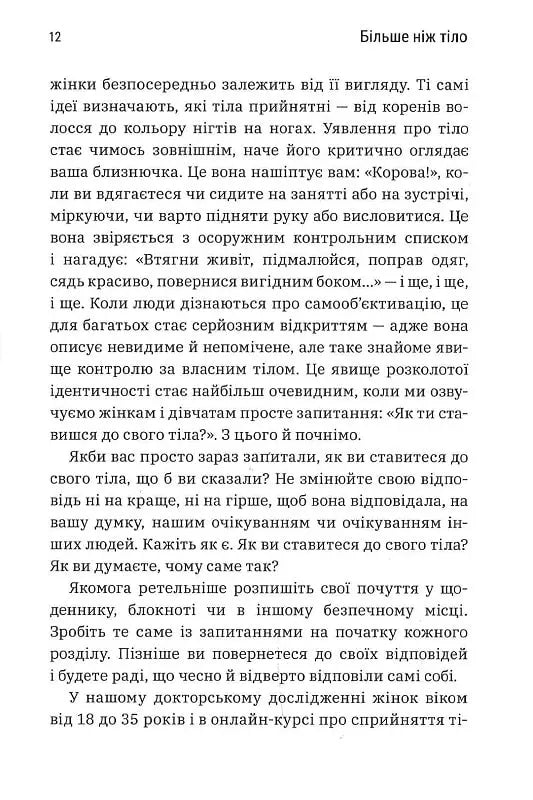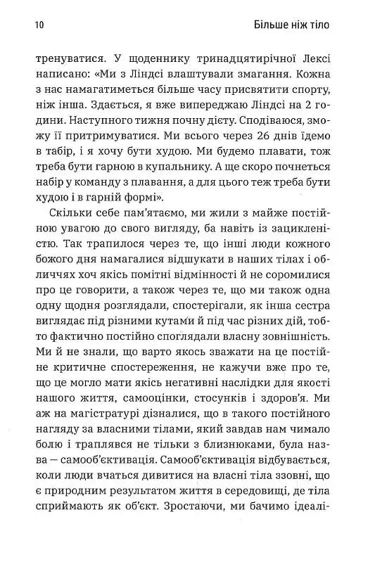 Позитивне уявлення про своє тіло — це не віра в те, що ваше тіло гарне, а хороше ставлення до нього незалежно від його вигляду. Наш одержимий красою світ всіляко просуває ідею, що щастя, здоров’я й те, як ставитимуться до вас люди, залежить від нашої зовнішності. Але сестри-близнючки, докторки Лексі та Ліндсі Кайт, пропонують альтернативне бачення. У своїй книзі «Більше ніж тіло. Ваше тіло — знаряддя, а не прикраса» авторки діляться потужними практичними порадами, які виходять за рамки «бодипозитиву», детально аналізуючи різноманітні фактори впливу: від медіаспоживання до здоров’я і фітнесу, саморефлексії та співчуття до себе. Сестри Кайт демонструють, наскільки згубним може бути вплив самооб’єктивації на наше повсякденне життя. Це ідеальна книжка для тих, хто хоче змінити своє самосприйняття, але не знає, з чого почати.