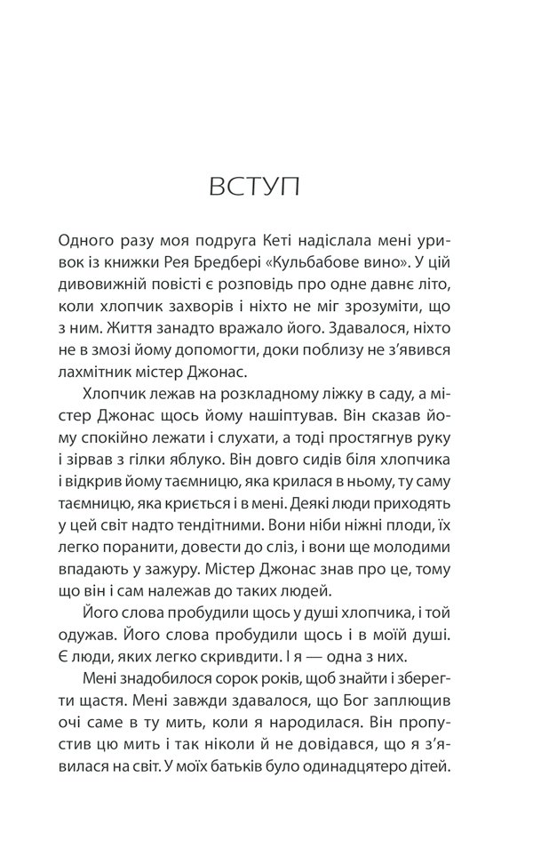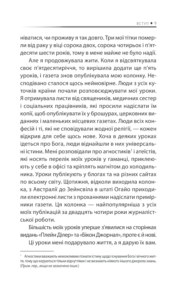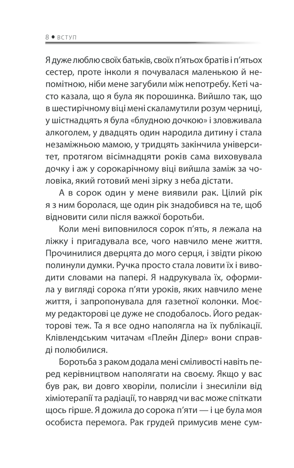 У цій книжці Регіна Бретт перетворила 50 уроків на глибоко особисті, зворушливі, іноді смішні есе. Добра, мудра, дуже емоційна книжка змусить читачів замислитися над своїм життям, зробити його кращим, допоможе знайти й утримати щастя.