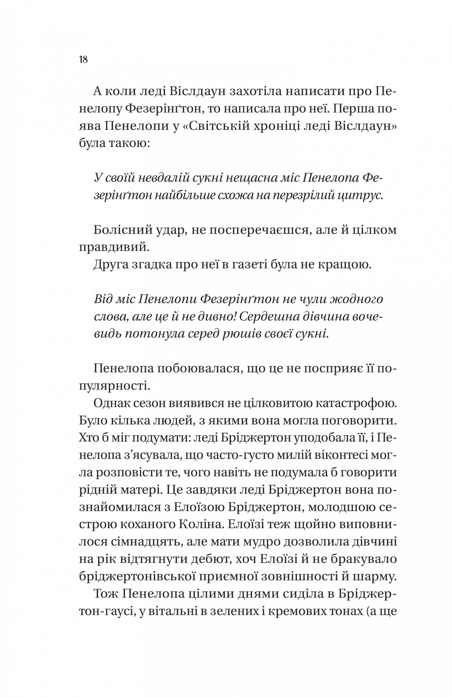 Лондонський вищий світ поринає в пристрасті нового сезону! Власне, нічого бурхливого не відбувається, а публіка одностайно твердить, який нудний видався рік... Певною інтригою є те, чи не втратить парубоцький статус тридцятитрирічний Колін Бріджертон, адже він якраз повернувся додому з мандрівки Грецією. Очевидних кандидаток у дружини, якщо вірити леді Віслдаун, на обрії нема. До того ж ніщо не заважає Колінові вмить зірватися та втекти назустріч пригодам — подалі від надокучливих материних натяків про шлюб і зашкарублої світської атмосфери. Звісно, цього б не хотілося Пенелопі Фезерінґтон, адже вона давно поглинута почуттями до Коліна, які переросли в дещо більше за дружбу. А втім, Пенелопа відвідує сезон не перший і далеко не другий рік підряд, ба вже перебуває на порозі перспективи довічно самотнього життя... І поки вся її вузькоглядна родина силкується перетворити наймолодшу з-поміж Фезерінґтонів, Фелісіті, на об’єкт зацікавлення для видного нареченого Коліна Бріджертона, обличчям до Пенелопи повертається невгамовна леді Денбері. Вона оголошує полювання на легендарну леді Віслдаун!