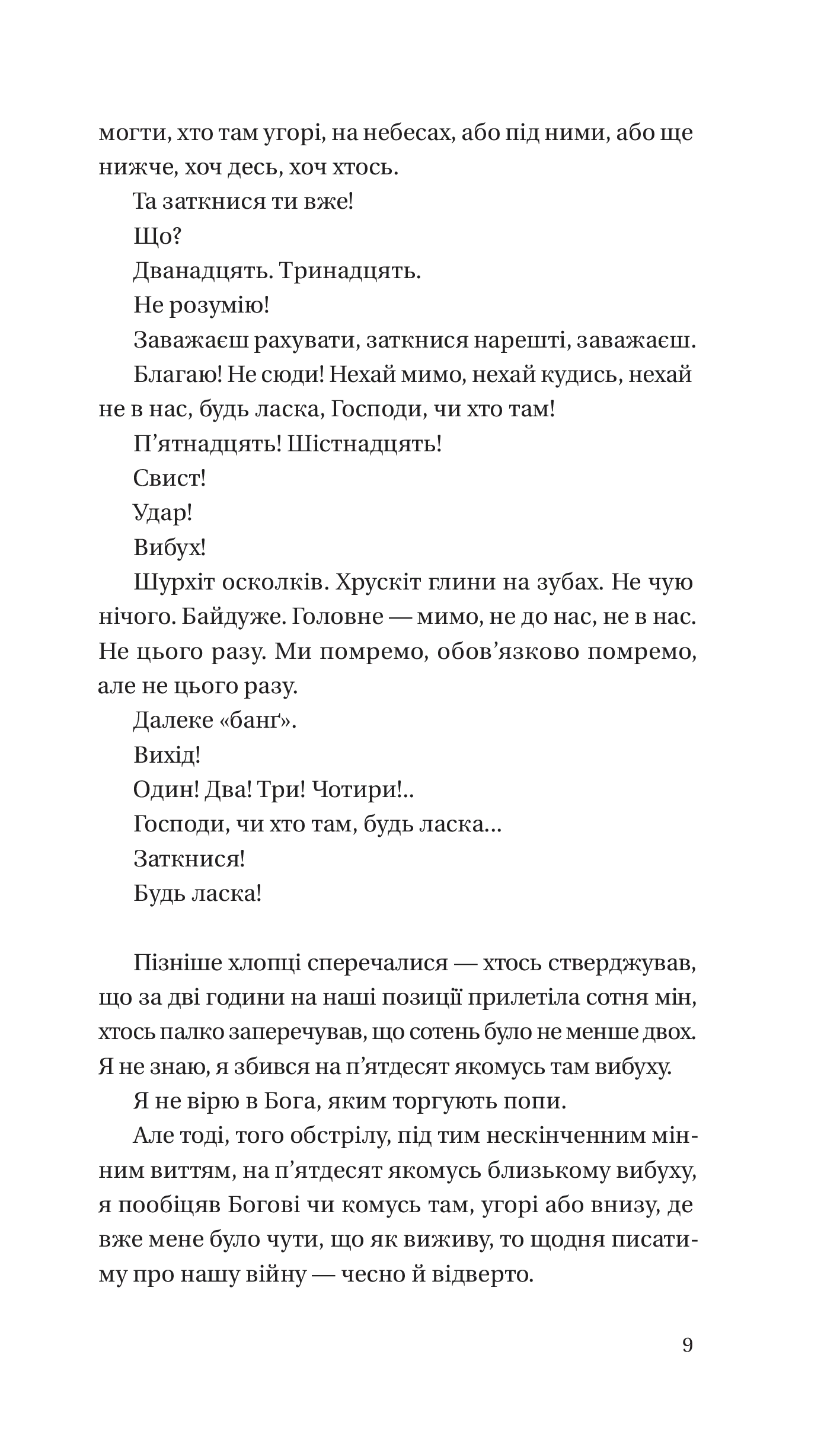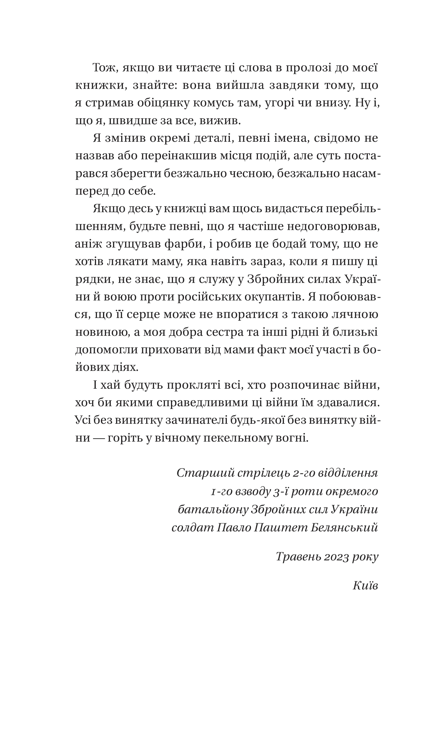 Учитель української мови з Кривого Рогу, установник вікон із Дніпра, бандит із Херсона, водій зерновоза з невеличкого полтавського села, власниця кав’ярні на узбережжі Каховського водосховища, письменник із Києва, зварювальник з металургійного комбінату, автослюсар, колишній студент — ніхто з них не планував ставати військовим. Але почалося велике вторгнення російських військ в Україну, і всі вони взяли до рук зброю, щоб захистити свою країну. Тепер вони — бійці окремого штурмового батальйону ЗСУ. Разом із героями ви пройдете шлях від формування підрозділу до боїв із ворогом. Перші штурми, визволені села та їхні мешканці, суворий окопний побут, поранення і смерті товаришів, розчарування і втрати, крихке військове щастя, кінець минулого життя і початок нового. Книжка автобіографічна і чесна, як і вся проза Белянського. Буде смішно, буде страшно, комусь прочитане може показатися незручним та занадто відвертим, але навряд когось залишить байдужим. Для когось ім’я Павла Белянського стало відоме через його блог