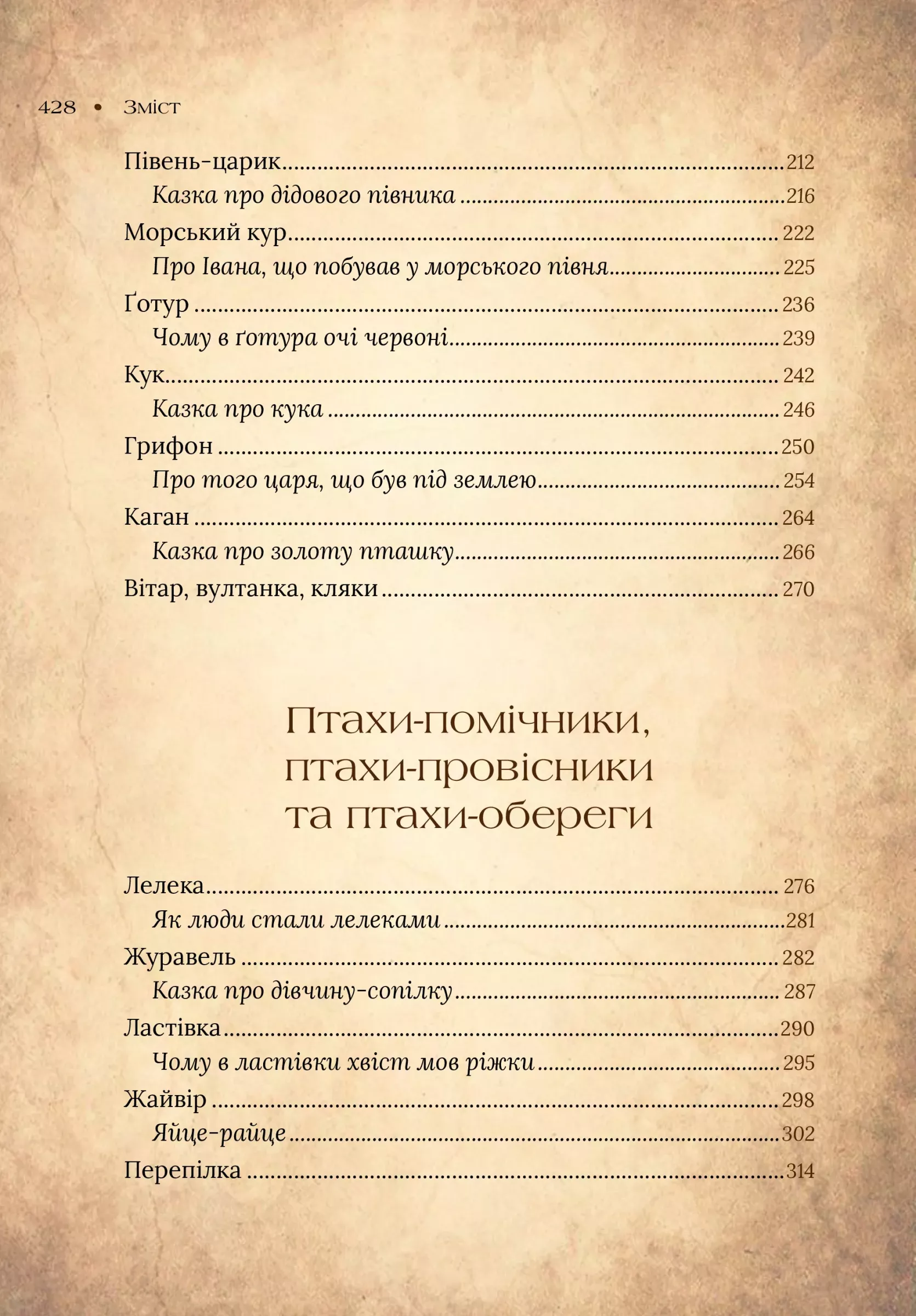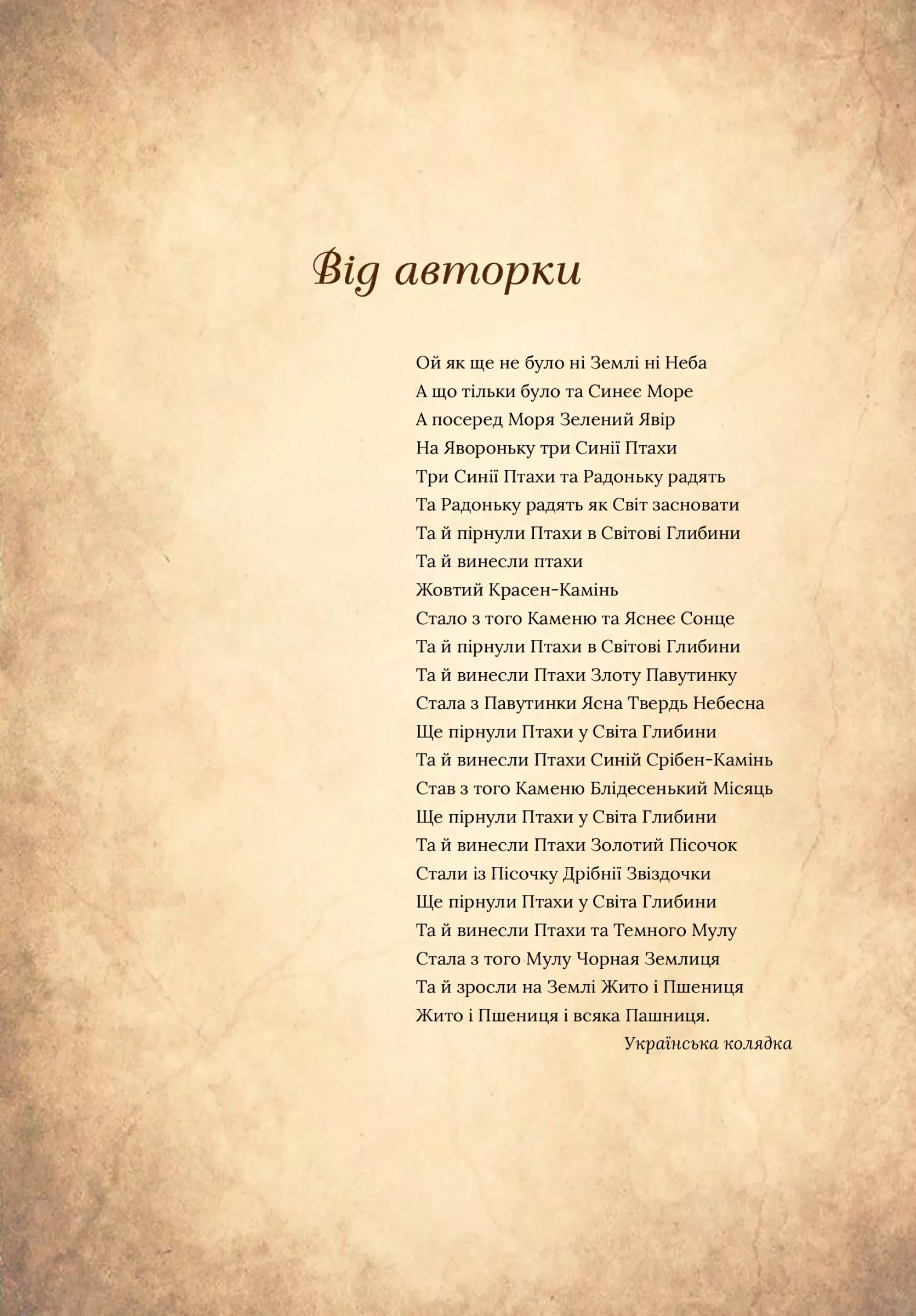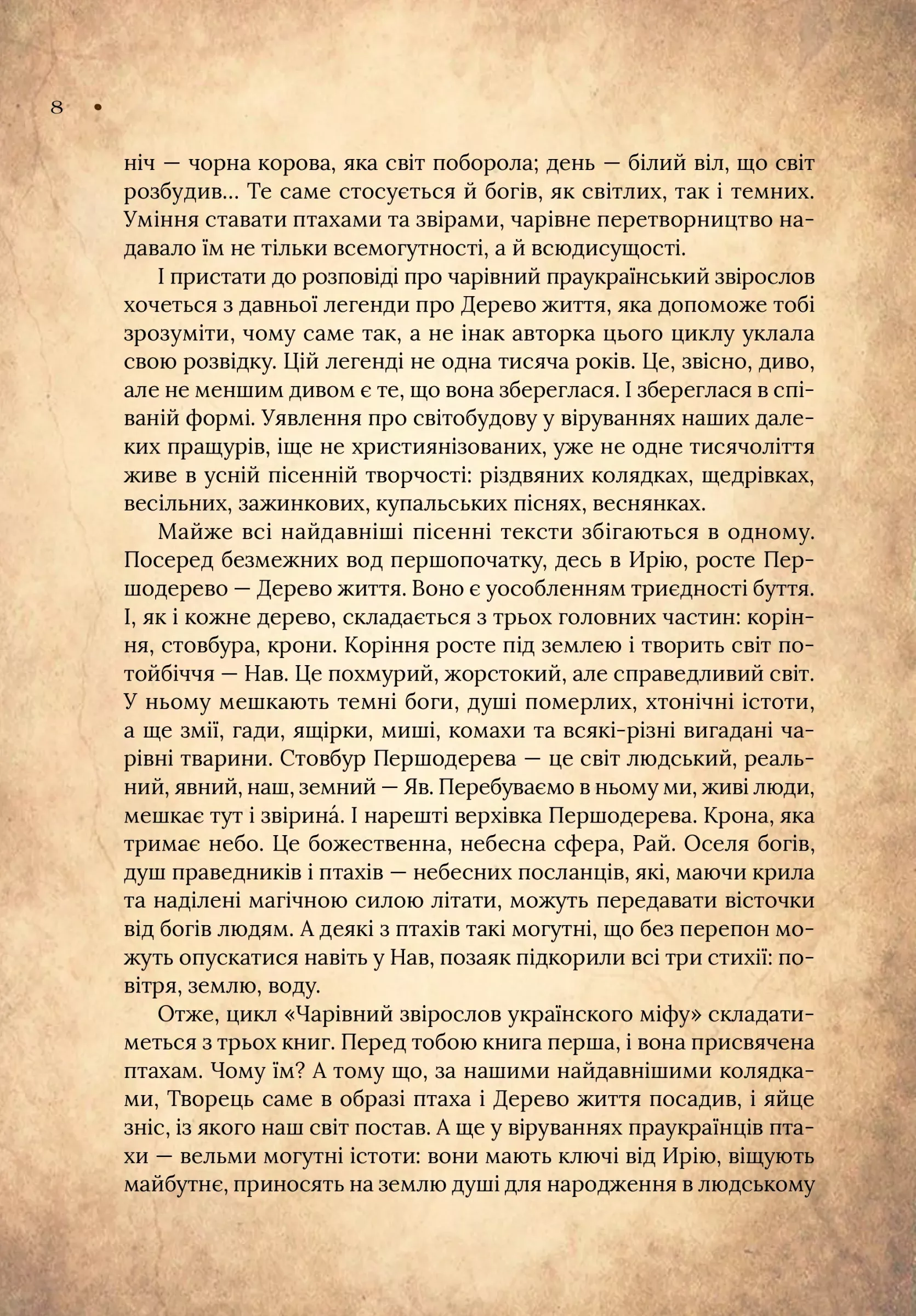 У ваших руках чарівна книжка — провідниця у світ птахів, реальних і витворених багатою уявою праукраїнців. Пернаті в’ють гнізда на липі біля хати й на горищі багатоповерхівки, у садках і парках, але передусім у казках, легендах, притчах, колядках, щедрівках і колискових. Вони можуть легко дістатися Ирію й відімкнути його ключами, постають творцями-деміургами та провісниками волі богів. Ці птахи пророкують долю цілих народів або ж просто через слова колискових і забавлянок допомагають мамі заспокоїти немовля. Зі сторінок цієї книжки до вас прилине вогняний першоптах, якого праукраїнці називали Сокіл-Рід і вважали Творцем Усесвіту. Ви завітаєте в Райський сад помилуєтеся птахами-дівами, його мешканками. Потрапите на пташиний суд і разом із птахом Суддею спробуєте чинити по справедливості. А ще дізнаєтеся багато цікавого про москальську зозулю, золотоключницю, крилатих посланців Дажбога й Велеса... Однак стережіться нечистих птиць, пов’язаних із потойбічним світом і нечистою силою. Подейкують, що вони віщують лихо і приносять біду на своїх крилах. Гортайте книжку — і перед вами постане величезний і цікавий шар культурної спадщини давніх українців, химерний звірослов, що його дослідила й опрацювала Дара Корній.