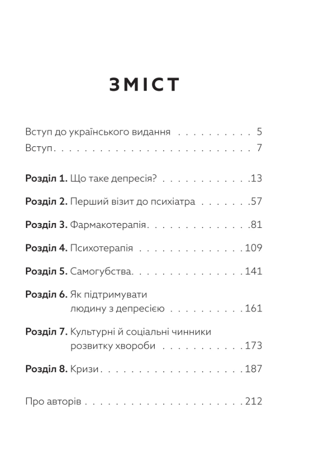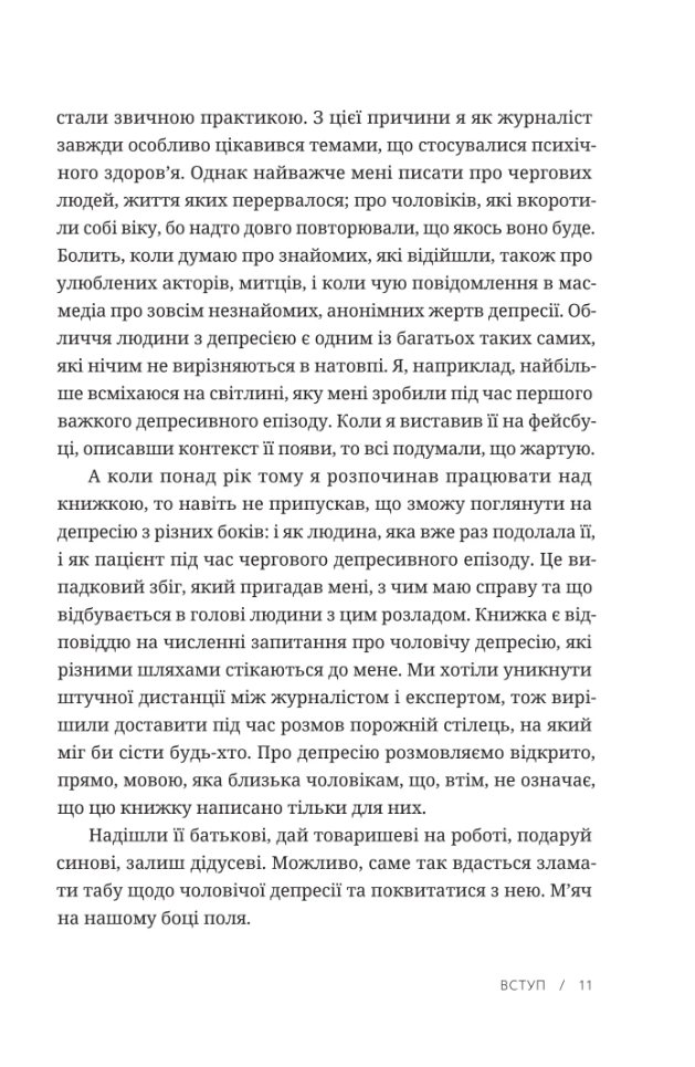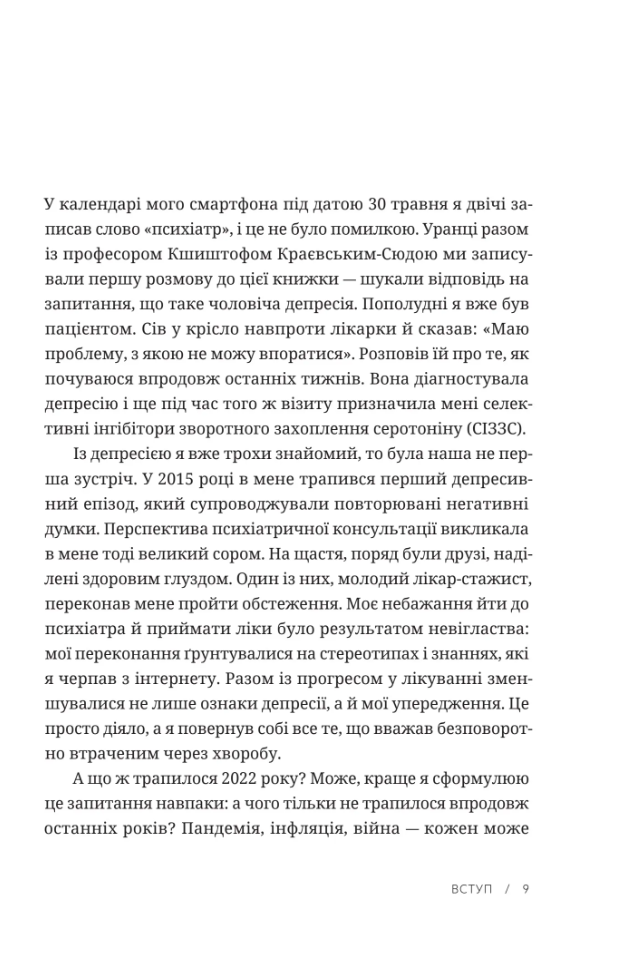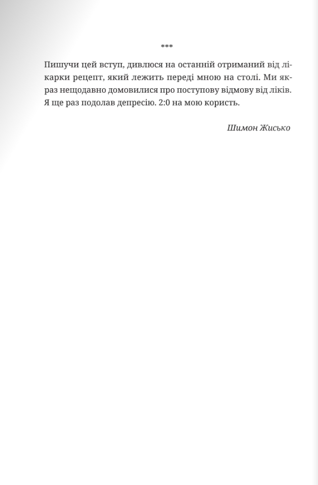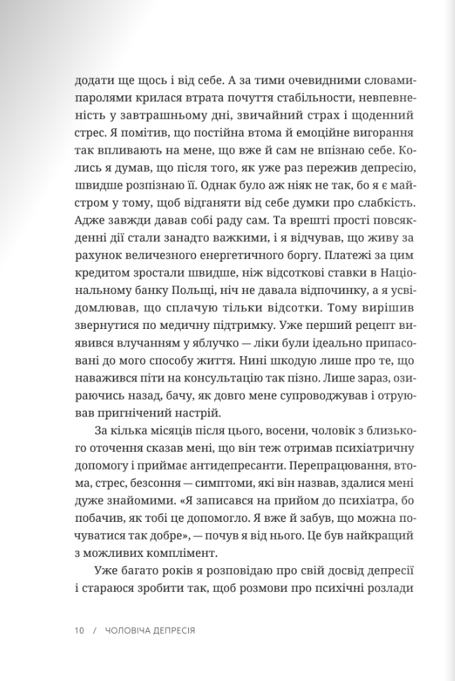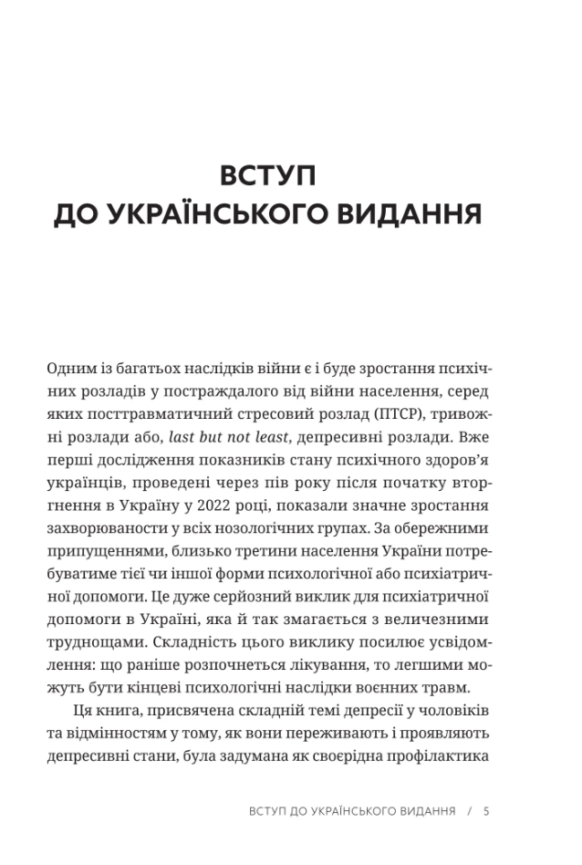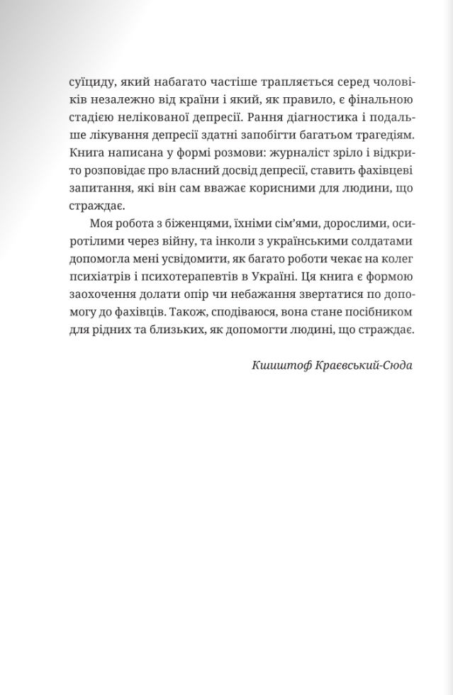 Прийнято вважати, що депресія — це хвороба жінок. Але чоловіки також страждають від цієї недуги, хоч і вдають, що з ними все гаразд. Вони одягають панцир, який замість того, щоб захищати їх, стає тягарем, бо не дає змоги виявити слабкості та побороти їх. Як розпізнати депресію в себе чи в близької особи? Як ефективно шукати допомогу? Чи психотерапія змінює особистість? Чи ліки, які призначає психіатр, безпечні? Про, можливо, найсерйознішу хворобу наших часів – як сьогодні заведено називати депресію – відверто й без кліше розмовляють Шимон Жисько, журналіст, який сам боровся з цим розладом, і проф. Кшиштоф Краєвський-Сюда, високошанований психіатр і психотерапевт. Разом вони розкривають механізми чоловічої депресії і секрети роботи, спрямованої на боротьбу з нею. Книжка буде корисною для чоловіків цивільних та військових, їхніх дружин, дітей, родичів, священників, сімейних консультатнтів, психотерапевтів, лікарів та усіх, хто працює з людьми.