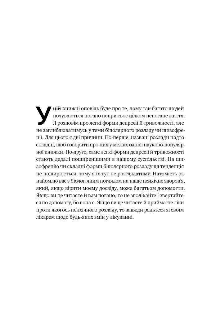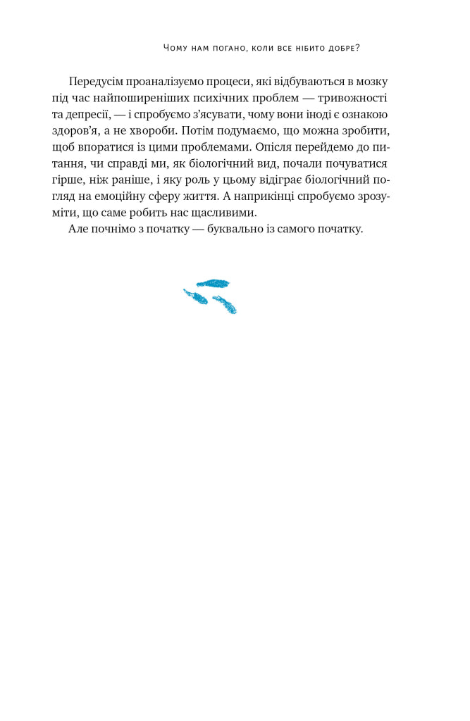 А от повнішу відповідь ви дізнаєтеся із цієї книжки. Автор поєднує знання з еволюції, нейробіології та психіатричної практики й розповідає, чому мозок функціонує так, а не інакше, навіщо нам почуття. Чому, коли ми погано спимо, багато сидимо, дивимося на чуже щастя в інстаграмі, мозок реагує у стилі «цей світ небезпечний», «моє життя нічого не варте», «я недостатньо хороший чи хороша».