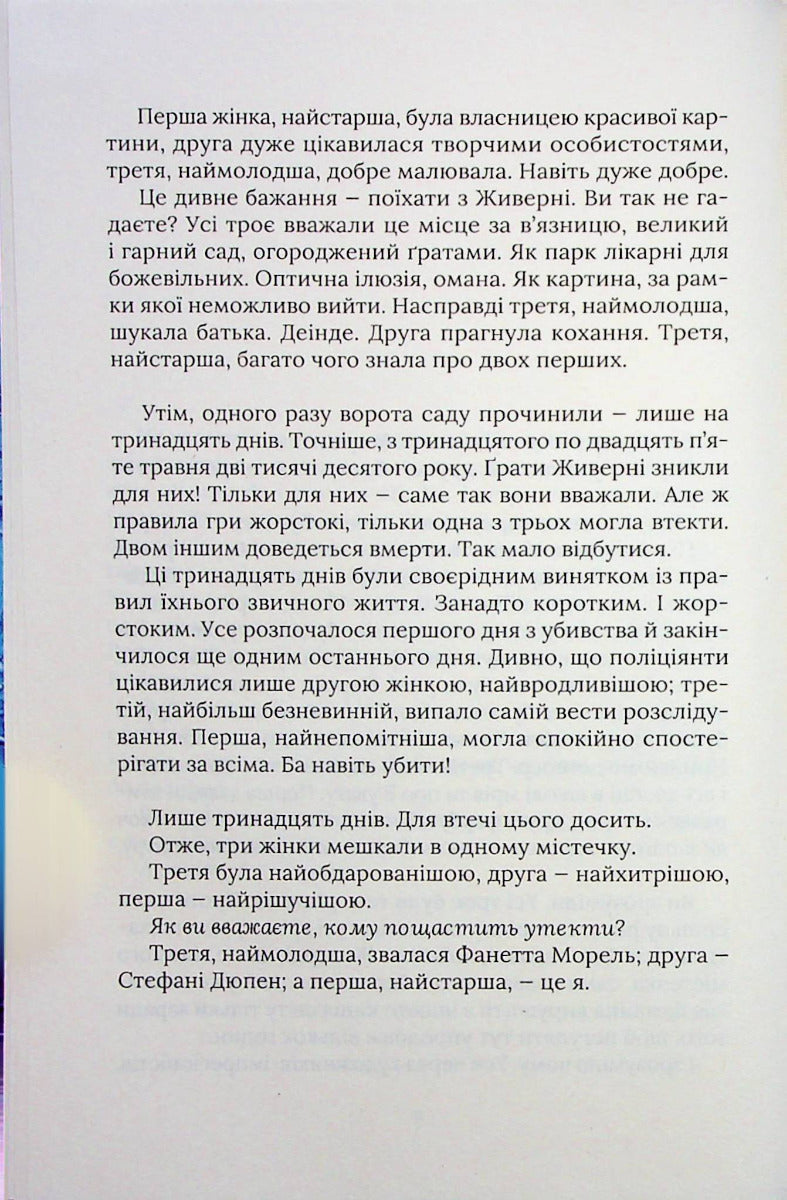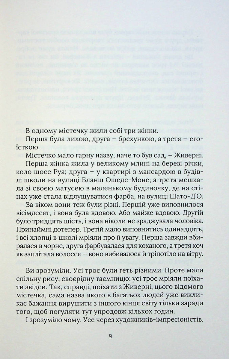 У Живерні, улюбленому містечку Клода Моне, зазвичай тихому і спокійному, сталося вбивство… В основі сюжету — життя трьох жінок: дівчинки-художниці,молодої чарівної вчительки й старенької пані, яка бачить і знає все. Усі троє геть різні, проте їх об’єднує одна таємниця: вони мріють назавжди поїхати звідси. Та чи так легко покинути свою золоту клітку? До того ж містечком ширяться чутки про викрадені картини Моне, серед яких нібито має бути відоме полотно — «Водяні лілії» у чорних тонах. І на тлі всього цього вирує руйнівна пристрасть…