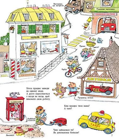 Річард Скаррі запрошує маленьких читачів у подорож містом, де кожен його мешканець щось робить! Від будівельників і пожежників до лікарів і фермерів — діти дізнаються, як працюють різні професії та яку роль вони відіграють у повсякденному житті.Книжка повна детальних ілюстрацій, цікавих сценок і простих пояснень, які допоможуть малюкам зрозуміти, як влаштований світ навколо них.