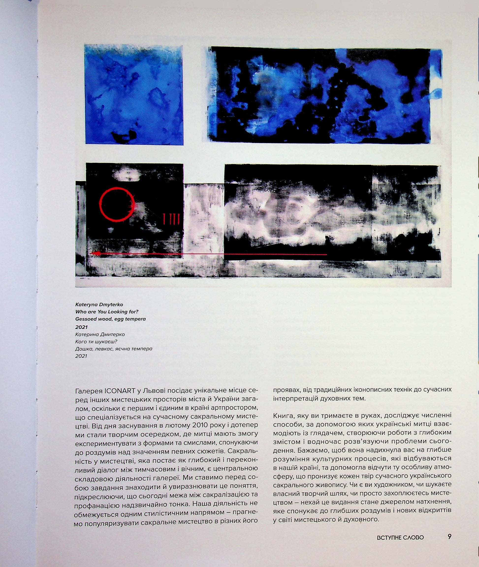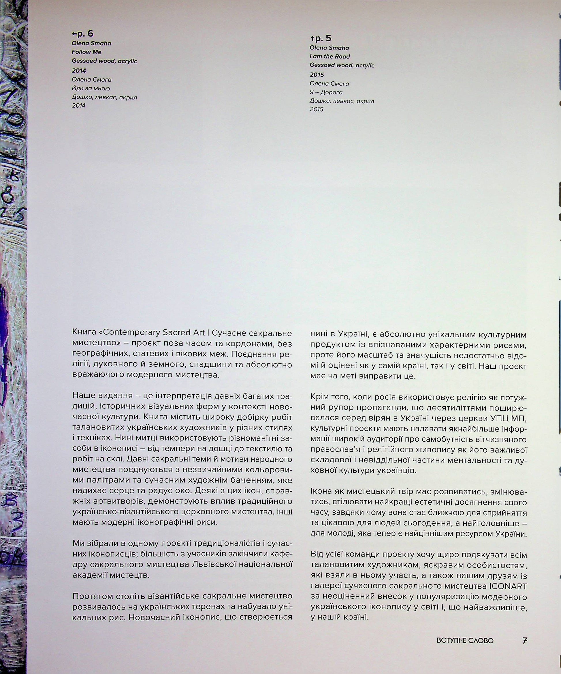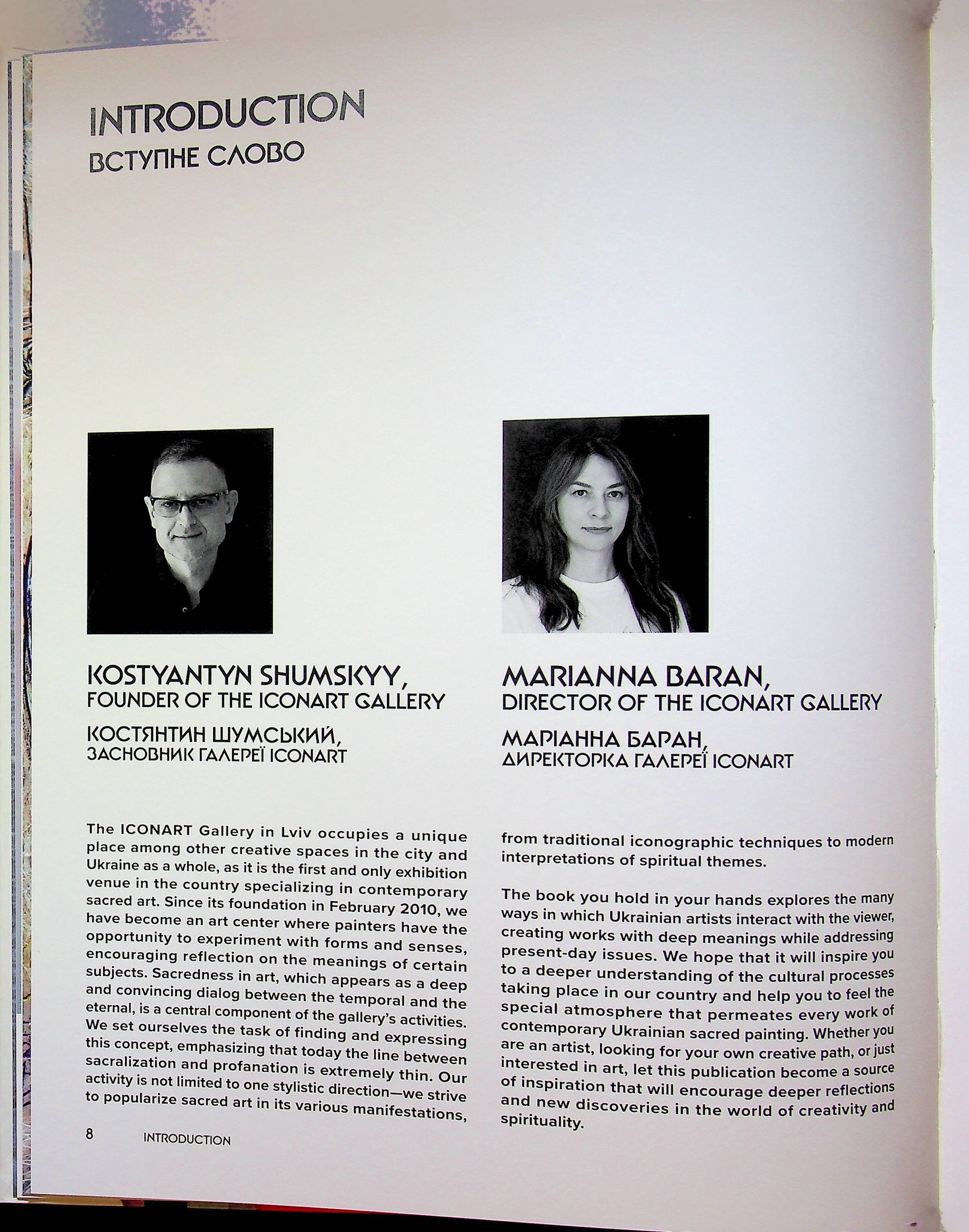 Книга «Contemporary Sacred Art | Сучасне сакральне мистецтво» – проєкт поза часом та кордонами, без географічних, статевих і вікових меж. Поєднання релігії, духовного й земного, спадщини та абсолютно вражаючого модерного мистецтва. Наше видання – це інтерпретація давніх багатих традицій, історичних візуальних форм у контексті новочасної культури. Книга містить широку добірку робіт талановитих українських художників у різних стилях і техніках. Нині митці використовують різноманітні засоби в іконописі – від темпери на дошці до текстилю та робіт на склі. Давні сакральні теми й мотиви народного мистецтва поєднуються з незвичайними кольоровими палітрами та сучасним художнім баченням, який надихає серце та радує око. Деякі з цих ікон, справжніх артвитворів, демонструють вплив традиційного українсько-візантійського церковного мистецтва, інші мають модерні іконографічні риси. Ми зібрали в одному проєкті традиціоналістів і сучасних іконописців; більшість з учасників закінчили кафедру сакрального мистецтва Львівської національної академії мистецтв. Новочасний іконопис, що створюється нині в Україні, є абсолютно унікальним культурним продуктом із впізнаваними характерними рисами, проте його масштаб та значущість недостатньо відомі й оцінені як у самій країні, так і у світі. Наш проєкт має на меті виправити це. Видання створене спільно з галереєю сучасного сакрального мистецтва у Львові ICONART.