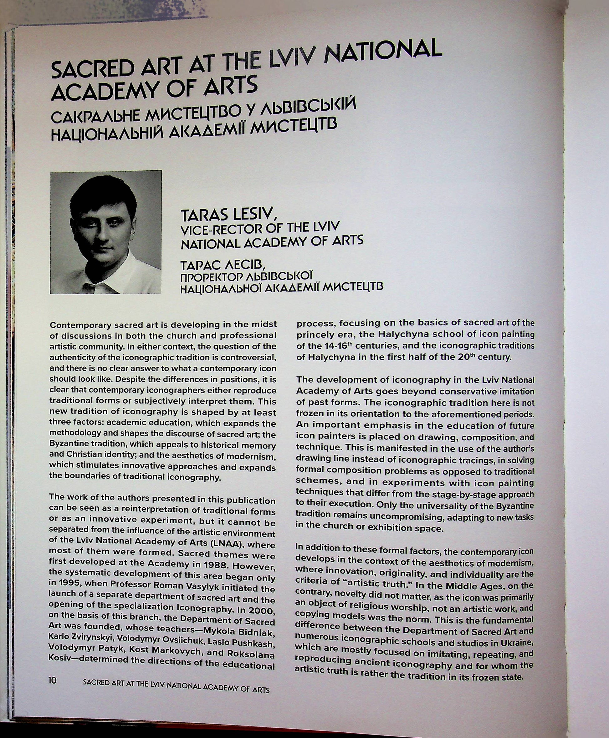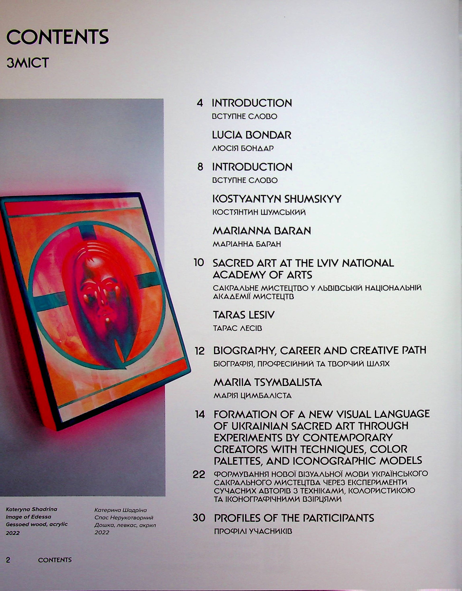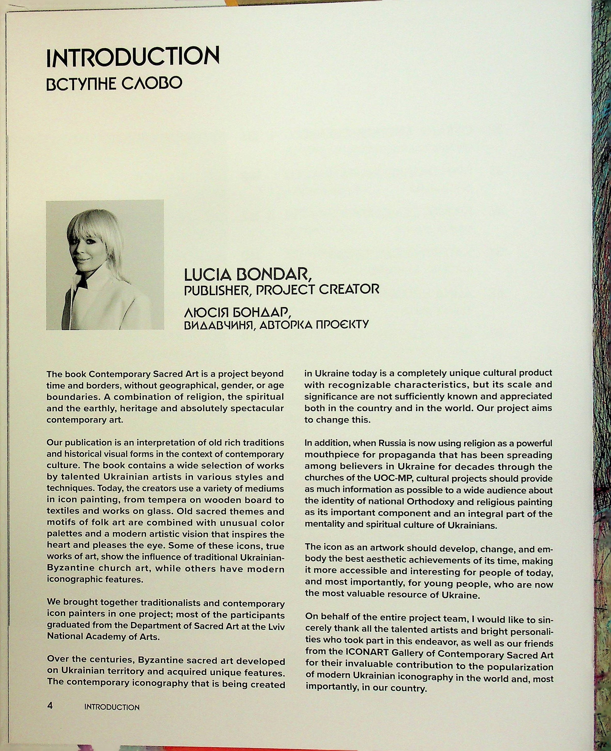 Книга «Contemporary Sacred Art | Сучасне сакральне мистецтво» – проєкт поза часом та кордонами, без географічних, статевих і вікових меж. Поєднання релігії, духовного й земного, спадщини та абсолютно вражаючого модерного мистецтва. Наше видання – це інтерпретація давніх багатих традицій, історичних візуальних форм у контексті новочасної культури. Книга містить широку добірку робіт талановитих українських художників у різних стилях і техніках. Нині митці використовують різноманітні засоби в іконописі – від темпери на дошці до текстилю та робіт на склі. Давні сакральні теми й мотиви народного мистецтва поєднуються з незвичайними кольоровими палітрами та сучасним художнім баченням, який надихає серце та радує око. Деякі з цих ікон, справжніх артвитворів, демонструють вплив традиційного українсько-візантійського церковного мистецтва, інші мають модерні іконографічні риси. Ми зібрали в одному проєкті традиціоналістів і сучасних іконописців; більшість з учасників закінчили кафедру сакрального мистецтва Львівської національної академії мистецтв. Новочасний іконопис, що створюється нині в Україні, є абсолютно унікальним культурним продуктом із впізнаваними характерними рисами, проте його масштаб та значущість недостатньо відомі й оцінені як у самій країні, так і у світі. Наш проєкт має на меті виправити це. Видання створене спільно з галереєю сучасного сакрального мистецтва у Львові ICONART.