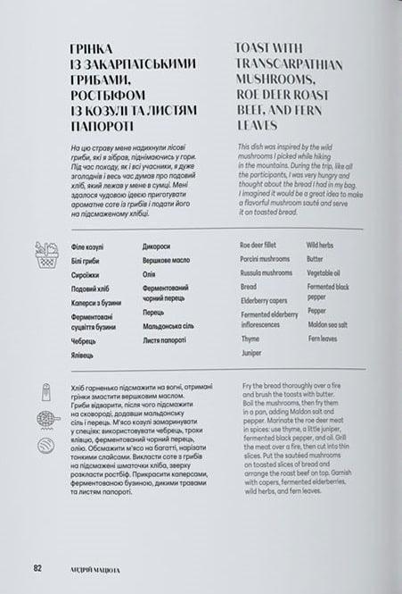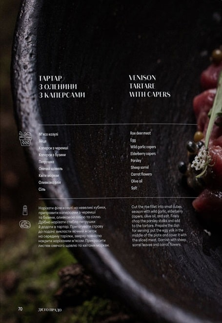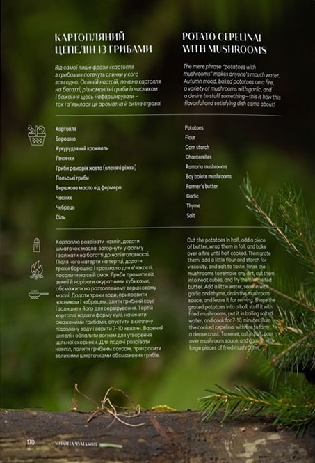Книга «Cooking in the Wild | Сучасна гастрономія в глибинах Карпат» – про виживання в природі українських Карпат, спільне приготування їжі, дбайливе ставлення до довкілля, ліс і гори, про любов до українських традицій і покликання кухаря. У 2019 році відомий шеф-кухар Ігор Мезенцев разом із талановитим фуд-фотографом Дмитром Бахта й Анною Смоляковою створили унікальний проєкт «ТОПОТ», головна мета якого – повернення до витоків національної гастрономії. Учасники – українські та іноземні шеф-кухарі – проводять п’ять днів у лісі, горах, спускаються до річки. Вони готують сучасні страви в абсолютно диких умовах, використовуючи інгредієнти, які можуть взяти з природи, а також придбати у місцевих фермерів. У 2021 році в четвертій зустрічі «ТОПОТ: Міст», що відбулася в Карпатах і увійшла до цього видання, взяли участь українські кухарі, а також представники іноземної гастрономічної спільноти з ОАЕ, Данії, Іспанії, США, Великої Британії. Усі були в рівних умовах – чоловіки та жінки, зіркові кухарі та початківці. Кожен інгредієнт шефи мали знайти, зібрати або придбати у фермерів. Під час цієї експедиції учасники приготували численні страви з дичини, яку вони купили в місцевих мисливців, і м’яса, придбаного у фермерів, причому використовували різні техніки: варили, смажили на багатті та запікали в земляній печі. У своїх стравах шефи максимально задіяли дикороси – їстівні плоди, горіхи і насіння рослин, трави, гриби тощо, які виросли в природному дикому середовищі, а не були культивовані людиною. Звичні рослини, що оточують українців на кожному кроці та ростуть на городах, у полях і лісах, шефи використовували як яскраві приправи, а іноді навіть робили центральним інгредієнтом своїх кулінарних творінь. У підсумку Дмитро Бахта створив унікальний фотоматеріал, що через сучасні стилізовані фотографії демонструє сучасні, складні страви, часто витвори справжньої високої кухні. Цей проєкт, як і всі «ТОПОТ», – неоцінений внесок у розвиток сучасної гастрономії України, мотивація та натхнення для всіх шеф-кухарів, фермерів. Це безпрецедентний випадок: такі кулінарні експедиції в Європі ще не проводилися. Українці досі часто не розуміють, які скарби має наша унікальна природа, наскільки багаті традиції та спадщина, що лежать в основі нашої сучасної культури, невіддільна частина якої – гастрономія. Саме про це наша книга.