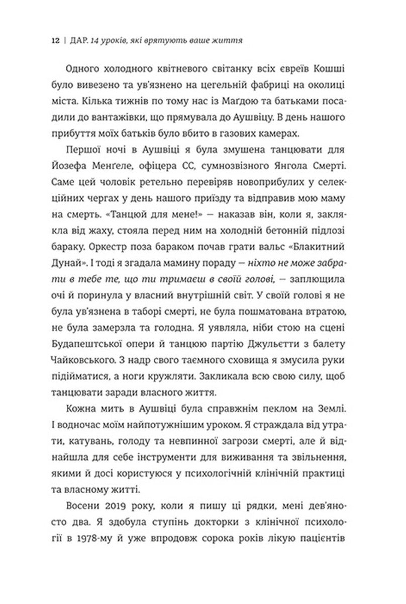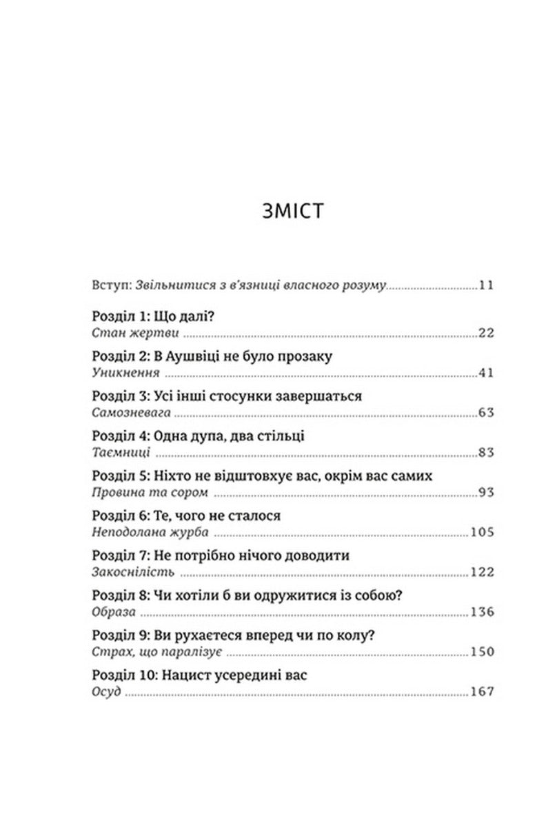 Едіт Еґер написала цю книжку на прохання читачів її бестселера «Вибір» і це практичний посібник як подбати про своє ментальне здоров’я – як жити повноцінно і не застрягати у в’язниці власного розуму. Це своєрідні 14 сеансів від видатної психотерапевтки, які пояснюють як сприймати свої емоції, як позбутися комплексу жертви, зцілитися від дитячих травм, переживати втрати та горе, як виходити з конфліктних ситуацій чи не потрапляти у них, як прийняти і полюбити себе, як позбутися відчуття вини, як навчитись контролювати свої страхи та впоратися з тривожністю.