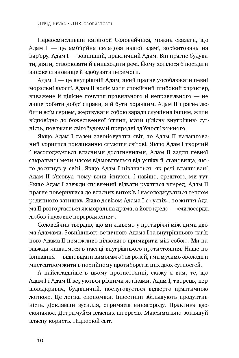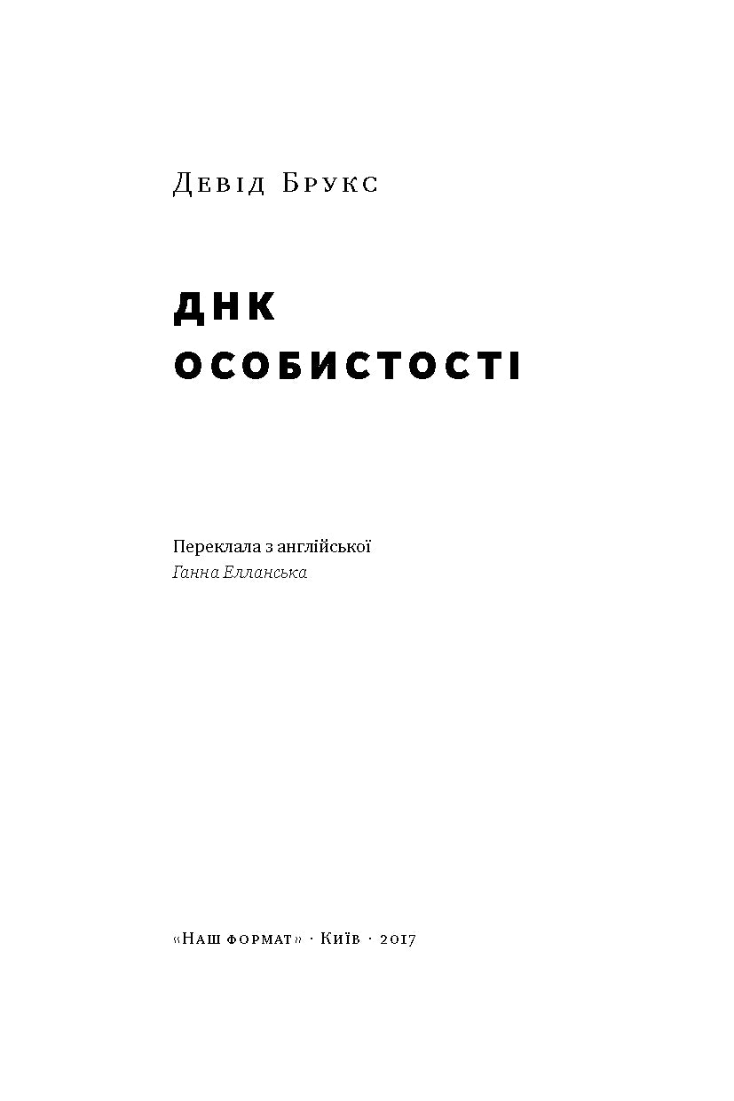 У книзі «ДНК особистості» американський вчений та публіцист досліджує проблематику сучасного характеру особистості, його ідеалів та переконань. З особливим почуттям гумору та професійним підходом до вивчення теми, Девід Брукс описує особливості становлення сильної та самостійної особистості, про вибір пріоритетів та цілей.