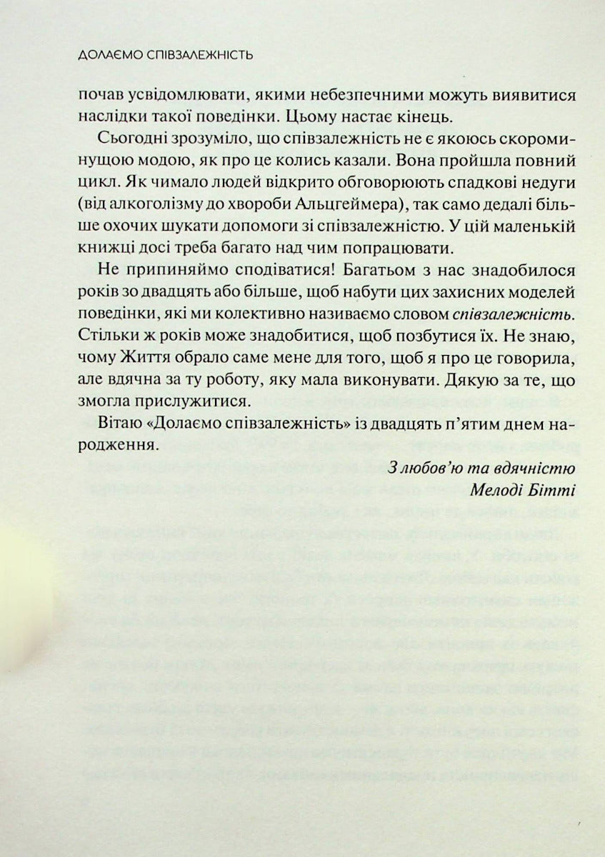 Маєте проблеми із самооцінкою, знижений емоційний фон, понад усе боїтеся самотності? Почуваєтеся великими хрещеними матерями та батьками цього світу й задовольняєтеся, а чи забезпечуєте потреби інших, ігноруючи власні? Ваш діагноз — співзалежність. Від цієї психічної патології потерпають мільйони людей, і вона проявляється в токсичних стосунках: подружніх, з батьками, колегами, друзями. Досить жити чужим життям і намагатися врятувати всю ціну свого добробуту, розмиваючи особисті кордони! Необтяжливі дослідження розробки вашої координати в химерному світі незалежності, і ви не пройдете повз вихід із цього лабіринту.