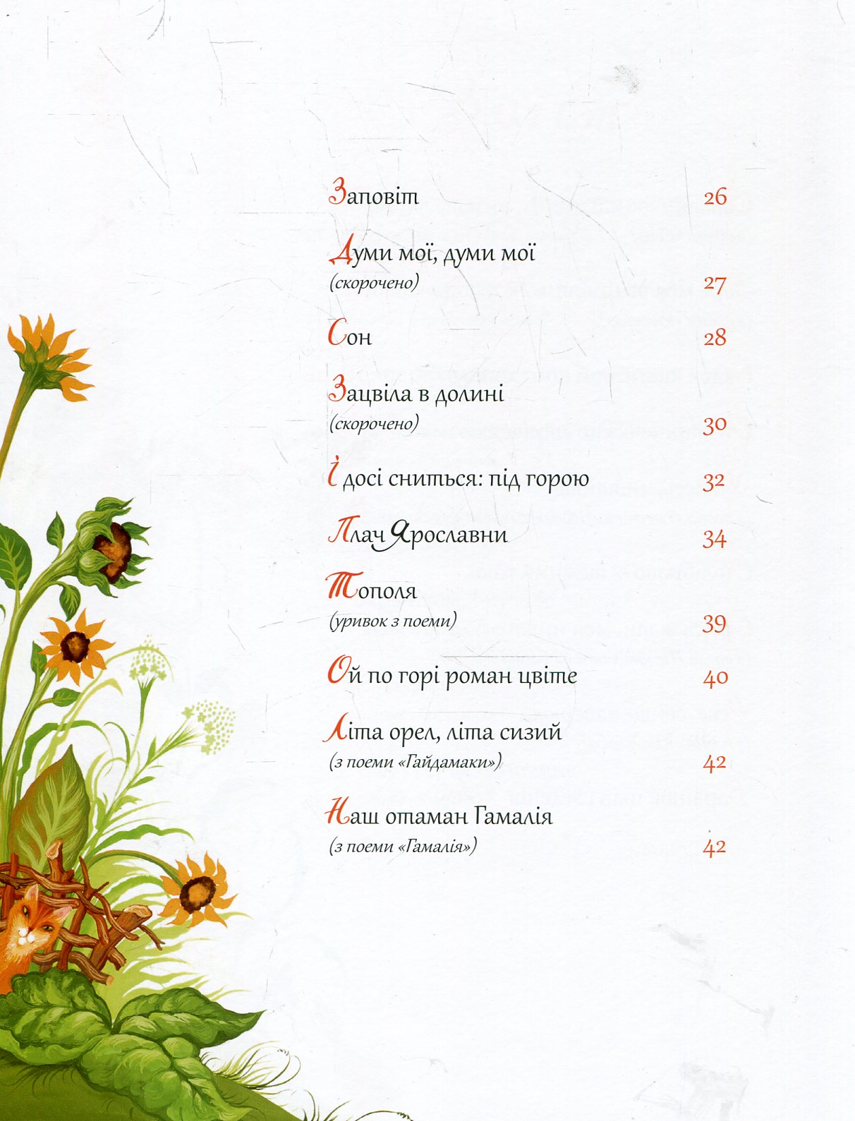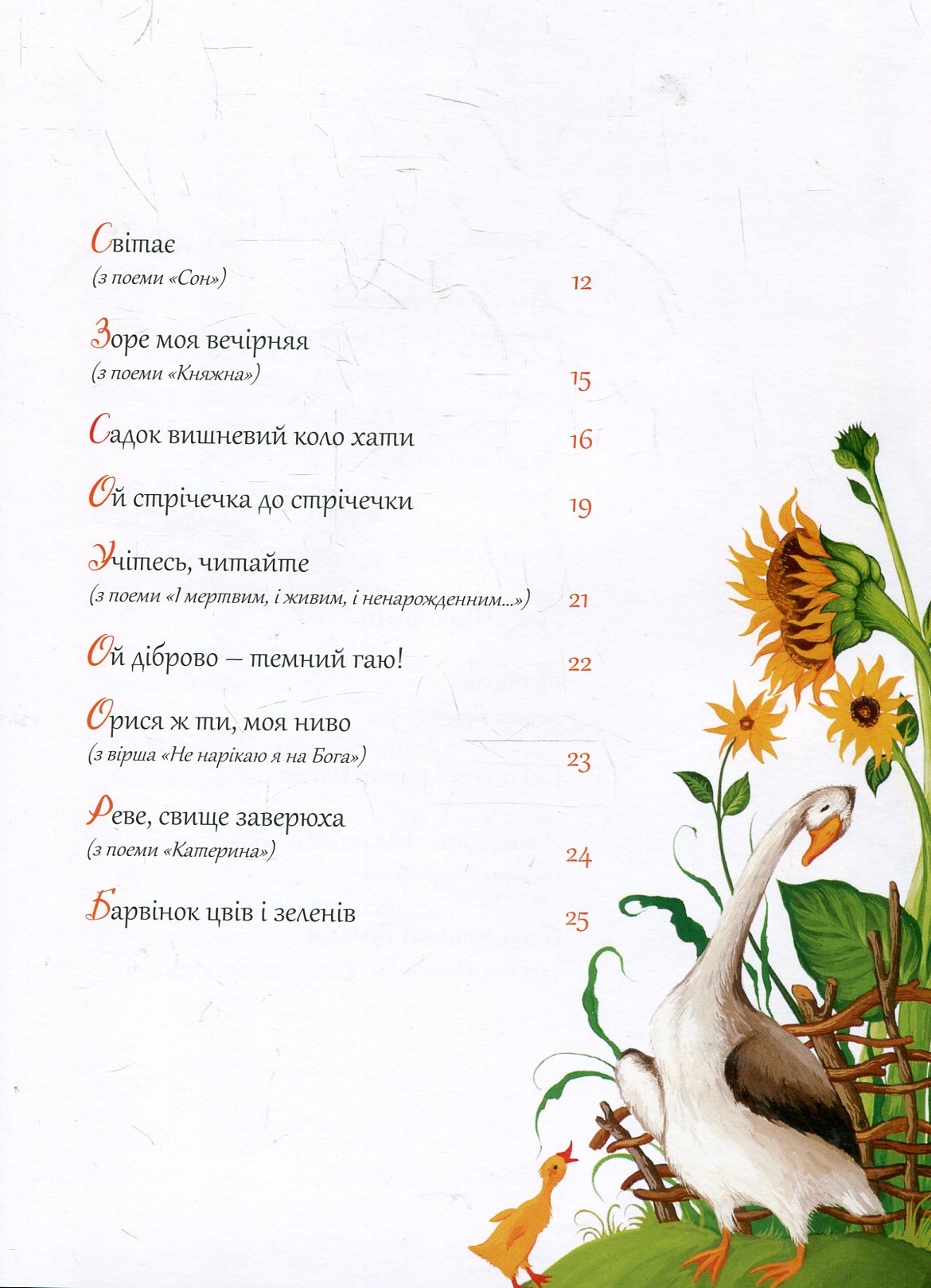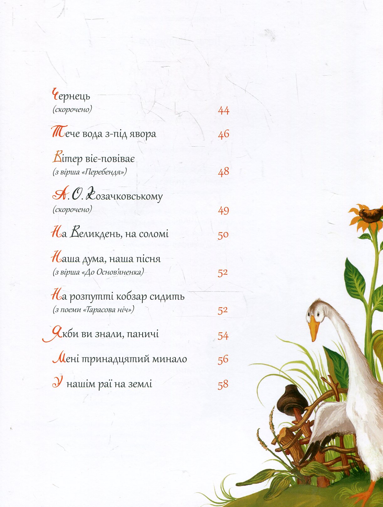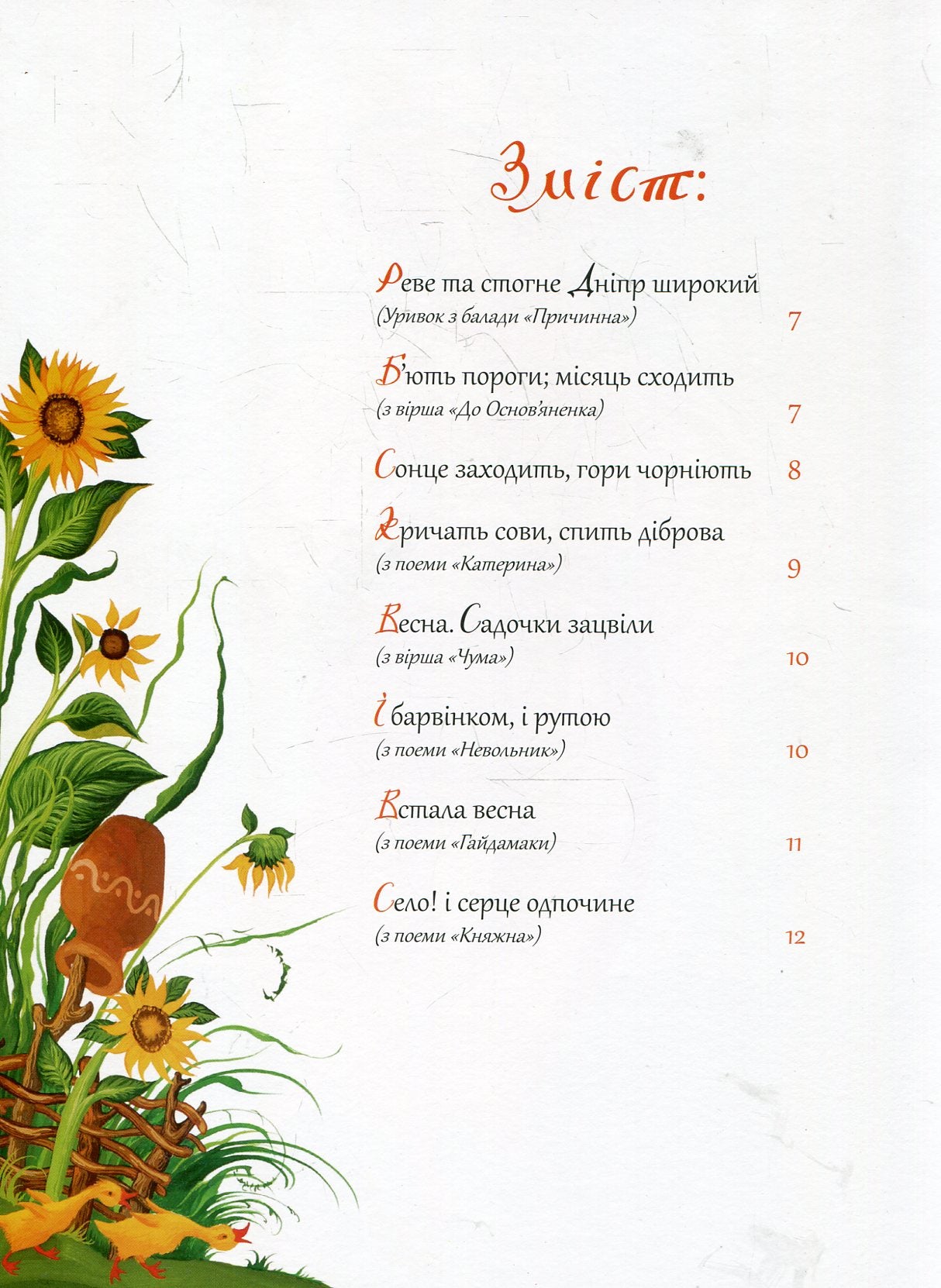 Дитячий кобзар – це не просто збірка найвідоміших віршів Тараса Шевченка, а художнє видання з яскравими ілюстраціями. Картини Марини Михайлошиної підкреслять слова Великого Кобзаря та привернуть увагу як маленьких, так і великих читачів. Тут і українське село з біленими хатами, і козак, що збирається у довгу дорогу, і, звичайно, кобзар, що на кобзі грає та пісні про славетне минуле наспівує.