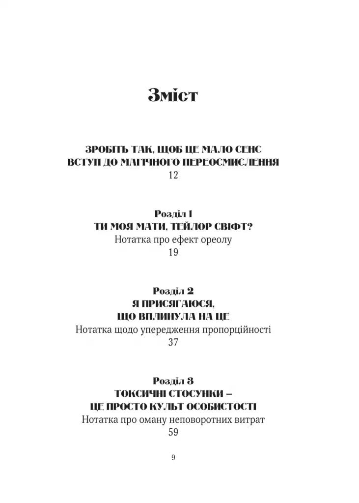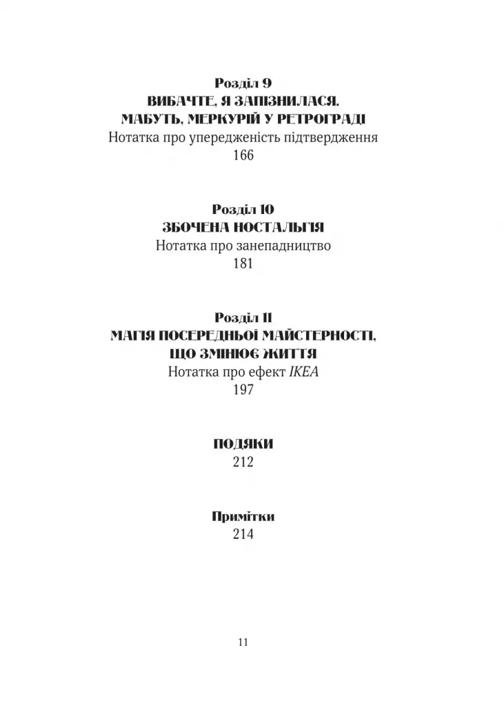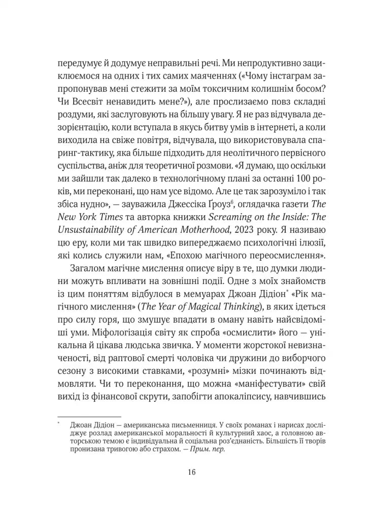 У добу перенасичення інформацією, саморефлексією та емоційним вигоранням, коли кожне рішення — від вибору продуктів на вечерю до вподобайки в соцмережах — здається доленосним, ми мислимо більш складно й заплутано. Аманда Монтелл із проникливістю й гумором, через призму власного досвіду, досліджує, як сучасна культура тривоги, самодопомоги й нескінченних стимулів формує наше мислення, змушуючи приписувати глибокі сенси тому, що часто їх не має.Це дотепний і влучний путівник нестабільним світом, у якому ми намагаємося знайти опору, творячи власну «магію» в буденності. Прониклива й неймовірно актуальна книжка для всіх, хто хоче краще зрозуміти, як жити в добу постійного «надто».«Фантастична подорож у потаємні куточки сучасного розуму»,— Мона Авад, авторка бестселеру «Зайчик»«Кожному, хто прагне краще зрозуміти хаос нашого сучасного суспільства»,— Kirkus ReviewsДетальніше про книгуКнига «Епоха магічного переосмислення. Нотатки про сучасну ірраціональність» — це нонфікшн із саморозвитку від американської авторки Амани Монтелл. У напрацюванні вона фокусується на житті сучасної людини, в якому вигоряння, ізольованість та інформаційне перевантаження стали звичними супутниками повсякденності.Озброївшись власним досвідом та безпомилковою уважністю до буття, авторка говорить про поведінкові упередження, що засіли в мисленні суспільства — від ефекту IKEA та ілюзії новизни, — торкаючись й інших тенденцій, чий негативний вплив на соціум мають руйнівні наслідки.Вступ до теми когнітивних упереджень: стежками тривожності й невизначеностіЗ написанням книги «Епоха магічного переосмислення» Аманда Монтелл шукала причини поганого морального стану в сутності епохи, в якій живе.Теперішній лад спонукає розуми мільйонів вдаватися до самооманливих шаблонів мислення у зв’язку з постійним потоком інформації. Такий спосіб міркувати породжує викривлення при формуванні переконань, які із сарказмом і дотепністю досліджує авторка. В одинадцяти розділах Монтелл оголює сутність різних явищ популярної психології, знаходячи влучні приклади у політичних і культурних подіях.Говорячи про посилення ірраціональності, викривлення при формуванні переконань, ефект ілюзії правди та інші феномени, письменниця пояснює механізми, через які мозок подеколи веде людей до прірви божевілля й безнадії.Магічне мислення: неодмінний супутник нової епохиПосібник із самодопомоги й розуміння теперішнього The Age of Magical Overthinking: Notes on Modern Irrationality стане в пригоді всім, хто прагне зрозуміти суть упереджень при прийнятті рішень та отримати базові знання про феномени людського мислення. Серед інших явищ, авторка виділяє такі:Монтелл досліджує ефект ореолу, розкриваючи його крізь шалену популярність співачки Тейлор Свіфт.З упередженням пропорційності читачі знайомляться у контексті теорій змов і довідуються про деякі найцікавіші, незбагненні з них.Ефект неповоротних витрат авторка розкриває, ділячись історією своїх аб’юзивних стосунків у юному віці.Розповідаючи про свої перші спроби на ниві журналістики й трансформацій зовнішності, в особистий текст Монтелл із легкістю вплітає пояснення упередження нульової суми.Пронизлива оповідь про онкохворих дівчат, що ведуть свої блоґи в інтернеті й сповнюють заразливою жагою до життя поєднується зі знайомством з упе