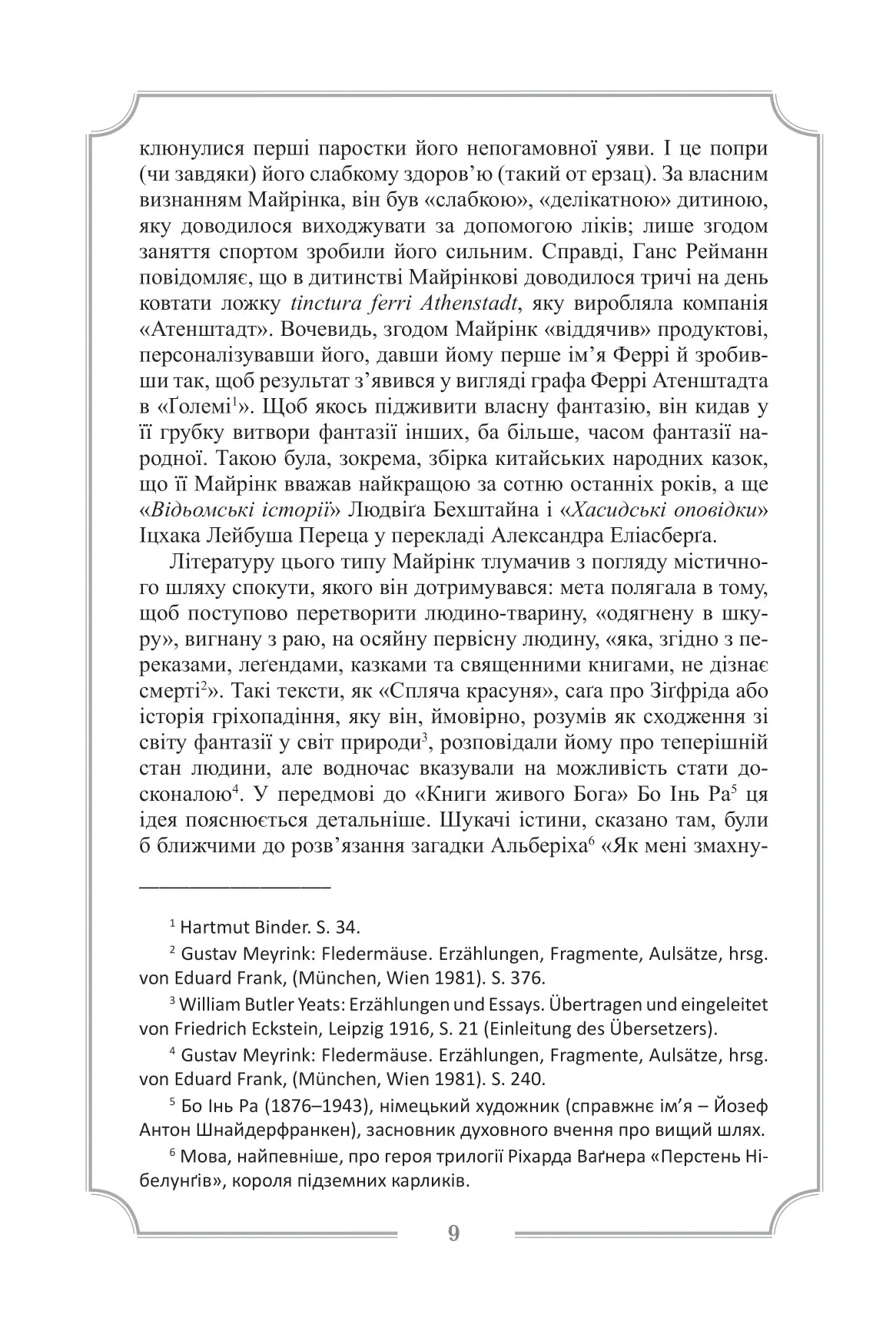 Ґустав Майрінк(справжнє прізвище — Майєр) /Gustav Meyrink/ (1868–1932) — австрійський письменник, драматург, перекладач і банкір. Зажив світової слави завдяки опублікованому 1915 року романові «Ґолем», який став одним із найпопулярніших творів XX cтоліття.У віці 24 років, переживаючи тяжкий моральний занепад, Майрінк збирався застрелитися, однак, за його словами, почув якесь дивне шарудіння й побачив, як чиясь рука підсунула під його двері брошурку з назвою «Життя після смерті». Цей дивний випадок змусив Майрінка відмовитися від наміру самогубства і спонукав його до дослідження різноманітних містичних вчень: теософії, кабали, християнської софіології та східного містицизму, а також до занять йогою. Ці окультні студії стали справою його життя і знайшли свій відбиток у творчості автора.До самої смерті Майрінк займався перекладацтвом. Серед його плідного доробку — німецькомовні переклади Чарлза Дікенса, Редьярда Кіплінґа та Лафкадіо Герна, а також низки окультних праць, серед яких — єгипетська «Книга мертвих».Майстерно розвиваючи езотеричні та містичні мотиви на тлі звичної нам буденної реальності, Майрінк створював неповторні літературні твори і заслужено здобув звання найшанованішого німецькомовного письменника у царині літератури про надприродне.До першого тому зібрання прозових творів Ґустава Майрінка, австрійського майстра літератури надприродного, увійшли романи «Ґолем», «Зелений лик» і «Вальпургієва ніч».«Ґолем» (1915) приніс авторові світове визнання та став одним із найуспішніших романів XX cт. В основу роману лягла легенда про рабина, що створив Ґолема — істоту з глини, яку завдяки кабалістичному заклинанню оживив і наділив душею. У романі «Зелений лик» (1916) автор розвиває сюжет навколо несподіваної зустрічі головного героя з дивним зеленоликим власником крамнички магічних речей. «Вальпургієва ніч» (1917) акцентує увагу на протиставленні світу обивателів і таємничого, містичного світу, пов’язаного з нашим.Широке використання елементів окультних і містичних вчень у поєднанні з описами тогочасної реальності зробило твори Майрінка самобутніми та неповторними й принесло йому заслужене визнання. Завдяки успіхові трьох романів, що містяться у цій книжці, Ґустав Майрінк — разом із Гансом Гайнцем Еверсом і Карлом Гансом Штроблем — став одним із головних німецькомовних письменників початку XX cт., які працювали у жанрі літератури надприродного.