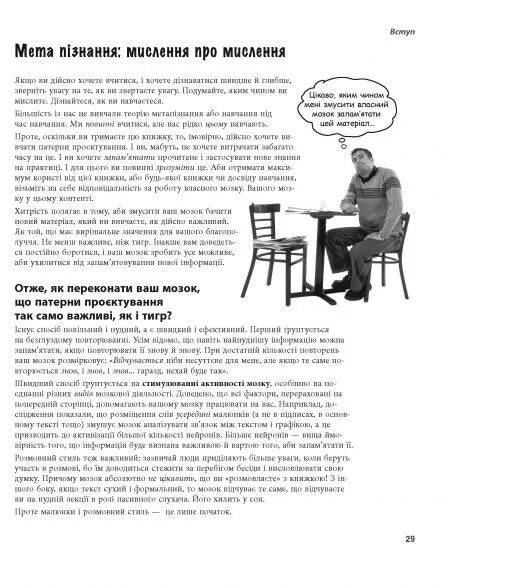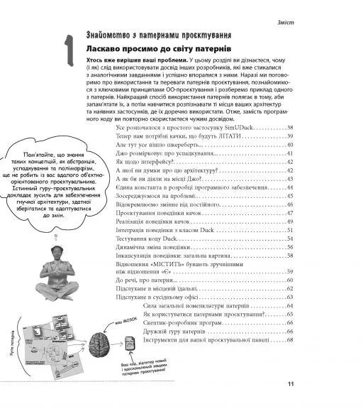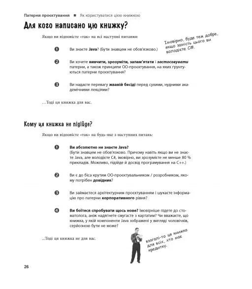 «Патерни проєктування» — ваша книжка, якщо вам хоч колись доводилося стикатися з проблемами дизайну програмного забезпечення. Вам не доведеться «винаходити колесо» — просто скористайтеся зведеним докупи величезним досвідом розробників і можливістю використовувати найкращі практики. Ви дізнаєтеся, навіщо потрібні патерни, побачите, як вони виглядають і працюють у «дикій природі», а призвичаївшись до їх використання, зможете витратити вільний час на щось більш складне і цікаве. Автори чудово показали, як патерни використовуються у Java API і як застосувати вбудовану підтримку патернів Java у вашому власному коді. Заразом ви засвоїте реальні принципи ОО-програмування, що залишаться з вами і тоді, коли доведеться працювати без патернів. Візуально насичений формат книжки розроблений із використанням новітніх досліджень в галузях нейробіології, когнітивної науки і теорії навчання. Тому весь її матеріал миттєво запам’ятовується, і невдовзі ви зможете з легкістю спілкуватися з іншими членами вашої команди на «таємній мові» патернів проєктування.