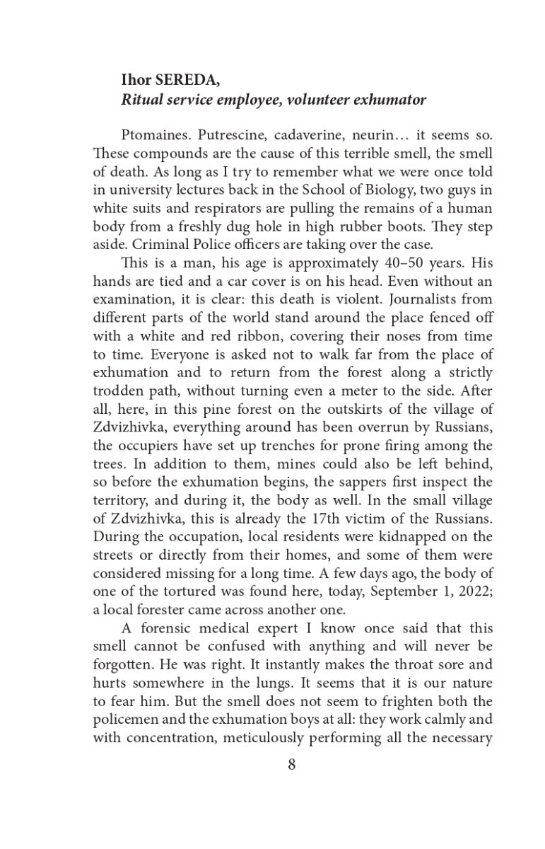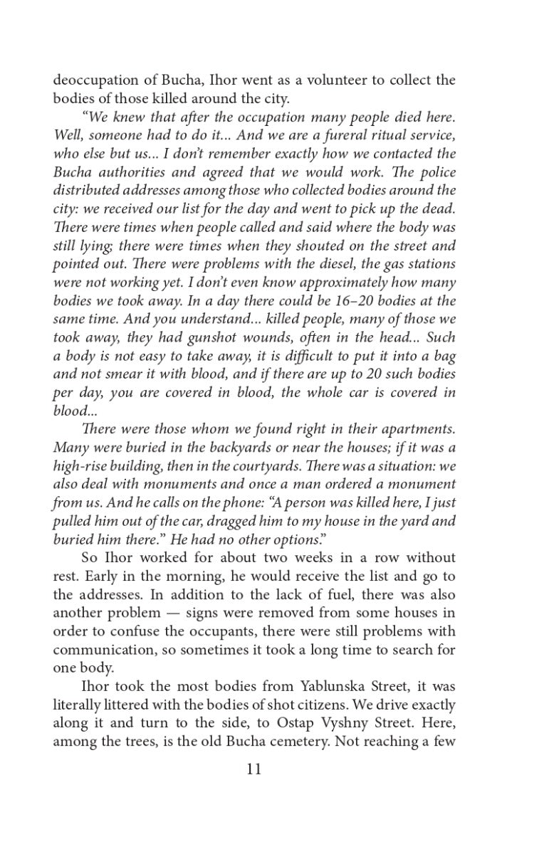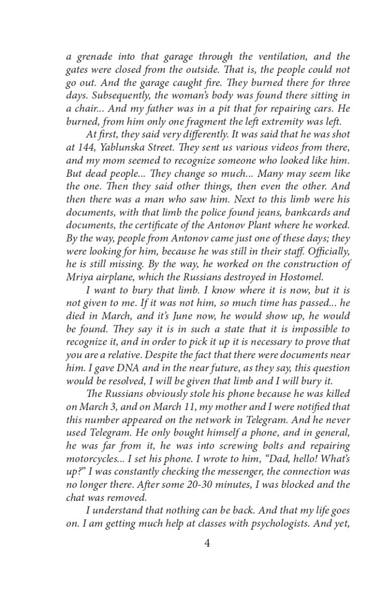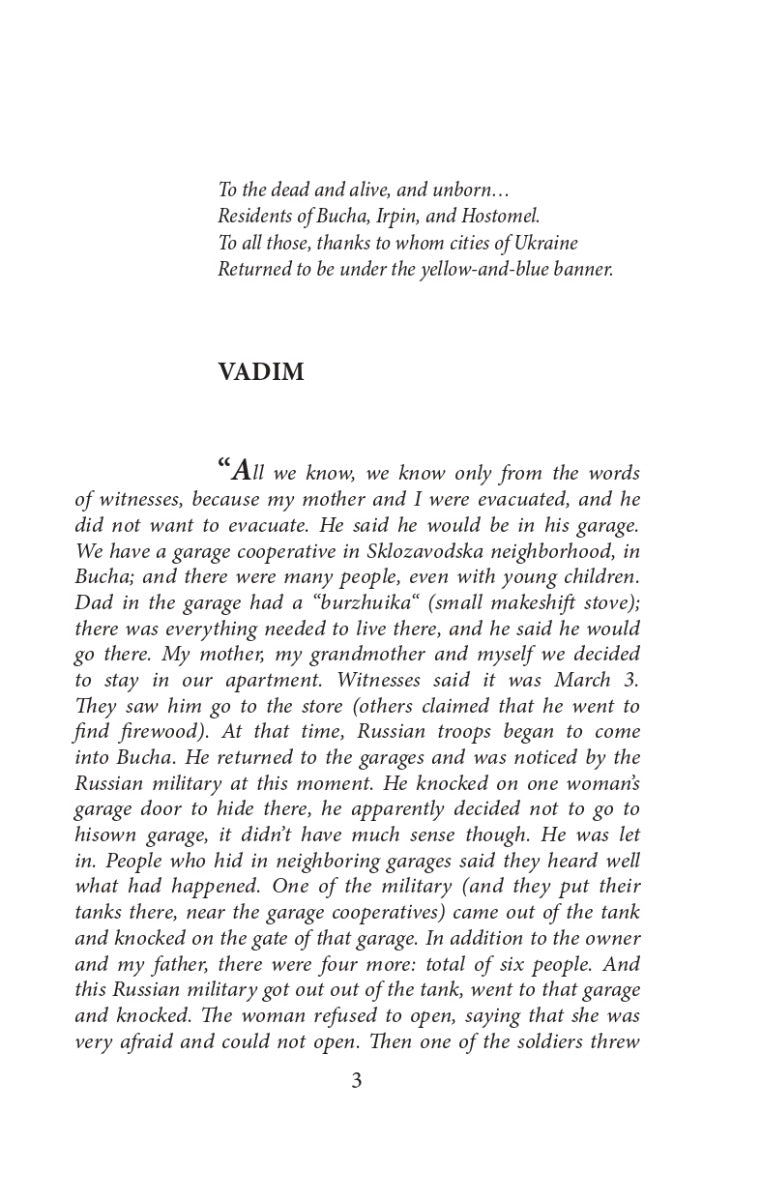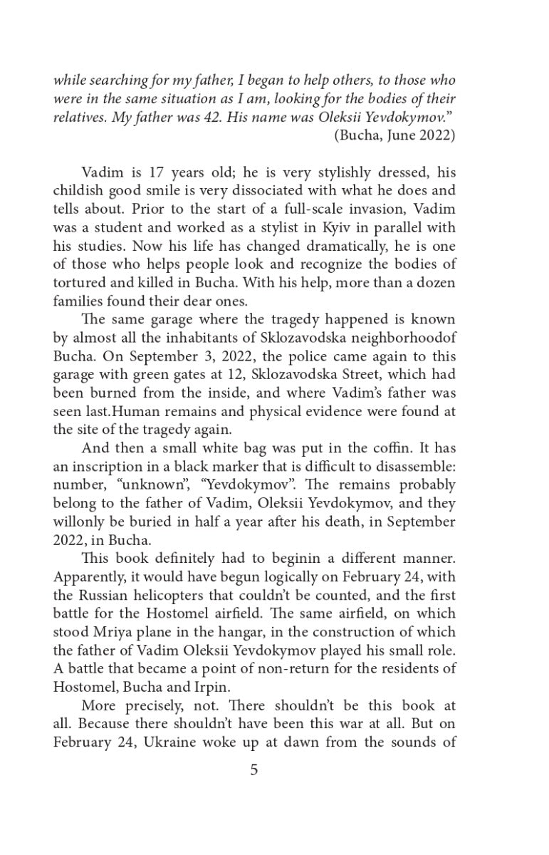 There shouldn’t be this book at all. Because there shouldn’t have been this war at all. But on February 24, Ukraine woke up at dawn from the sounds of explosions, and a convoy of Russian militaryvehicles crashed our past life with their grousers. The war has become our new reality, and air alarms become our everyday life. Bucha and Irpin have ceased to be associated with forests, sanatoriums and children’s summer camps, with a hasteless life of the outskirts of the capital. Now, the very names of these cities are nailing with pain all those who have never even been there. But along with evil and pain, throughout the days of the war, in these frozen, frightened and bloodied cities, unprecedented heroism lived: soldiers, medical staff, rescuers, Territorial Defense fighters, citizens, everyone who helped, protected, rescued, and evacuated. Occupation and fighting for Hostomel, Bucha and Irpin lasted about a month. But to describe everything that happened during this month, it will take decades, volumes and the work of many people. This is only the first line in the story of the Great Tragedy and the Great Heroism of three Ukrainian cities. Under this cover, there is only a small part of the stories that must be told, which should be known and remembered not only by Bucha,Irpin and Hostomel residents, but everyone has to know them.