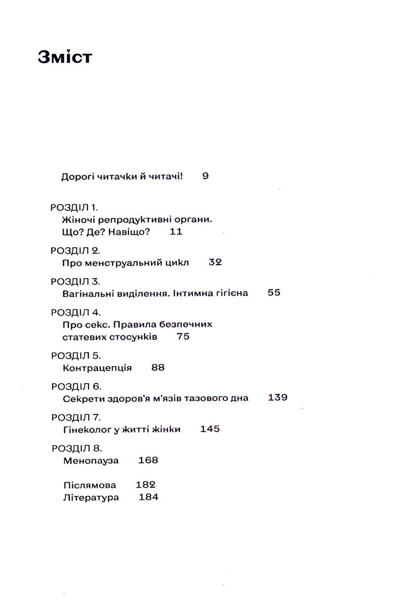 У своїй книжці гінекологиня Оксана Негрич докладно знайомить кожну з її ж власним організмом. Чи нормально відчувати біль при менструації і що з цим робити? Які аналізи варто здавати, аби моніторити ситуацію та чому такий важливий запас яйцеклітин? Як правильно стежити на інтимною гігієною та чи можна завагітніти, годуючи грудьми? Чи потрібно жінкам робити вправи Кегеля, боятися ерозії та як слідкувати за мікрофлорою піхви?
