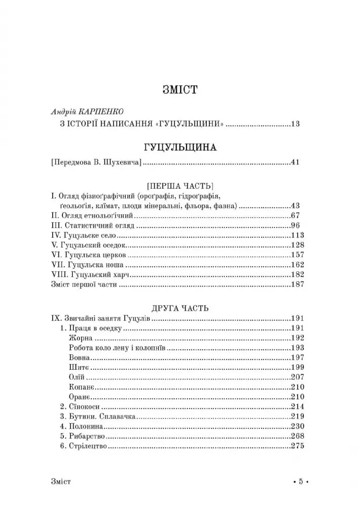 Перевидання фундаментальної праці Володимира Шухевича «Гуцульщина» (у п’ятьох частинах, 1899–1908 рр.) здійснюється репринтним способом і вперше виходить під однією палітуркою. Досі «Гуцульщина» залишається зразком самовідданої праці у справі збереження автентичної української культури та багатющим джерелом знань про традиційне життя гуцулів. Для перевидання написано передмову (Андрій Карпенко) та післямову (Михайло Глушко), що з’ясовують роль пропонованої праці на момент її виходу на початку ХХ ст., а також актуалізують значення «Гуцульщини» сьогодні.