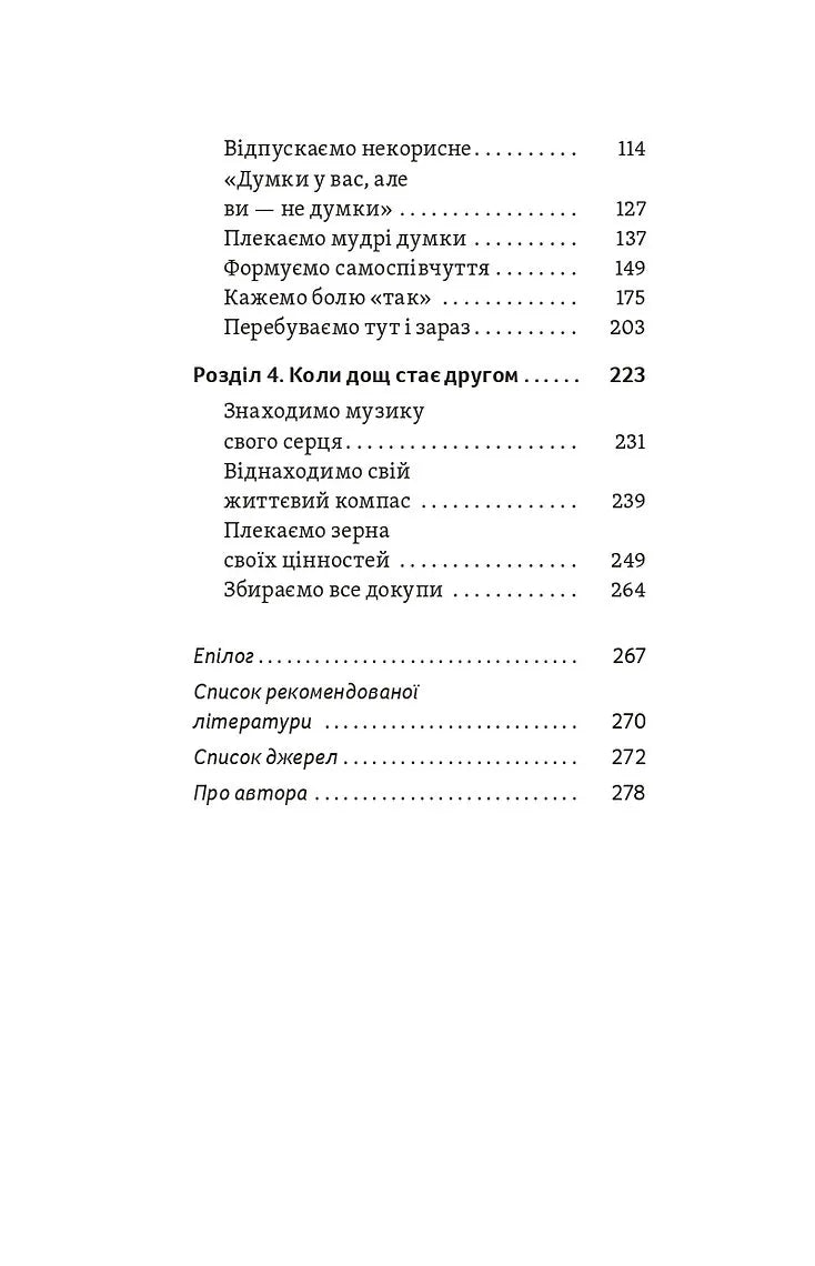 Наш біль як дощ, каже психолог Даниїл Міліковський. Ми не можемо його ані контролювати, ані уникнути, але кожна злива рано чи пізно закінчується.Автор пояснює, що впливає на нашу психіку та що із цього ми можемо контролювати, а що — ні; як прийняти свої емоції й навчитися ними керувати. Книжка вчить мислити гнучкіше та плекати корисні думки навіть у найскладніших обставинах, зберігати внутрішню стійкість і справлятися з деструктивними думками. Поміж історій клієнтів психолог вплітає вправи, які допомагають вирішувати, спираючись на ваші життєві цінності, та рухатись до плідного й наповненого сенсами життя.У своїй книжці Даниїл спирається на техніки з класичної когнітивно-поведінкової терапії, терапії співчуття собі та терапії прийняття й відповідальності.Даниїл Міліковський— практикуючий психолог. Спеціалізується на роботі з тривожними і депресивними розладами, низькою самооцінкою, працює з розладами особистості та травмами, повʼязаними з негативним досвідом у дитинстві.