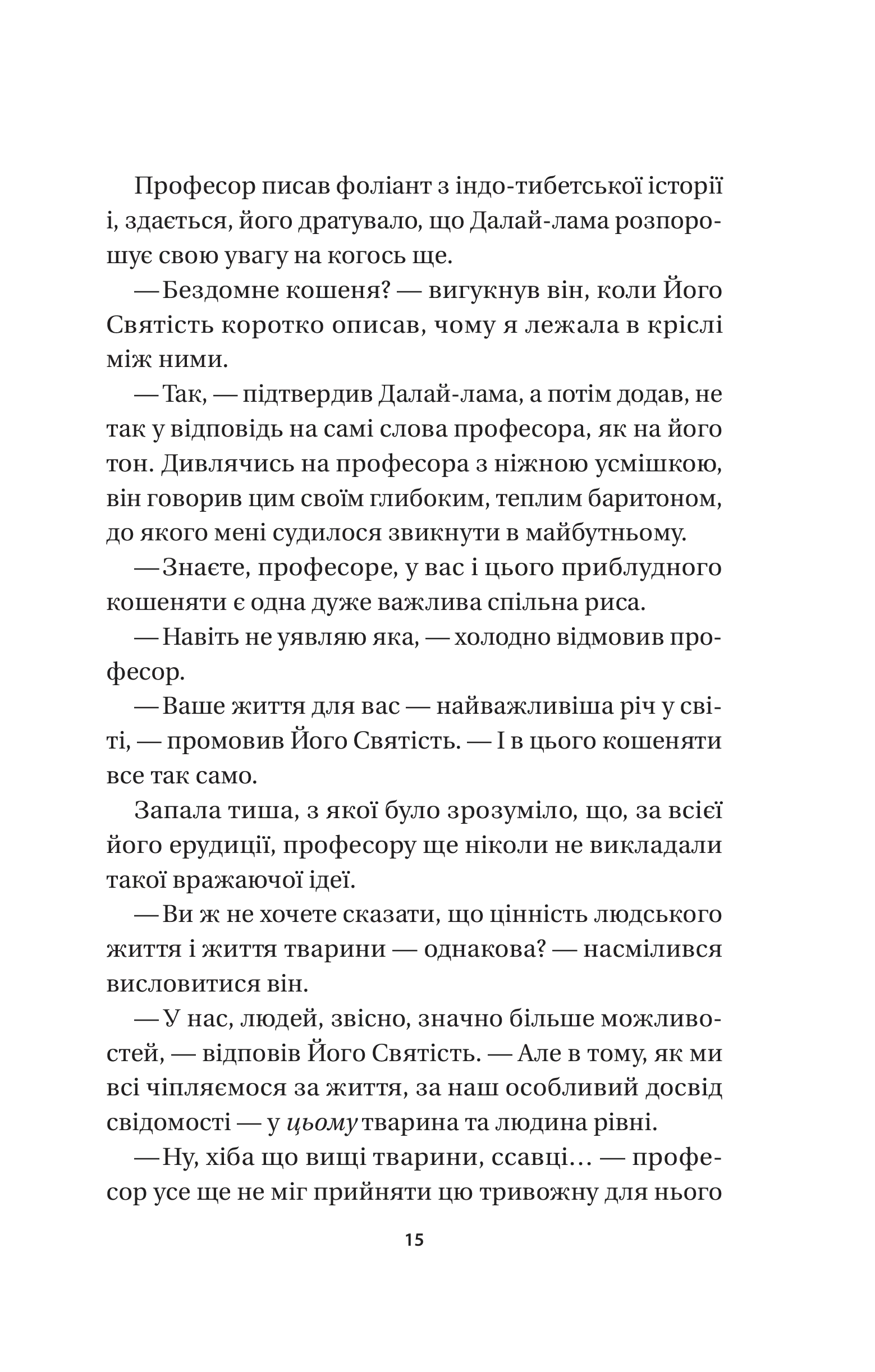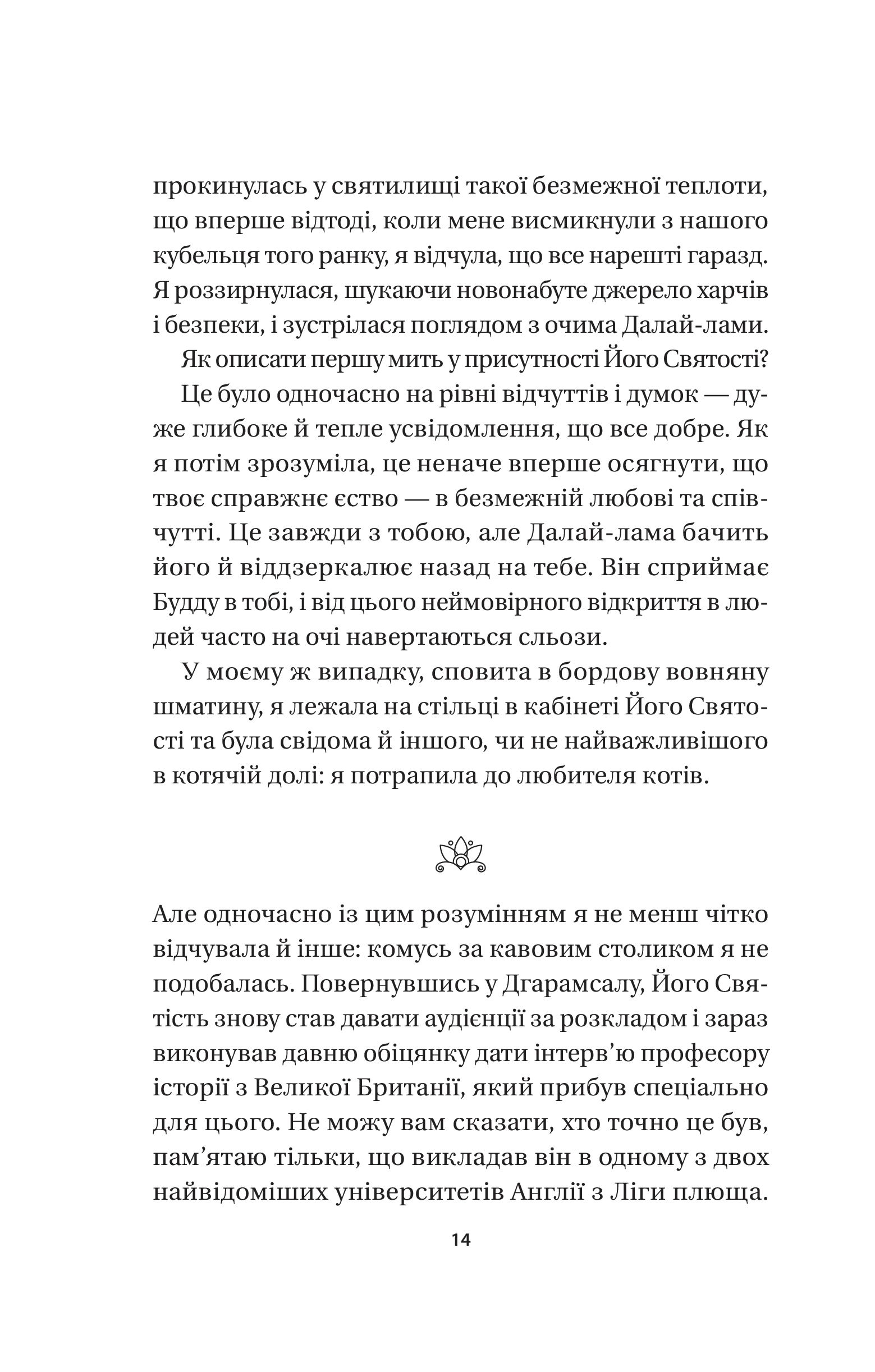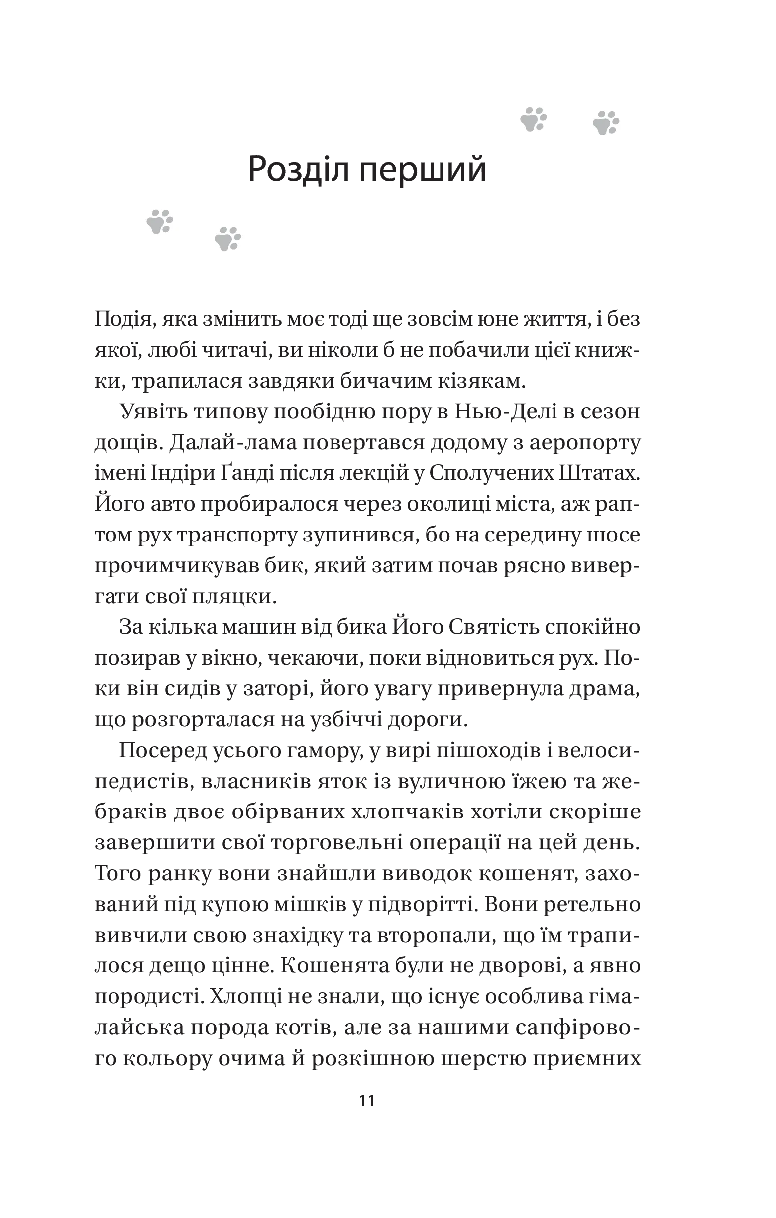 Колись діти загорнули кістляве кошеня в аркуш із газети тижневої давності й викинули на смітник. Але цю сцену спостеріг той самий Далай-лама… І від тоді те кошеня — Кішка Його Святості, живе в Джоканґу, пізнає буддійські вчення. Якщо ви подумали, що зараз ми спробуємо навернути вас у буддизм, то аж ніяк. Бо мета буддизму — дати знання, які допоможуть і католикам, і атеїстам, і котам стати щасливішими. Духовно зростати нелегко, адже дово диться прощатися з упередженнями, дивитися в очі своїм страхам і помилкам, визнавати зацикленість на собі, брати на себе відповідальність за наслідки попередніх дій. Кішка Далай-лами на власні очі бачила, як реальність руйну вала ретельно спроєктовану видимість всесвітньовідомих акторів, філантро- пів, митців, професорів із Ліги плюща, які приходили до Його Святості. Але й помітила, як інший погляд на звичні речі допомагав їм по-справжньому зростати. Тож, хай де б ви жили й хай чого б досягнули в житті, запрошуємо вас у мандрівку до свого щастя в супроводі мудрої Кішки Дала