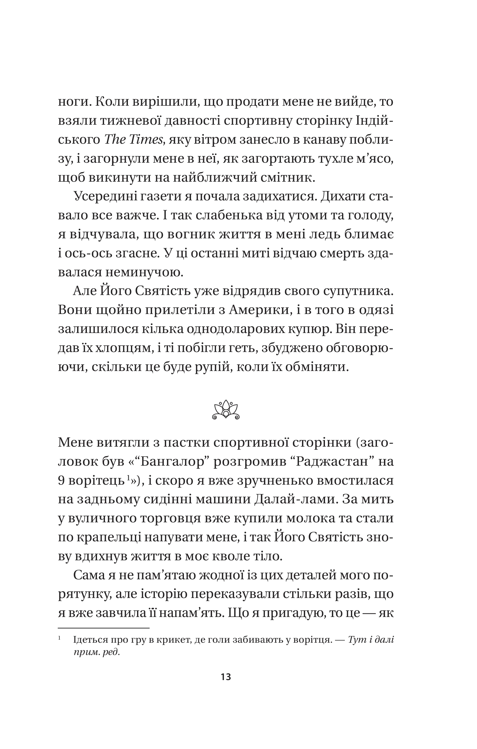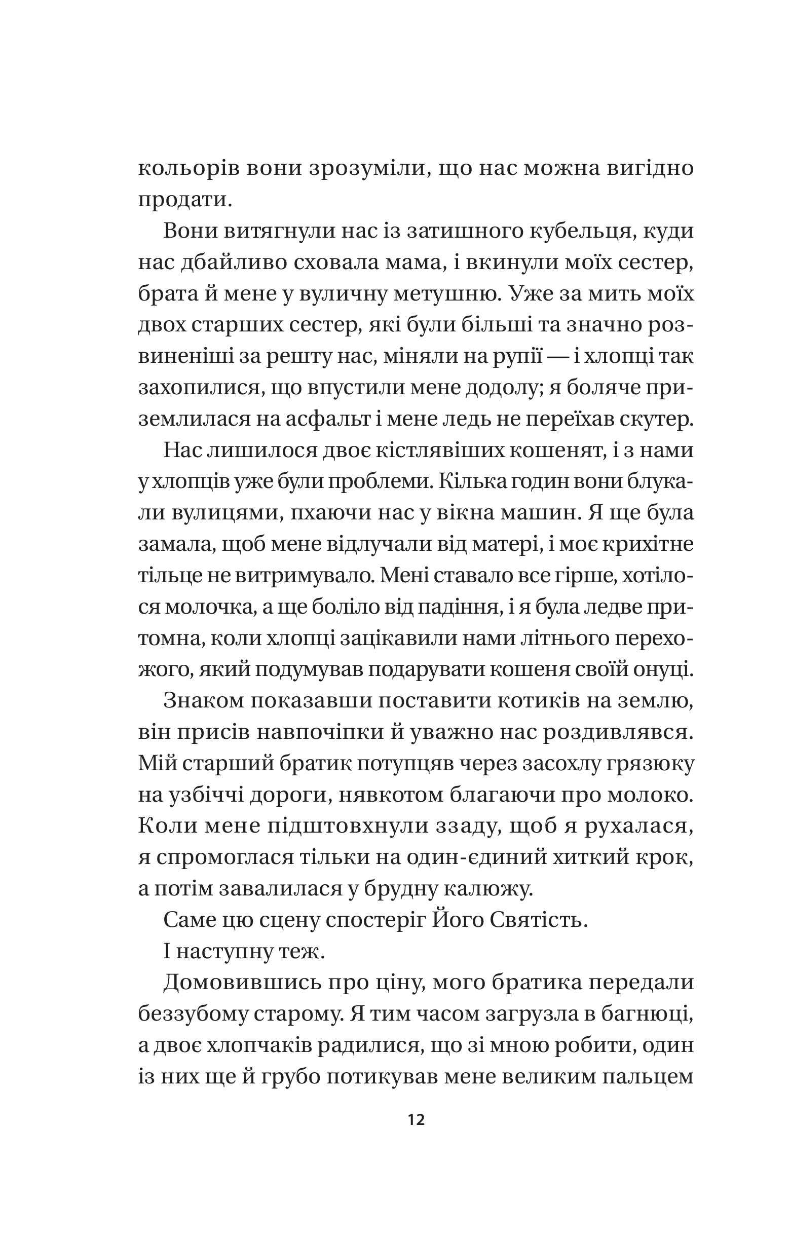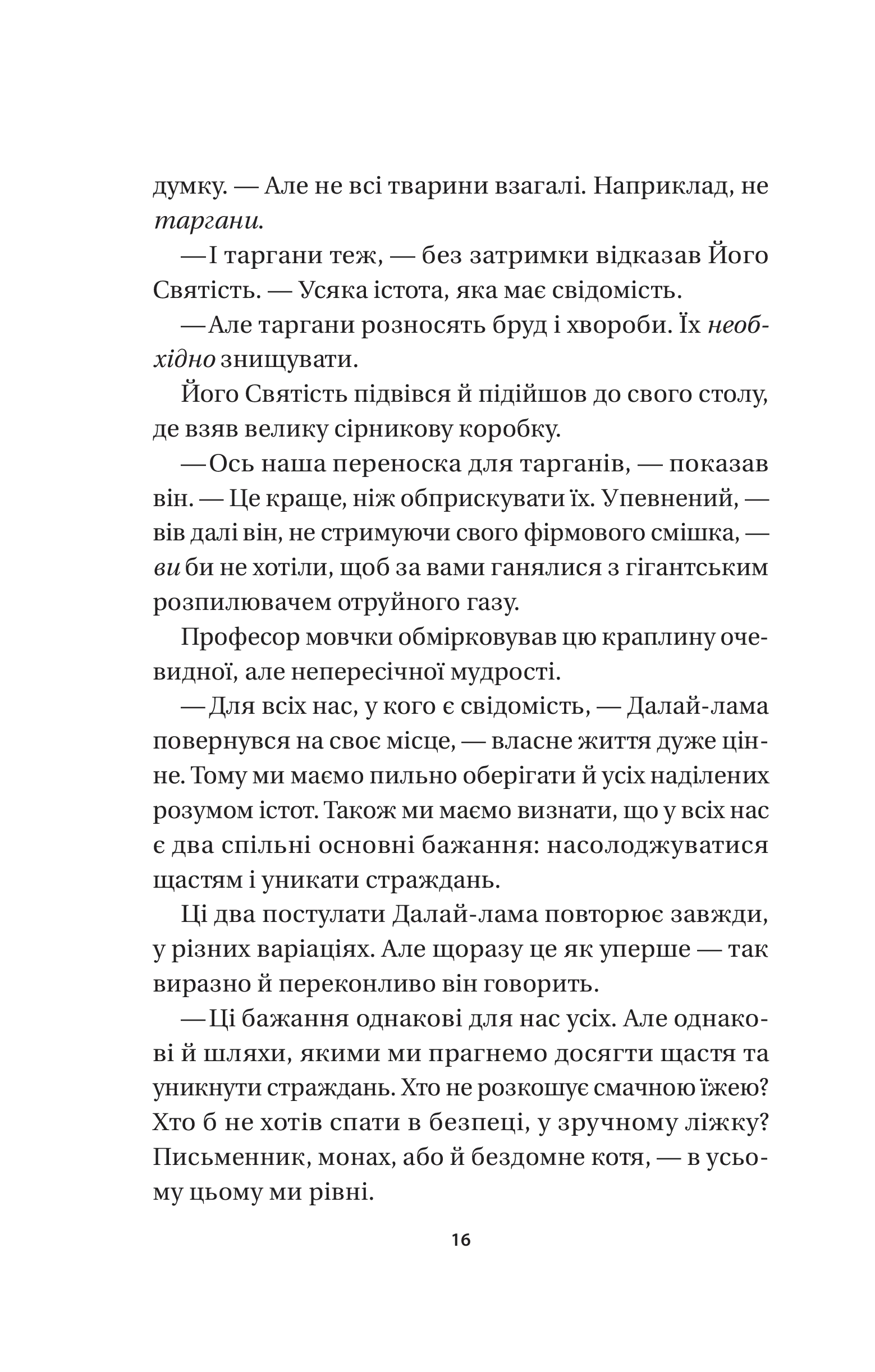 Колись діти загорнули кістляве кошеня в аркуш із газети тижневої давності й викинули на смітник. Але цю сцену спостеріг той самий Далай-лама… І від тоді те кошеня — Кішка Його Святості, живе в Джоканґу, пізнає буддійські вчення. Якщо ви подумали, що зараз ми спробуємо навернути вас у буддизм, то аж ніяк. Бо мета буддизму — дати знання, які допоможуть і католикам, і атеїстам, і котам стати щасливішими. Духовно зростати нелегко, адже дово диться прощатися з упередженнями, дивитися в очі своїм страхам і помилкам, визнавати зацикленість на собі, брати на себе відповідальність за наслідки попередніх дій. Кішка Далай-лами на власні очі бачила, як реальність руйну вала ретельно спроєктовану видимість всесвітньовідомих акторів, філантро- пів, митців, професорів із Ліги плюща, які приходили до Його Святості. Але й помітила, як інший погляд на звичні речі допомагав їм по-справжньому зростати. Тож, хай де б ви жили й хай чого б досягнули в житті, запрошуємо вас у мандрівку до свого щастя в супроводі мудрої Кішки Дала