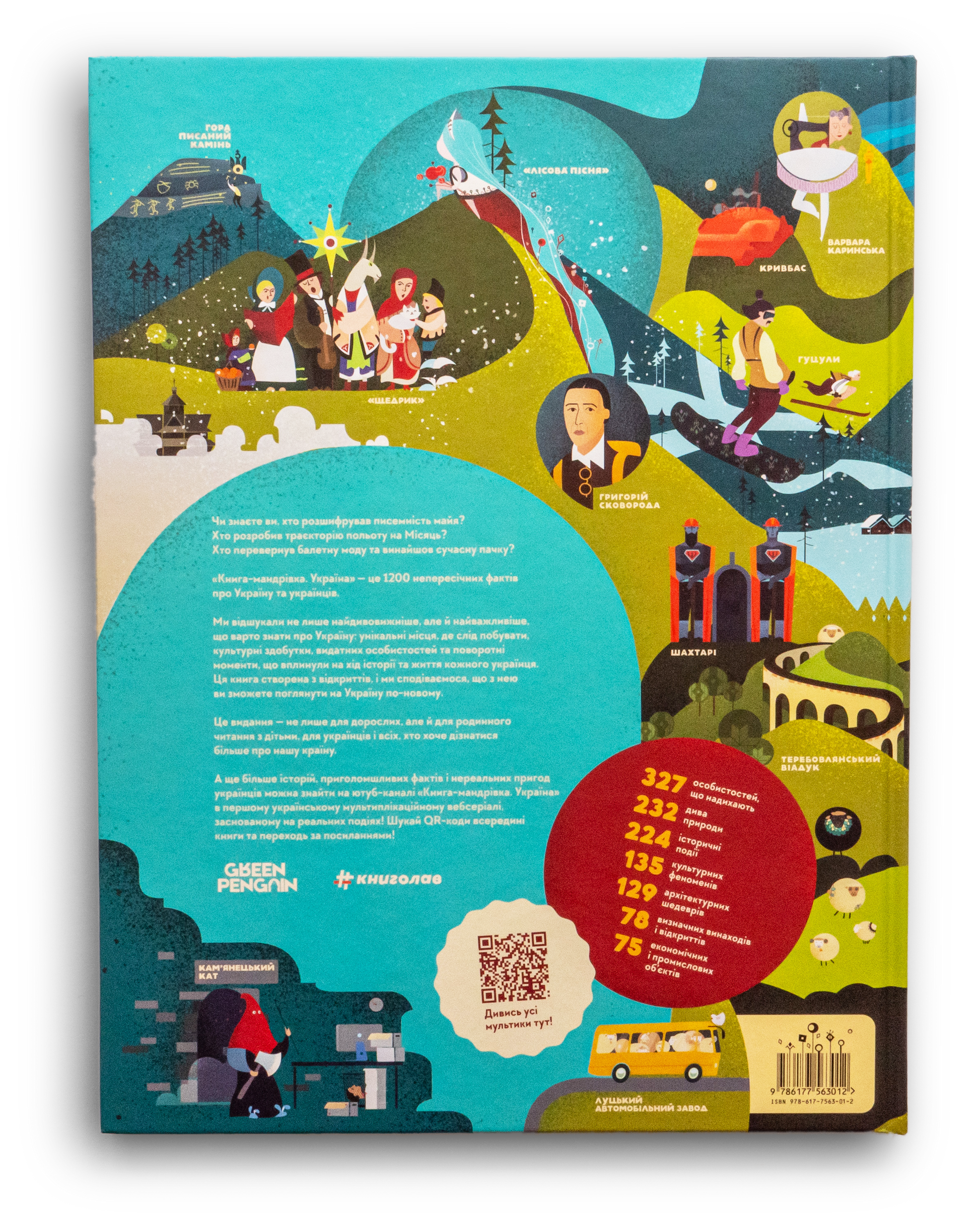 «Книга-мандрівка. Україна» — це 1200 непересічних фактів про Україну та українців. Ми відшукали не лише найдивовижніше, але й найважливіше, що варто знати про Україну: унікальні місця, де слід побувати, культурні здобутки, видатних особистостей та поворотні моменти, що вплинули на хід історії та життя кожного українця. Ця книга створена з відкриттів, і ми сподіваємося, що з нею ви зможете поглянути на Україну по-новому. Це видання — не лише для дорослих, але й для родинного читання з дітьми, для українців і всіх, хто хоче дізнатися більше про нашу країну.