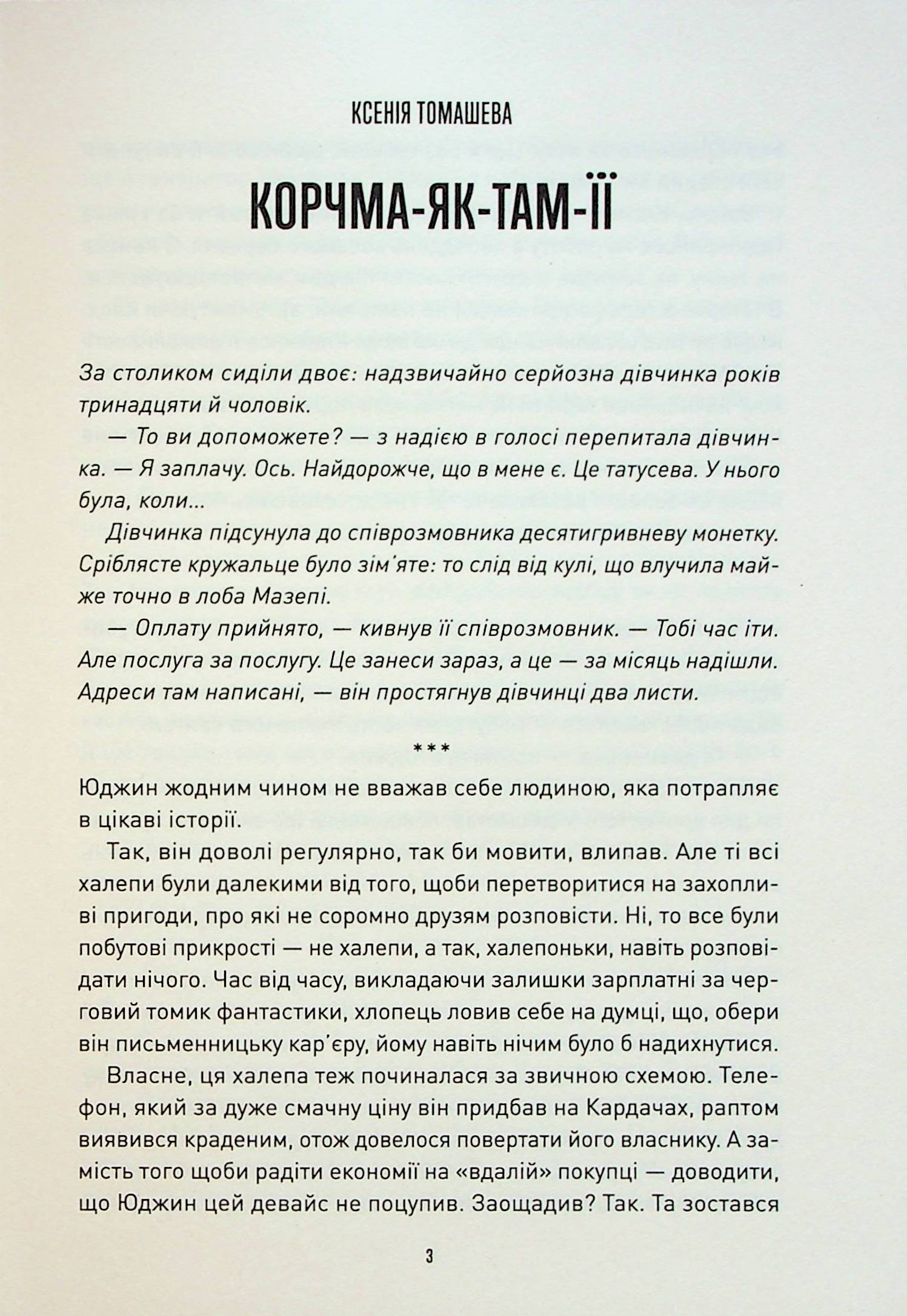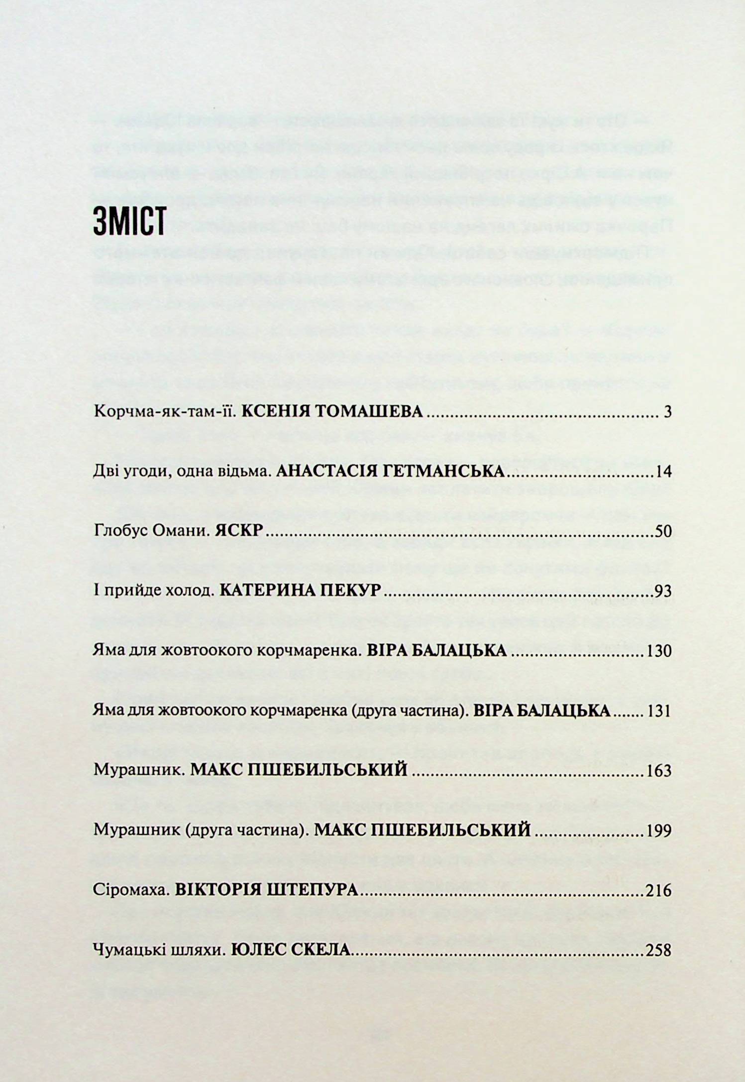 Збірка української фантастики, справжній роман в оповіданнях, який ламає четверту стіну! Є на світі Корчма, куди люди та істоти з різних світів і часів потрапляють, аби розповісти свої історії. Але що, як новим Корчмарем стане звичайний український парубок? Ні, нічого такого, заклад встоїть і навіть не перестане функціонувати. А от місцевий сервіс помітно покращиться: тепер до послуг гостей і корчмарські вуха, охочі до цікавих історій, і на додачу неочікувані корчмарські поради щодо вирішення їхніх проблем. Новенькому ж Корчмареві доведеться не тільки давати раду місцевій кавомашині, а й розбиратися з природою місця, частиною якого він став. А ще з’ясувати, ким був його попередник на посаді та чому пішов поспіхом, навіть не передавши справи, і до чого тут сучасна Україна. Класичне, міське та українське фентезі, магічний реалізм, постапок, кіберпанк, м’яка наукова фантастика від одинадцяти українських авторок та авторів сплетуться разом, щоб розповісти про людей (та інших істот), які наважилися діяти й змінювати світ.