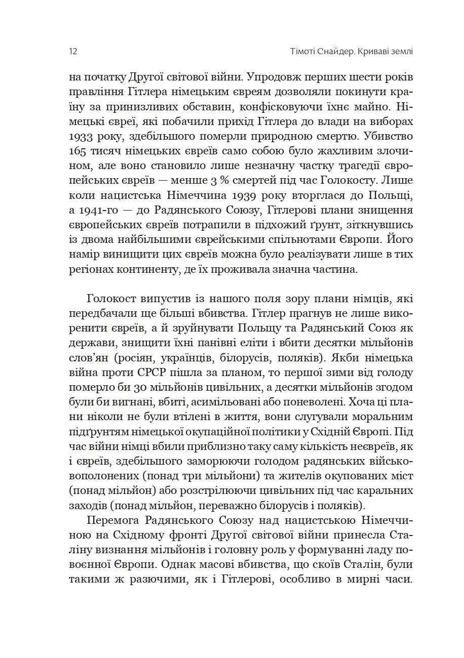 У серці Європи посеред ХХ століття нацистський та радянський режими вбили близько 14 мільйонів людей. Криваві землі, місце загибелі всіх жертв, охоплюють простір від Центральної Польщі до Західної Росії: Україну, Білорусь та країни Балтії. Під час зміцнення націонал-соціалізму та сталінізму (1933–1938), спільної німецько-радянської окупації Польщі (1939–1941), а потім німецько-радянської війни (1941–1945) на цей регіон зійшло масове насилля у небачених в історії масштабах. Жертвами його стали головно євреї, українці, поляки, білоруси, народи країн Балтії. Дослідження авторитетного американського історика Тімоті Снайдера узагальнює найтрагічніші сторінки в історії Східної Європи ХХ століття.