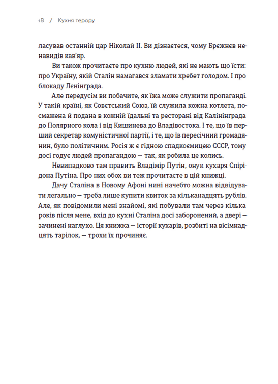 Для написання цієї книжки відомому польському репортерові Вітольду Шабловському довелося свого часу об’їздити Росію, Україну, Білорусь та інші радянські республіки. Він спілкувався з особливими кухарями — Віктором Бєляєвим, який контролював кремлівську кухню, із тими кухарями, які працювали в часі воєн, що розв’язала Росія, з кухарками Чорнобиля, а також тими, які пережили й запам’ятали на все життя часи Сталінського Голодомору в Україні. Та власне через кухонні двері можна так добре показати не лише людські історії, смакові звички чи вподобання кухарів і тих, кому вони готували, а й маніпулятивні механізми влади — жорстокої та безжальної, зосередженої в руках божевільних вождів, генсеків та інших радянських партійних діячів.