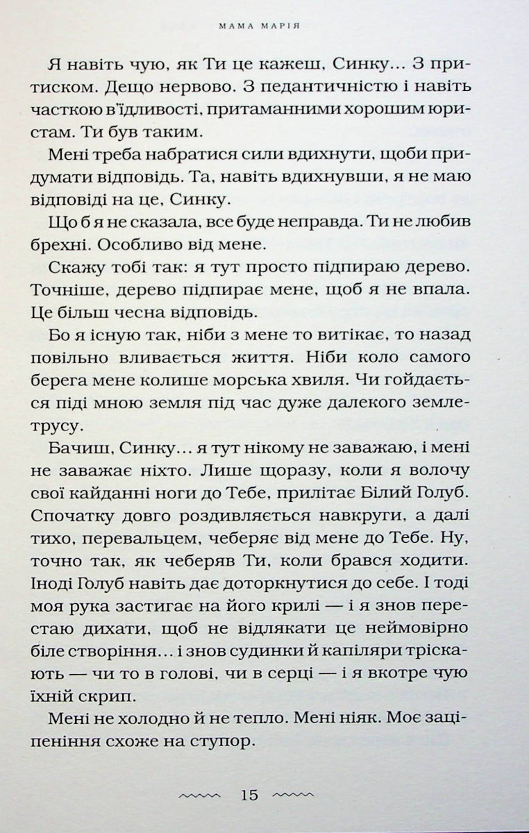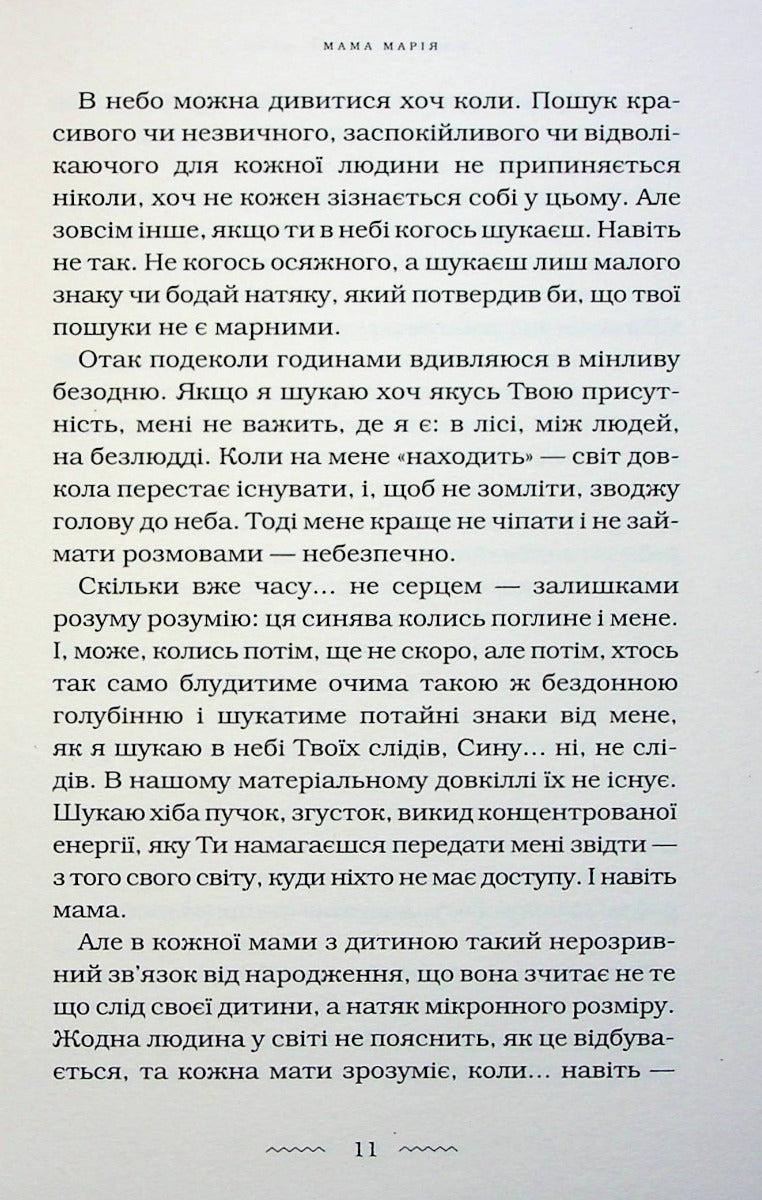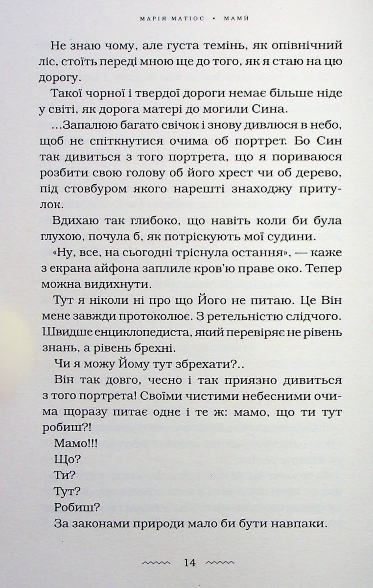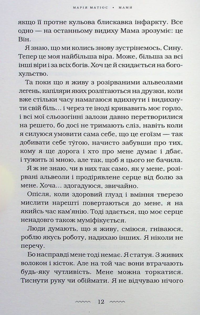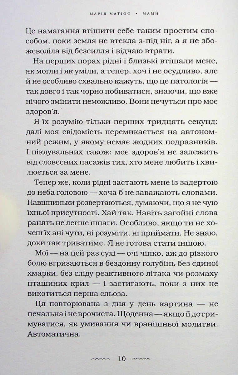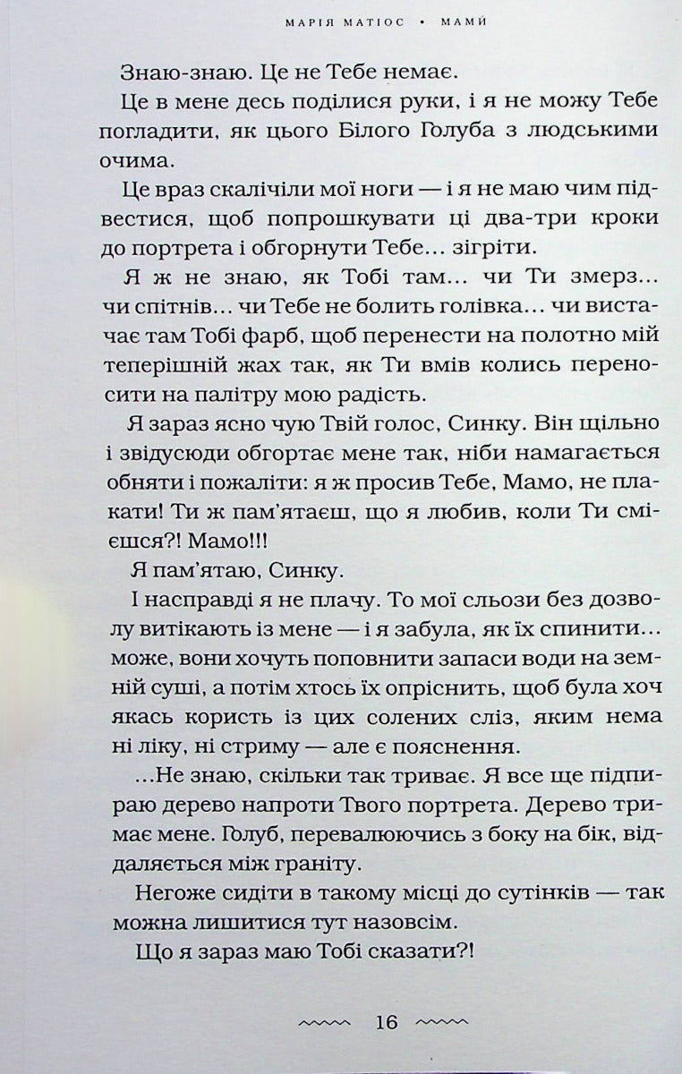 У своїй новій книзі Марія Матіос розповідає історії п’яти жінок. Усі вони — різні, у кожної своя доля, але об’єднує їх одне — найстрашніше, що може спіткати маму, — втрата єдиного сина. Кожна переживає горе по-своєму, а разом вони доповнюють одна одну і розкривають усю глибину й розпач трагедії осиротілого материнства.