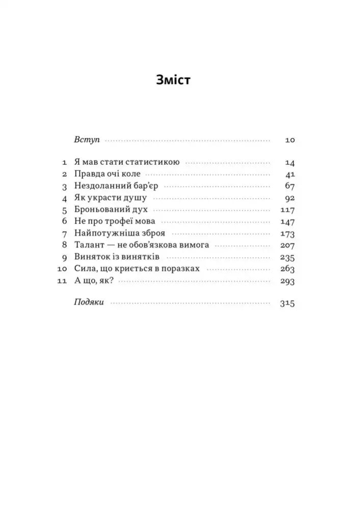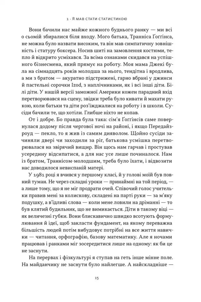 Дитинство Девіда Ґоґґінса було справжнім пеклом: ледь рухався після батькового паска, заїкався, учителі вважали його розумово відсталим, а однолітки цькували за колір шкіри. Та депресивний юнак із надмірною вагою і без майбутнього все-таки знайшов свій шлях. У цій книжці автор відверто розповідає про його торування: як видобував внутрішню стійкість, розвивав дисципліну й занурювався в біль, а потім виходив за його межі.Боротьба Ґоґґінса з власними фізичними та психологічними обмеженнями — його унікальний шлях із максимально практичним підходом до трансформації мислення завдяки таким нетиповим технікам, як «Дзеркало відповідальності», «Банка для печива» і «Правило 40 відсотків». Ці потужні інструменти допоможуть читачеві побороти свої страхи, краще використовувати внутрішні резерви і перетворити біль у паливо для постійного руху вперед.Про автораДевід Ґоґґінс— американський військовий у відставці. Учасник бойових дій в Іраку й Афганістані. Ультрамарафонець, тріатлоніст, член Міжнародної зали спортивної слави за досягнення у спорті. Встановив світовий рекорд Гіннеса, підтягнувшись 4030 разів за 17 годин.Автор двох книжок, загальний наклад яких становить близько 7 мільйонів примірників.Відгуки«Сучасна нейронаука вчить нас, що шлях до мужності й успіху лежить через прийняття болю і страху, а не через їх уникнення. У невпинному прагненні перемагати себе Девід Ґоґґінс навчився перепрограмовувати власний мозок так, щоб ставати кращим, незалежно від відчуттів, зовнішніх умов чи мотивації. «Мене не зламати» — чудовий опис цієї подорожі та здатності вдосконалювати свій розум»,— Ендрю Д. Губермен, доктор філософії, професор нейробіології Школи медицини Стенфордського університету, автор книжки «Протоколи»«Девід Ґоґґінс доводить, що ваше тіло може впоратися з будь-чим, якщо ви дасте розуму змогу не відставати. Неможливо зупинити того, хто не розуміє, що таке «бути переможеним»»,— Маркус Латтрелл, «морський котик» у відставці, автор бестселера «Вцілілий»ЦитатиУсе в житті — випробування на міцність духу! Коли великі й малі життєві драми вибивають у нас землю з-під ніг, ми забуваємо: хоч би як сильно боліло й завдавало тортур, усе погане закінчується. А забуваємо ми про це в ту мить, коли віддаємо контроль над нашими емоціями й учинками іншим. Це легко, коли тобі нестерпно болить. Курсантам, які здалися на «пекельному тижні», здавалося, що вони ганяють на викрученій на максимальні налаштування біговій доріжці, а до кнопок не дотягнутися. Та вони стали жертвою ілюзії — знали про це чи ні.Наша культура підсіла на швидкі рішення, лайфхаки, ефективність. Усі постійно шукають простий алгоритм, який дасть максимум результату за мінімуму вкладених зусиль. Не сперечатимуся, певного успіху можна досягти й так — якщо пощастить. Але загартованого духу чи панування над собою в такий спосіб не здобути. Якщо ви хочете стати хазяїном свого мислення і прибрати обмежувач — доведеться підсісти на важку працю. Бо любов до свого діла, одержимість ним, навіть талант — усі вони корисні, лише якщо підкріплені працьовитістю.Більшість із нас має з біса мотивації піти за мрією, аж допоки оточення не нагадає про небезпеки, мінуси, обмеження та всіх людей до нас, яким не вдалося. Інколи кажуть це з найкращими намірами. Справді вірять, що вчиняють так зара