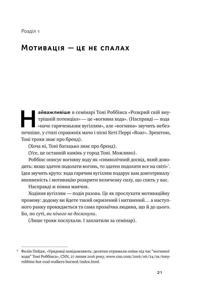 Джеф Гаден показує нам, як переосмислити наше мислення про відносини мотивації до успіху. Він дає поради тим, хто тільки визначив велику мету свого життя, і тим, хто невпевнений у своєму шляху, і тим, хто обпікся на незліченних книгах з самопомічі, які насправді ніяк не допомогали. Автор пропонує практичні поради, які кожен може використовувати, щоб зробити невеличку перерву, осягнути все, що відбувається в житті, щоб після цього почати ще більше і продуктивніше працювати над своїми мріями.