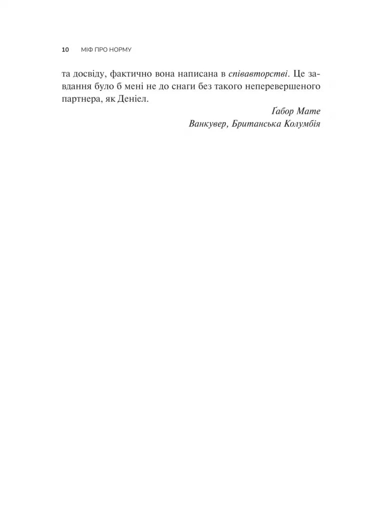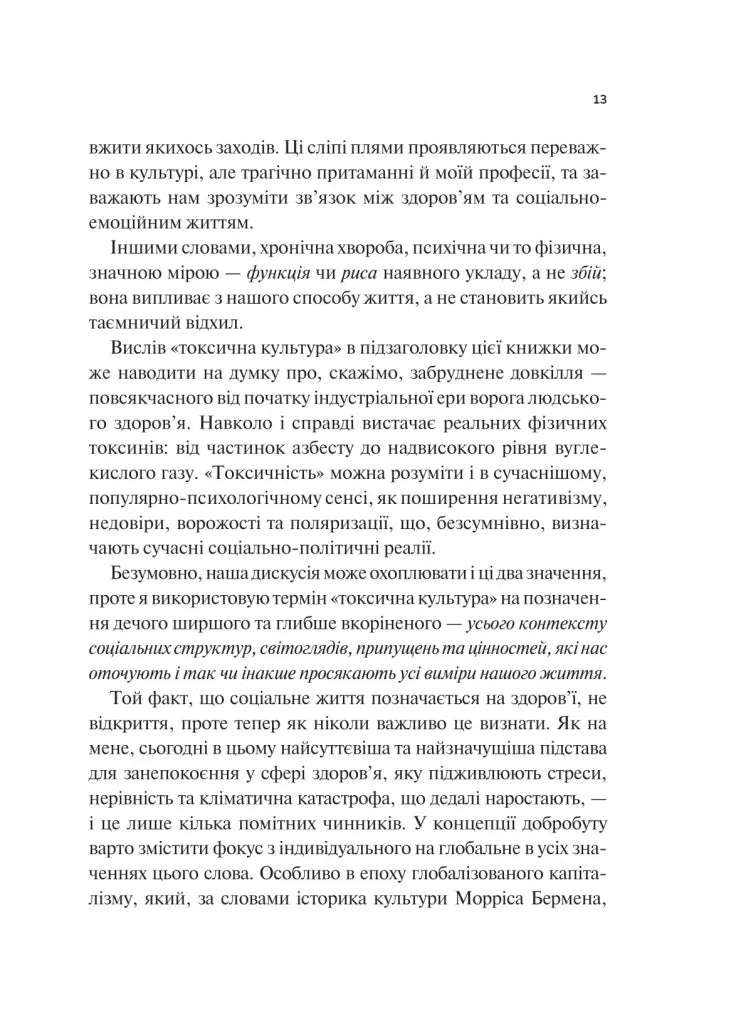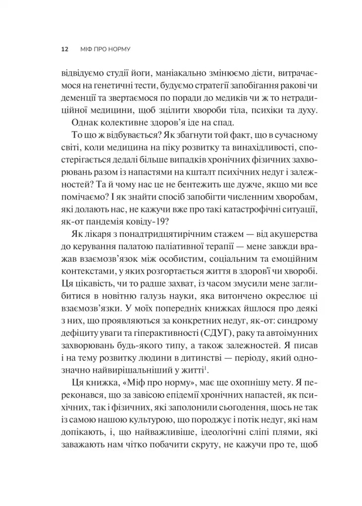За понад тридцять років лікарської практики Ґабор Мате дійшов висновку, що панівне розуміння норми хибне. У сучасному світі розвиненої медицини кількість випадків хронічних захворювань, психічних розладів і залежностей… невпинно зростає. На наші психіку й здоров’я впливають травми, стрес і стиль життя. Послуговуючись лише досвідом і технічними надбаннями, неможливо вилікувати людину повністю, бо такий підхід ігнорує токсичний вплив сучасної культури. Ґабор Мате в співавторстві із сином Деніелом пропонує власний погляд на поширені навколомедичні міфи, демонструє зв’язок між хворобами окремих людей і погіршенням здоров’я суспільства в цілому. Ця книжка допоможе розібратися:що таке норма й чи вона взагалі існує;чому, попри те що людство надмірно переймається здоров’ям, колективне здоров’я занепадає;як на нас впливають травми й стрес;чи можливо зцілитися від хвороб і позбутися обмежувальних переконань.«…Епічна подорож, сповнена відкриттів про те, як наш емоційний добробут і соціальні зв’язки тісно переплітаються зі здоров’ям, хворобами й залежностями»,— Бессел ван дер Колк, доктор медичних наук«Інтелектуальне й співчутливе дослідження того, хто ми й ким можемо стати. Обов’язково читати кожному!»,— Тара Вестовер, авторка бестселерівДетальніше про книгуКнига «Міф про норму: травма, хвороба та зцілення в токсичній культурі» — це нонфікшн про фізичне, психічне, емоційне здоров'я та їхній взаємозв'язок. Автори — канадський терапевт-практик Ґабор Мате і його син Деніел Мате. У праці вони фокусуються на проблемі життєвих травм, впливу суспільства на ментальне здоров'я та вдаються до критики сучасної медицини, яка занадто мало уваги приділяє психологічному стану кожного пацієнта. Також автори розглядають поняття норми, і чому загальноприйняте «нормально» зовсім не означає «здорово», а іноді й суперечить здоровому підходу.Життя під тиском, або чому медицина досі не впоралася із загрозливими захворюваннямиАвтори переконані: тіло й психіка людини не просто взаємопов'язані — вони один механізм. Поширене розуміння норми є хибним, вважає Ґабор Мате, адже воно виносить за дужки вплив стресу, травм і тиску сучасного життя.Людство сягнуло надзвичайного прогресу в технологіях і медицині, здобуло тисячолітній досвід у подоланні захворювань різного генезу, а країни Заходу пишаються своїми розвиненими системами охорони здоров'я. Утім, хронічні фізичні, психічні й психосоматичні захворювання й розлади продовжують прогресувати, перетворюючись на справжню епідемію. Депресії, емоційне вигорання, тривожність і панічні атаки, серцево-судинні та аутоімунні захворювання, гормональні збої… Подолати їх остаточно не вдається через нерозуміння цілісності людини, єдності її тілесного й ментального.Першопричина хвороби: токсичність суспільства як головний фактор стресуПобудувати здоровіше суспільство можна, якщо припинити нехтувати токсичністю сучасної культури. Надмірний тиск соціальних очікувань, нереалістичні стандарти щодо зовнішності чи статків, негаразди у родині, хронічний стрес і пригнічення емоцій — усе це обтяжує імунну систему та підриває емоційну рівновагу.Психічний стан напряму впливає на вивільнення гормонів, кров'яний тиск, імунну систему та функціонування органів. У книзі «Міф про норму» Ґабор Мате, Ден
