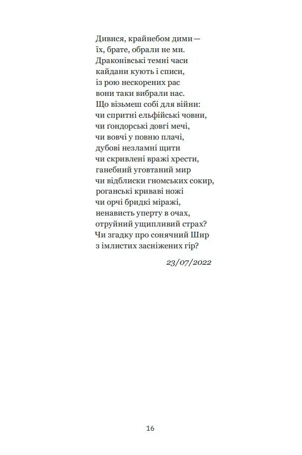 Проза й поезія військових, я переконаний, це — література, за якою будуть вивчати сучасну історію України. Це література, читаючи яку, майбутні покоління будуть знати правду. Це література пам’яті та боротьби. Хроніка відчуттів, ритмів, пульсації на межі життя і смерті. Це література про те, хто ми і звідки. І нині ця література, як би пафосно не звучало, — зброя в боротьбі за незалежність нашої держави, бо:Коли янголи прилетять, у них не буде багато завдань:згадати твої прямі і дивні шляхи, падіння і злети,знайти твої відповіді на запитання і вагомість цих запитань,і хто їх тобі підбирав, які праведники і які поети.