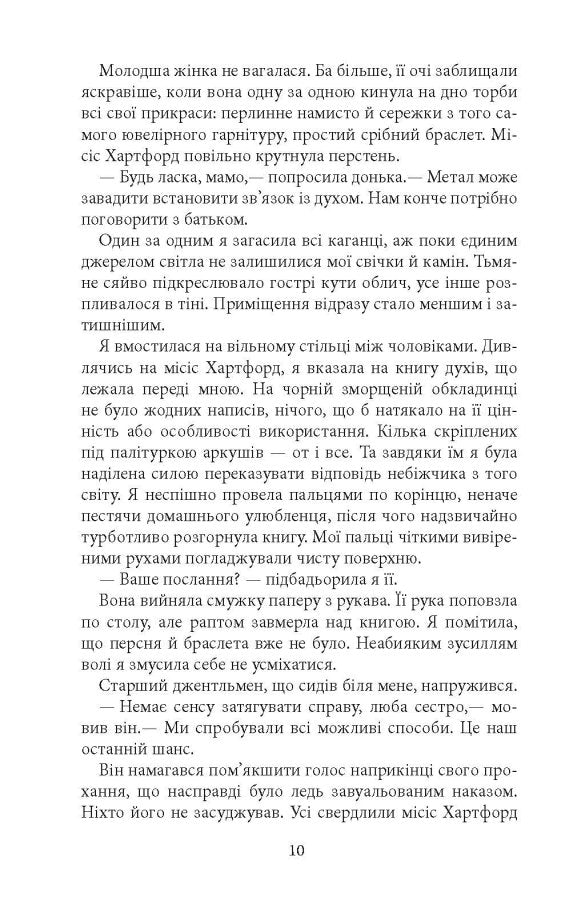 «Моторошне сяйво» — це захоплива готична детективна гра, що розгортається у вікторіанському Лондоні середини XIX століття. Зловісна суміш химерних таємниць, сирий середньовічний особняк, привиди, секретні тунелі, зради, п’янка романтика — у цій книжці є все, що робить читання захопливим. Але головне тут — образ героїні, жінки складної долі, пов’язаної із кримінальним світом, яка заробляє на життя тим, що вдає досвідченого медіума й таким чином проникає в сім’ї, які нещодавно втратили близьку людину. Поки нарешті не настає момент, коли їй доводиться перетворитися із фіктивного медіума на справжнього детектива. Фінал роману канадської письменниці є настільки несподіваним, переконливим та ефектним, що читачеві залишається лише розвести руками.