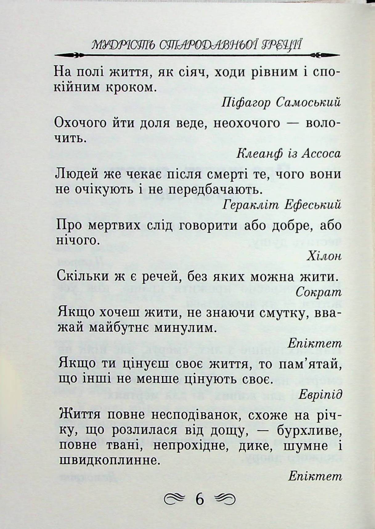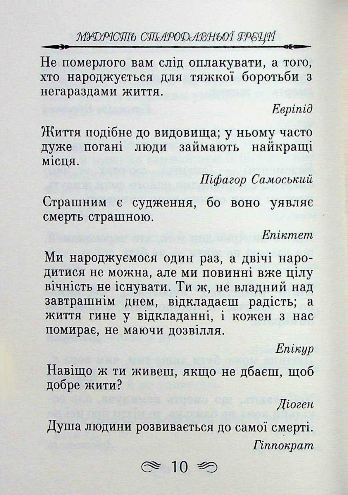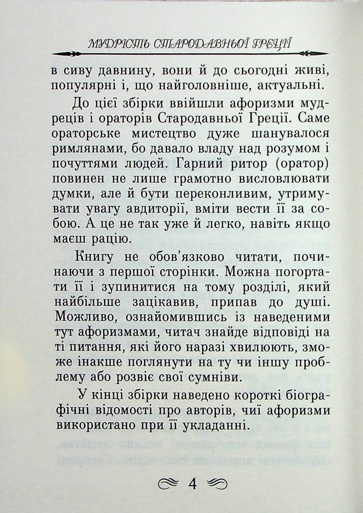 До цієї збірки ввійшли афоризми давньогрецьких філософів, письменників і політичних діячів. У цих лаконічних, але глибоких за змістом висловлюваннях відображено знання людства, накопичені впродовж тисячоліть. Створені ще за часів Стародавньої Греції, вони й сьогодні актуальні, адже допомагають вирішувати нагальні проблеми і завдання повсякденного життя. У кінці збірки подано короткі біографічні відомості про авторів наведених афоризмів. Книга призначена для широкого кола читачів.