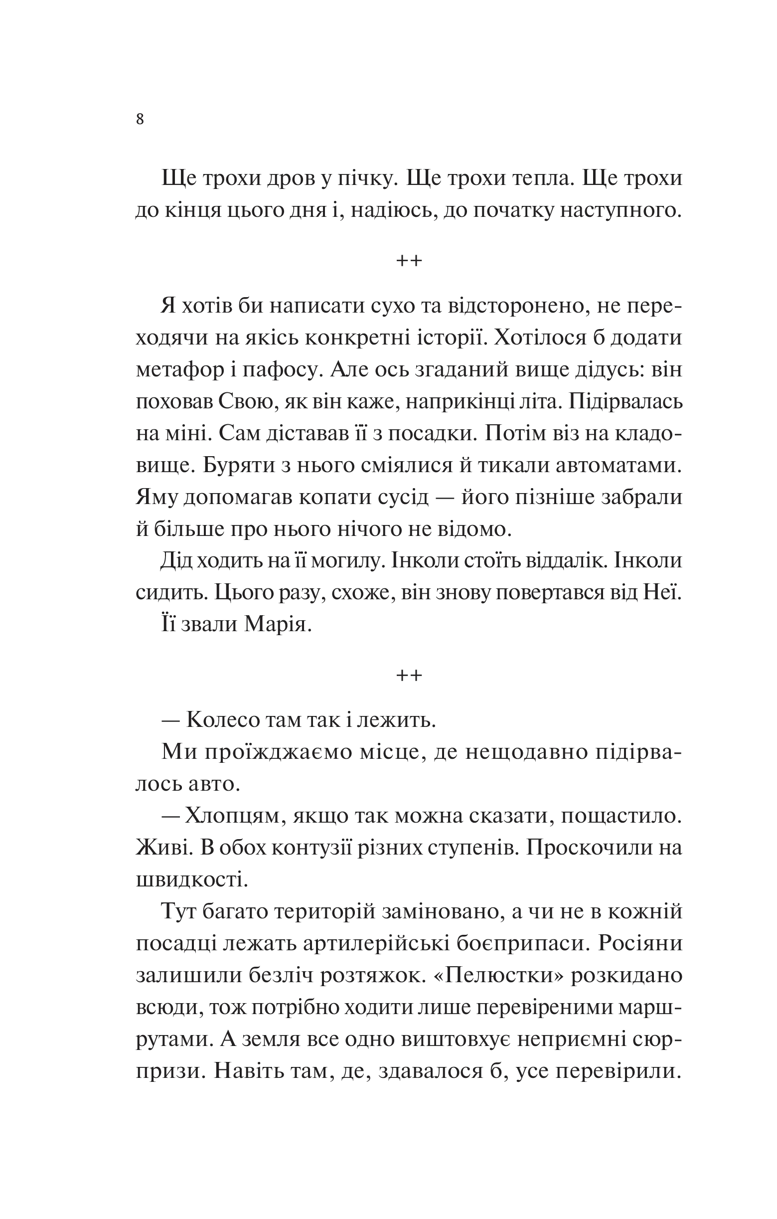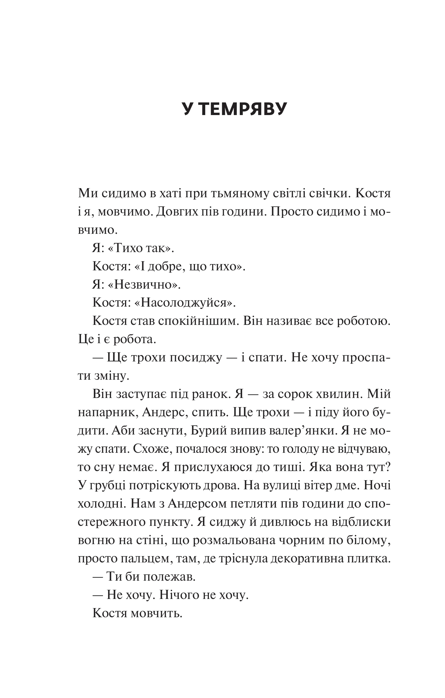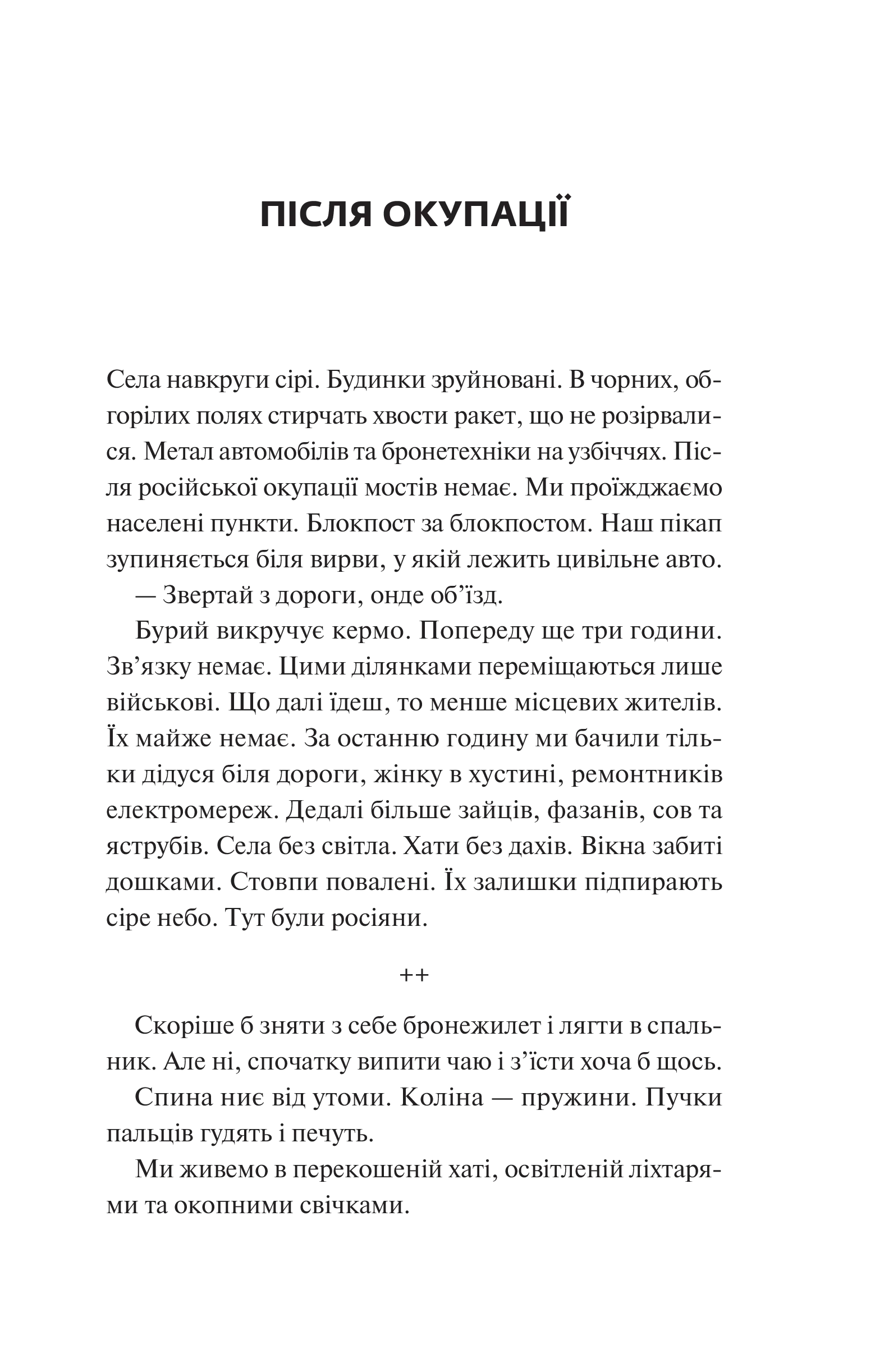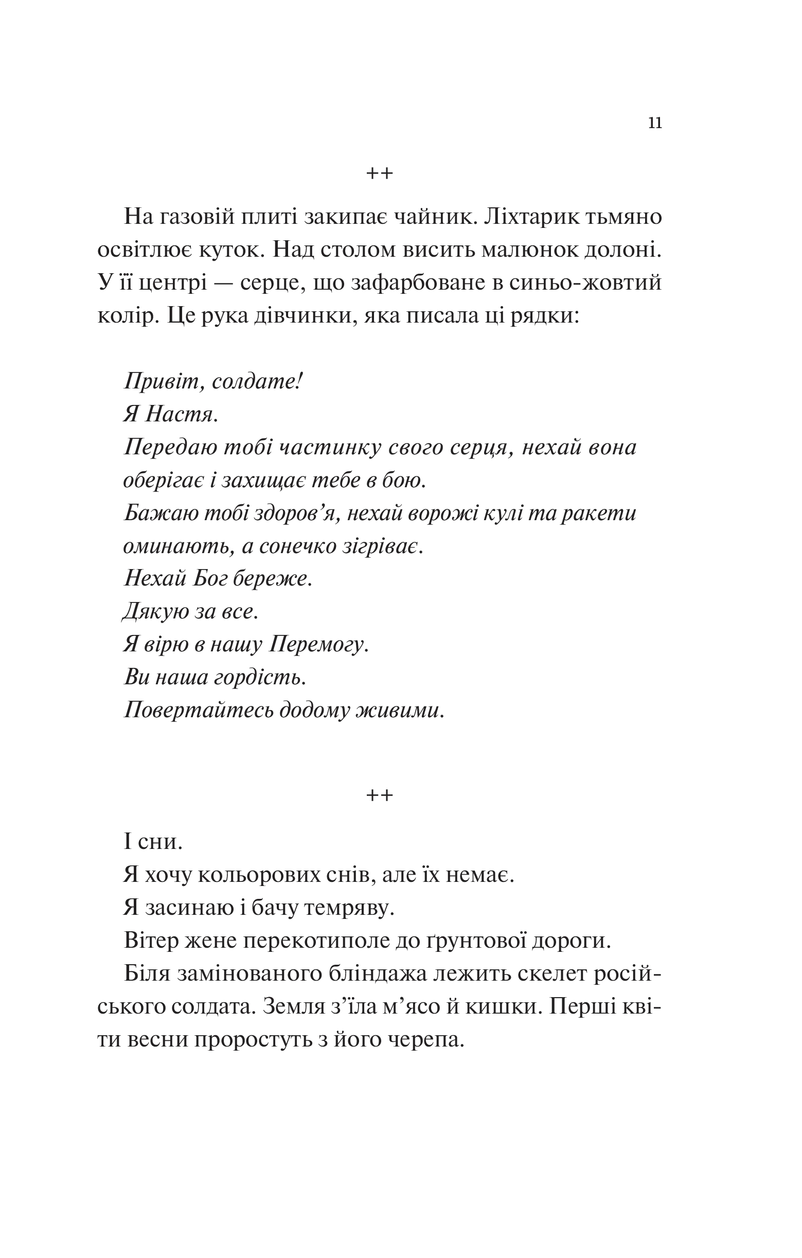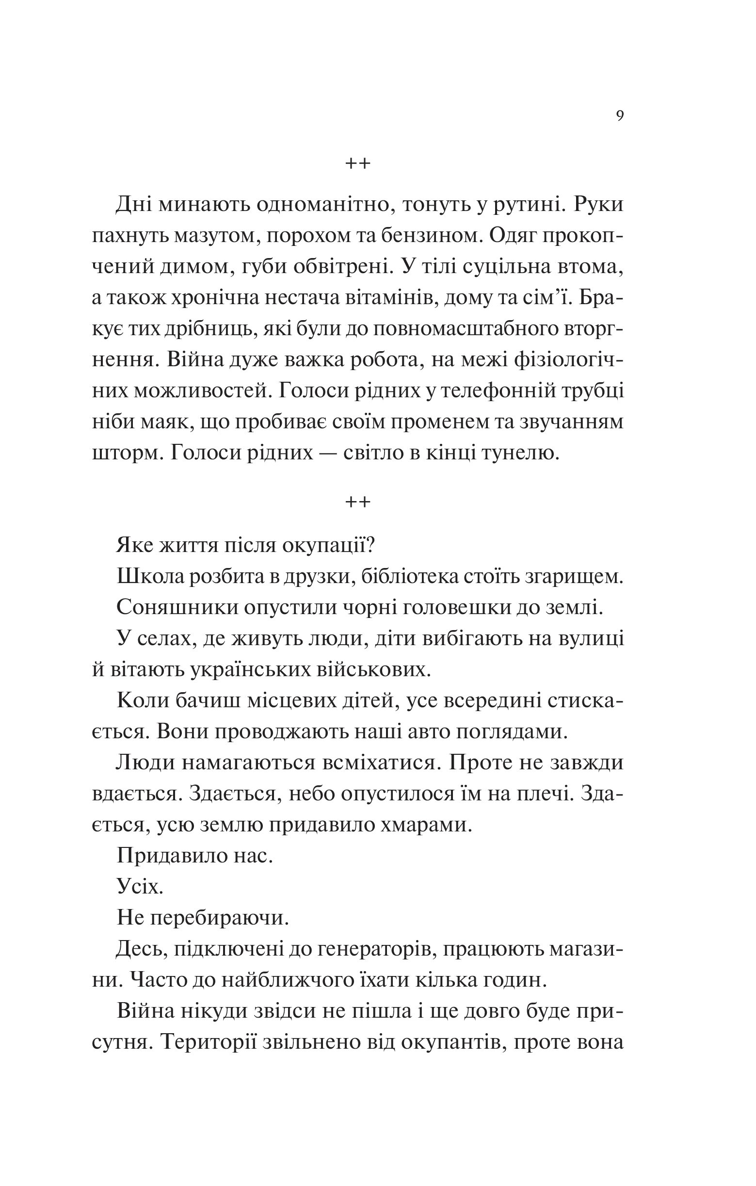 Це лаконічні історії про військових і цивільних, про те, як довіряти своє життя побратимам і незнайомцям, про звичайні буденні радості: можливість малювати, обіймати кошеня, не боятися тиші. Про обов'язок і вірність, утому і щастя, близькість смерті й наповненість життя.