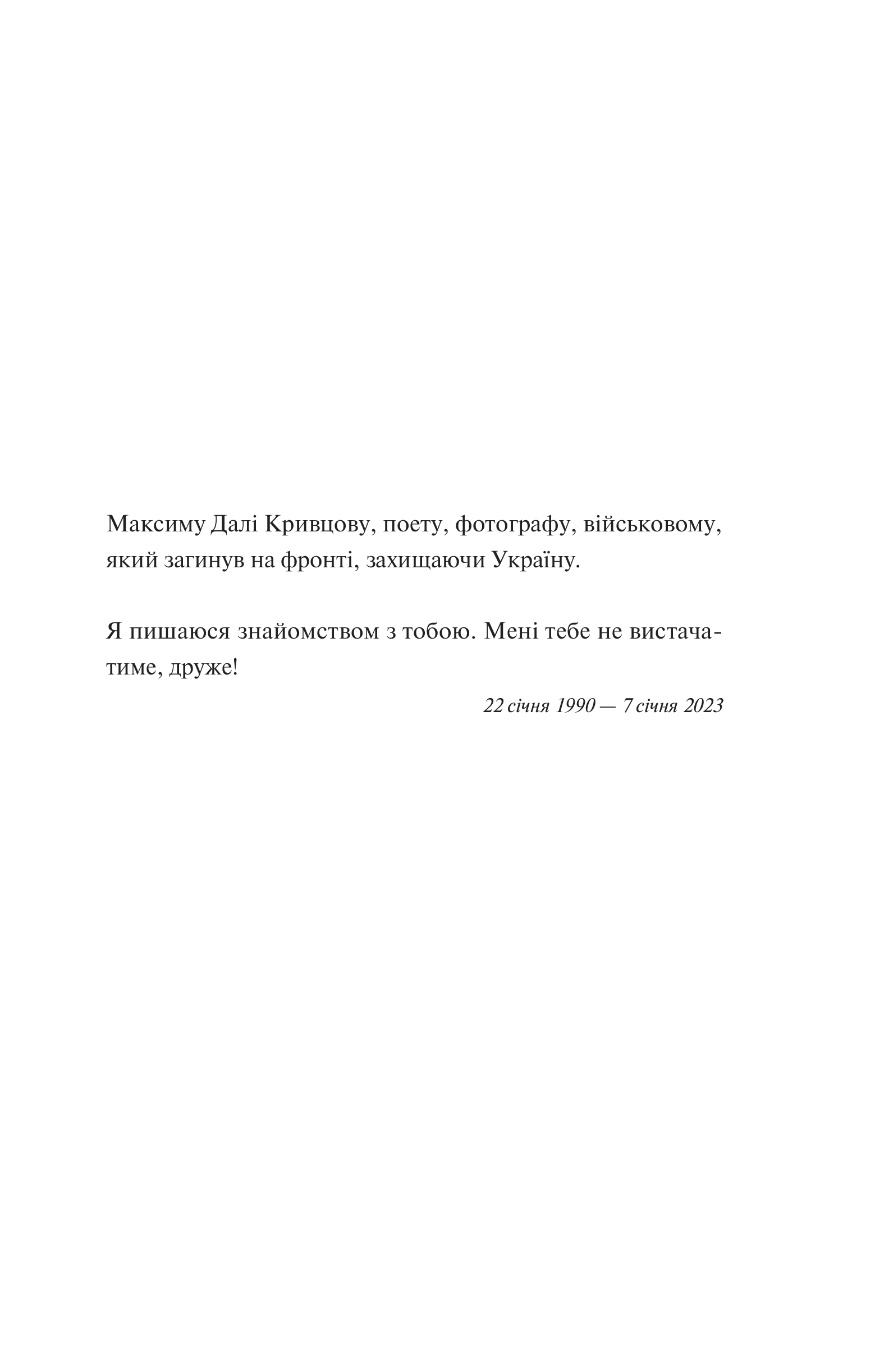 Книжку присвячено Максиму «Далі» Кривцову, поету і військовослужбовцю, який загинув у січні 2024 року.