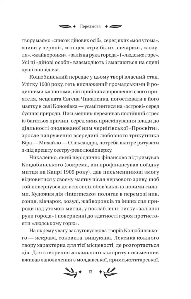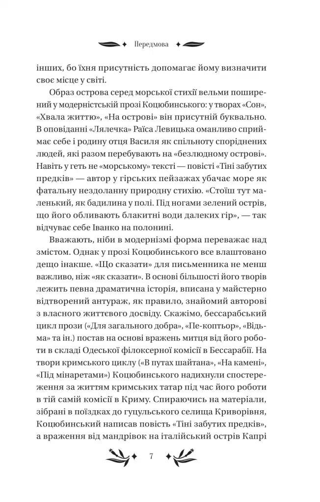 Проза Михайла Коцюбинського — це яскраві фарби й гострі драматичні конфлікти, а його життя — це сірі будні, нудна робота і служіння суспільству. Хай там де відбуваються події його творів — у Чернігові, в Карпатах чи на італійському Капрі, в центрі уваги письменника завжди особистість. Його цікавить людина-острів, яка переживає душевну драму, відмежовується від інших, прагнучи гармонії, і водночас шукає споріднену душу. Це окремий загадковий всесвіт, до таємниць якого письменник пропонує доторкнутися і, можливо, щось розгадати. Про новелу «На острові» Коцюбинський писав у листі, що в ній мусить бути «трохи сонця, моря, людей та й мене». Тож і в цій книжці є сонце, море, люди і сам автор.