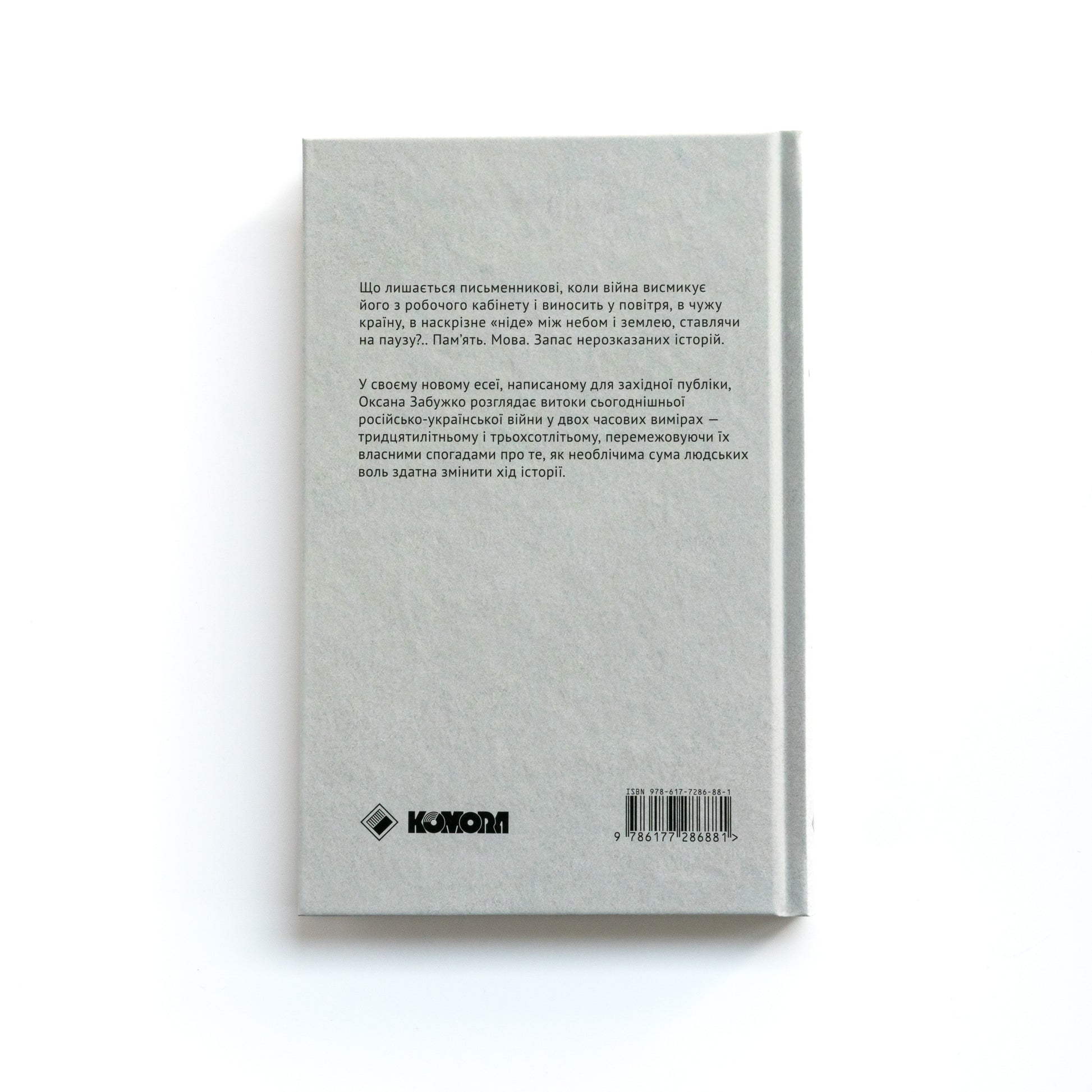 Що лишається письменникові, коли війна висмикує його з робочого кабінету і виносить у повітря, в чужу країну, в наскрізне «ніде» між небом і землею, ставлячи на паузу?.. Пам’ять. Мова. Запас нерозказаних історій.