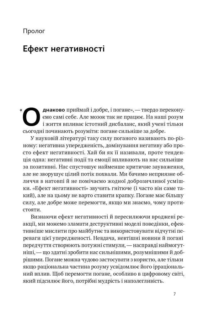 Це захопливий погляд одних із найкреативніших психологів і найяскравіших популяризаторів науки на схильність до негативізму. Книжка може пролити світло на розуміння людської природи, відновити рівновагу у світогляді й підняти настрій. Стівен Пінкер, науковець, автор бестселерів «Просвітництво сьогодні» та «Добрі янголи людської природи»