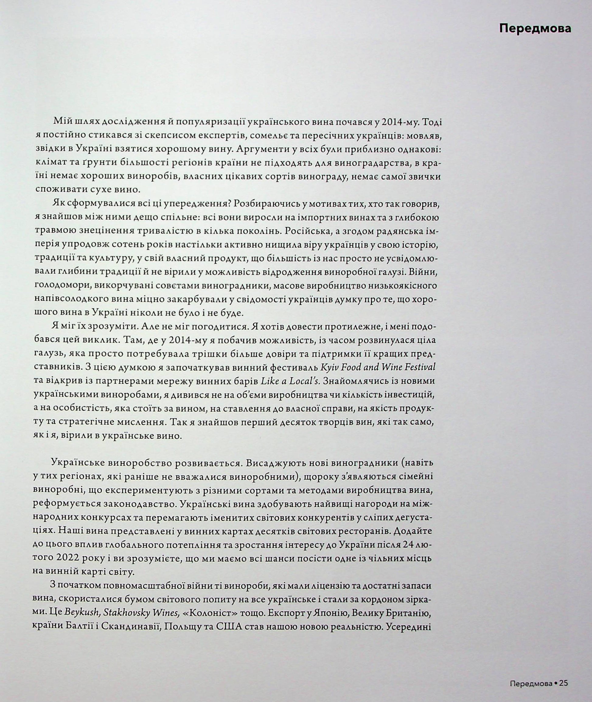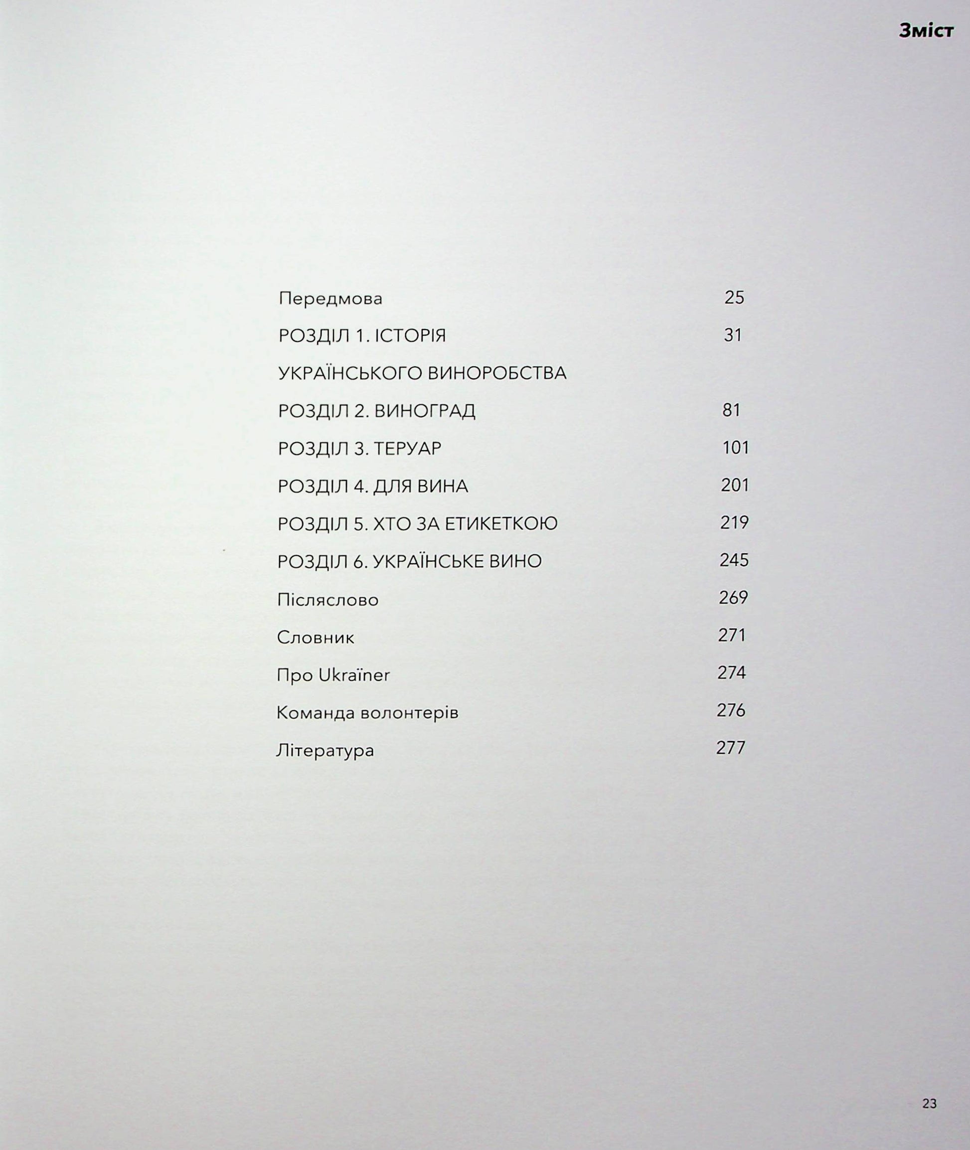 На сторінках книжки — шлях українського виноробства від давніх часів до сьогодні; розповіді про сорти винограду, що ростуть на наших теренах, винні бочки, пляшки та корки, виготовлені в Україні; бесіди з сомельє та винними експертами. Родзинкою видання є низка історій про сучасних виноробів із різних регіонів України. Ці історії зібрані в експедиції, в яку команда Ukraїner їздила разом із автором книги, засновником фестивалю Kyiv Food and Wine Festival (Brave Wine) Сергієм Клімовим, восени 2022 року.
