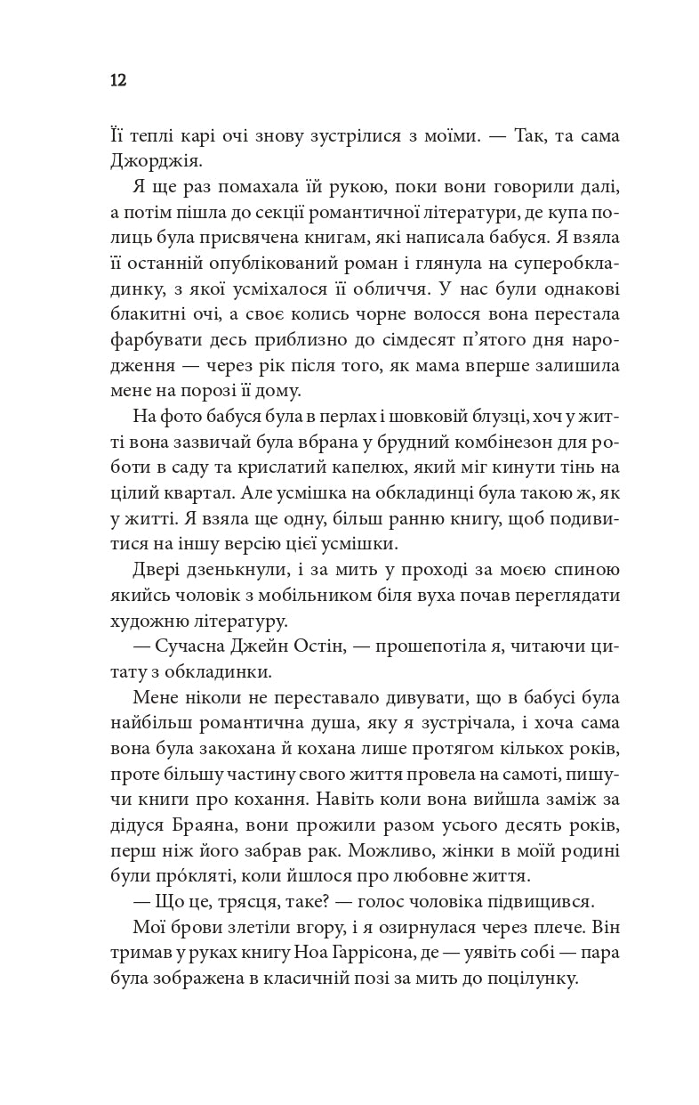 Після складного розлучення Джорджія втратила майже все - будинок, друзів, власну гордість і віру в кохання. Повернувшись у маєток покійної прабабусі, відомої письменниці, вона опиняється віч-на-віч із Ноа Гаррісоном, автором бестселерів про кохання. Саме він має дописати останній роман її прабабусі. Та кандидатура цього зарозумілого улюбленця долі зовсім не влаштовує Джорджію! Ноа теж не в захваті. Придумати гідний фінал для роману легендарної авторки - це одне, а ось мати справу з її вродливою, впертою, цинічною правнучкою - зовсім інше. Повітря між ними іскрить від напруги! Однак листи прабабусі змушують Джорджію інакше поглянути на Ноа...