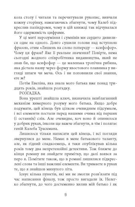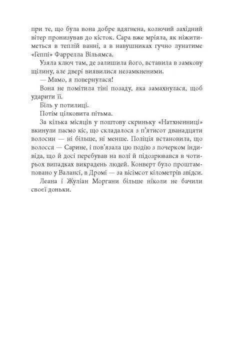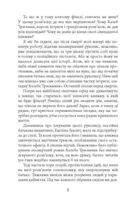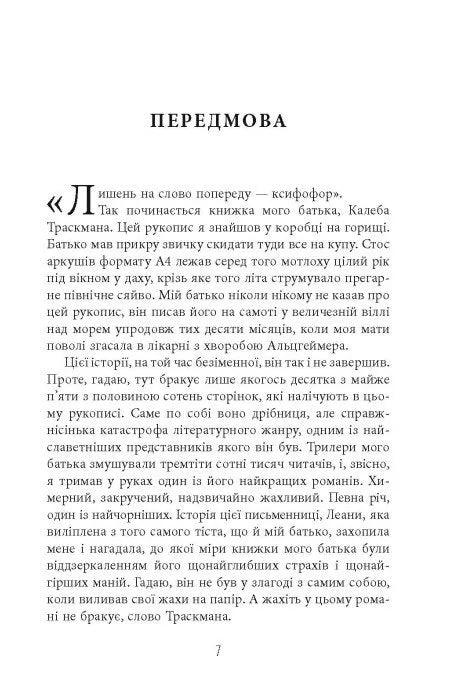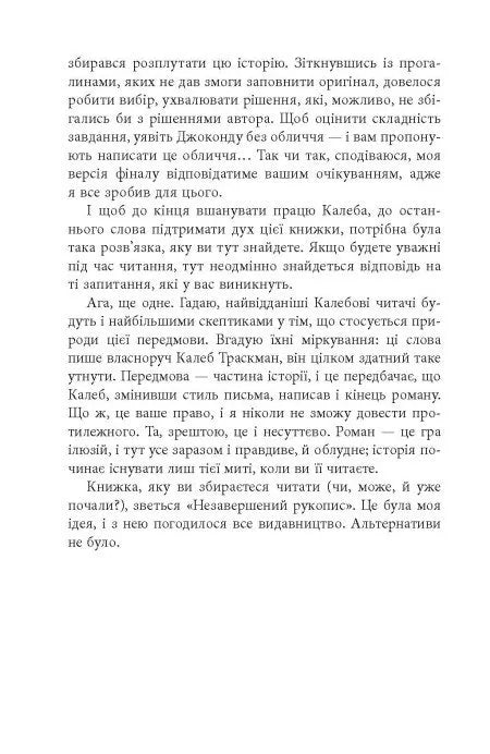 Рукопис без фіналу, труп без обличчя, запитання без відповідей. На околицях Гренобля сталася дорожня аварія: юнак, утікаючи від митників, урізався в балюстраду і загинув. Поліціянти, приїхавши на місце пригоди, виявили в багажнику тіло дівчини. Без обличчя і рук. Тим часом Леана Морган, скромна вчителька, яка стала королевою трилера, через чотири роки після зникнення її дочки, отримує телефонний дзвінок. Її чоловік Жуліан у лікарні з травмою голови: на нього напали. Ба більше, він утратив пам’ять. Він, хто не кидав пошуків і до останнього вірив, що Сара жива. Леані доведеться самотужки розплутувати клубок зловісних загадок.«Незавершений рукопис» — перший роман Франка Тільє з трилогії про Калеба Траскмана. Уперше українською.